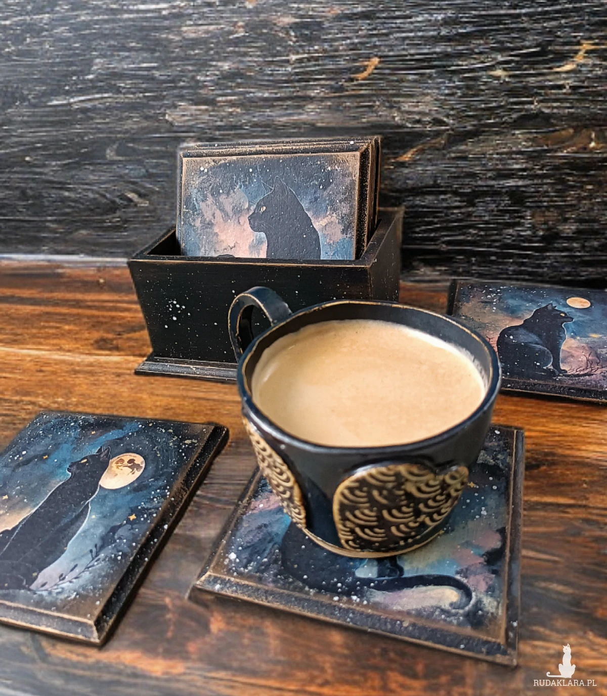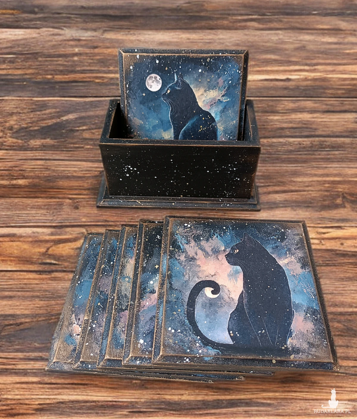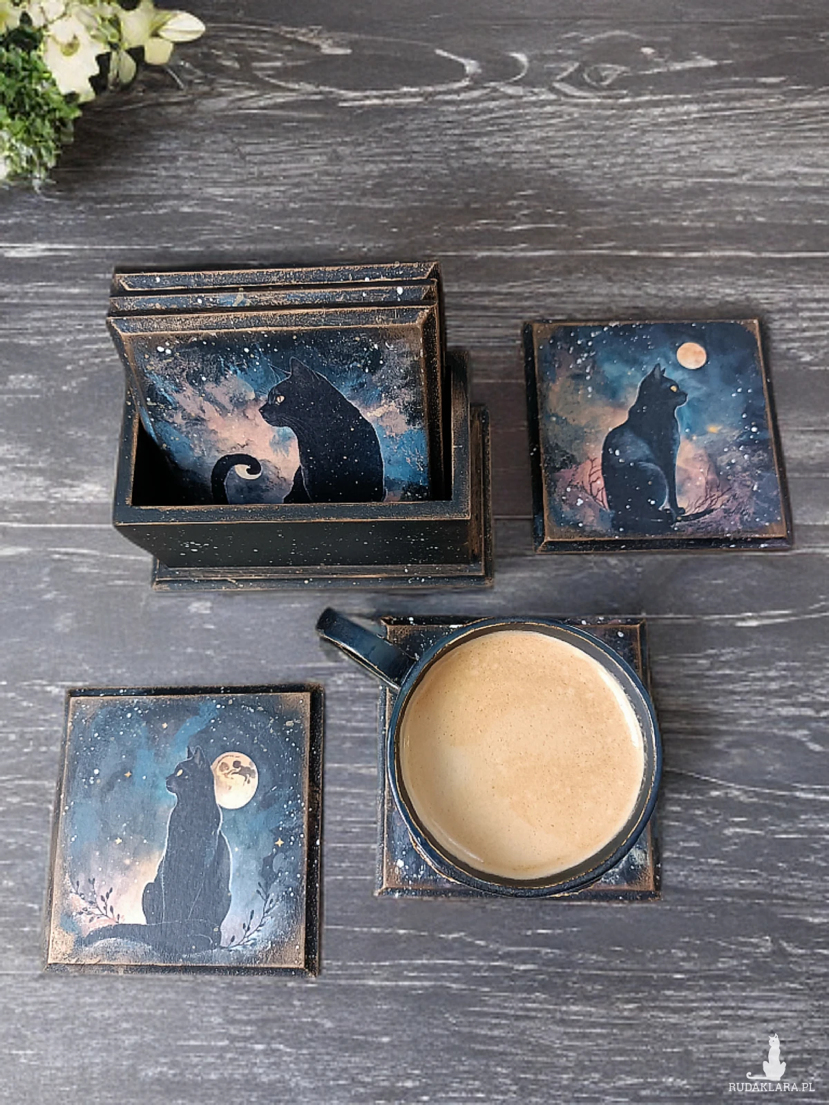 Wyjątkowy zestaw podkładek z motywem kotów w nocnej, magicznej odsłonie. Ozdobiony za pomocą techniki decoupage.