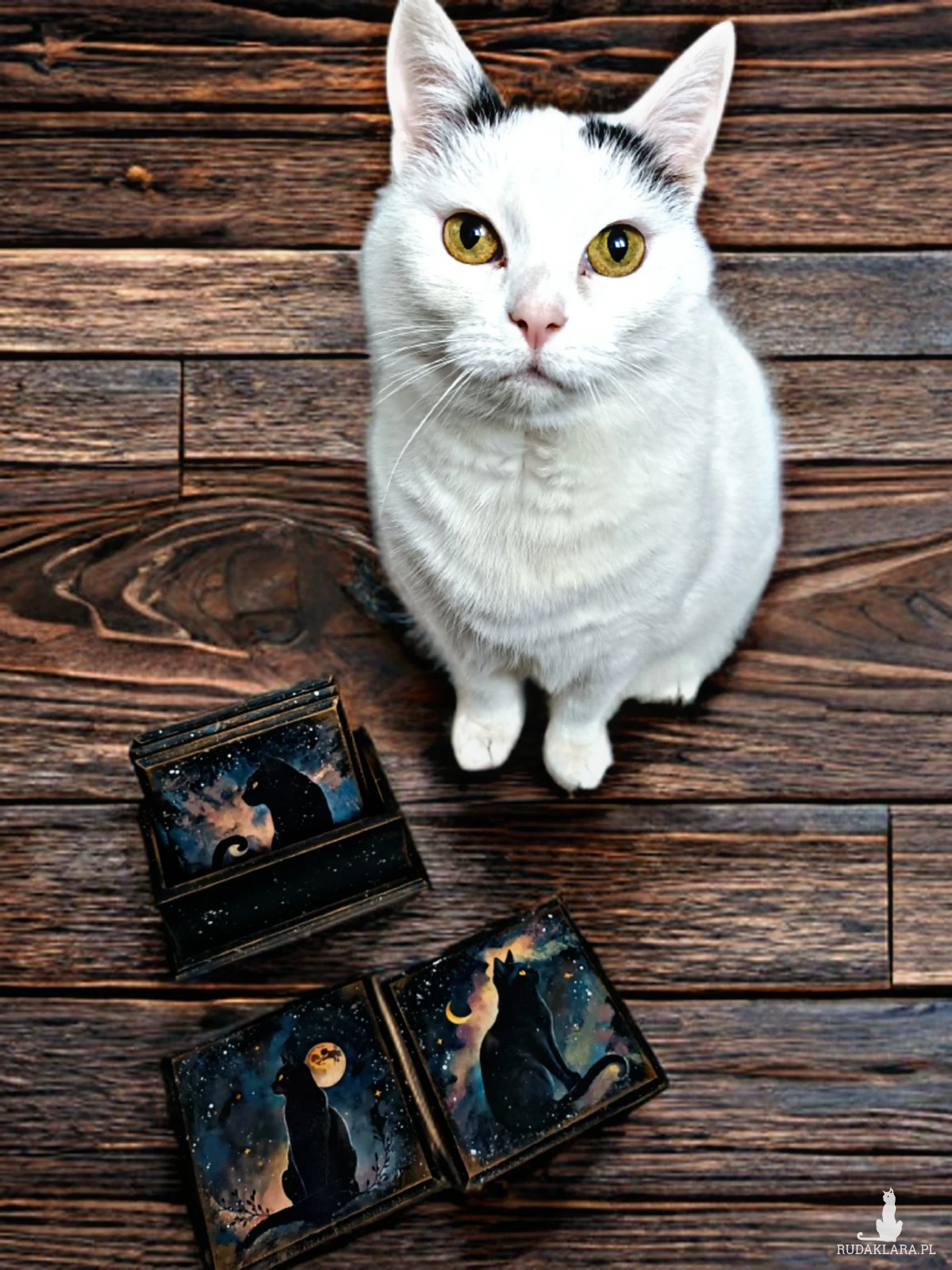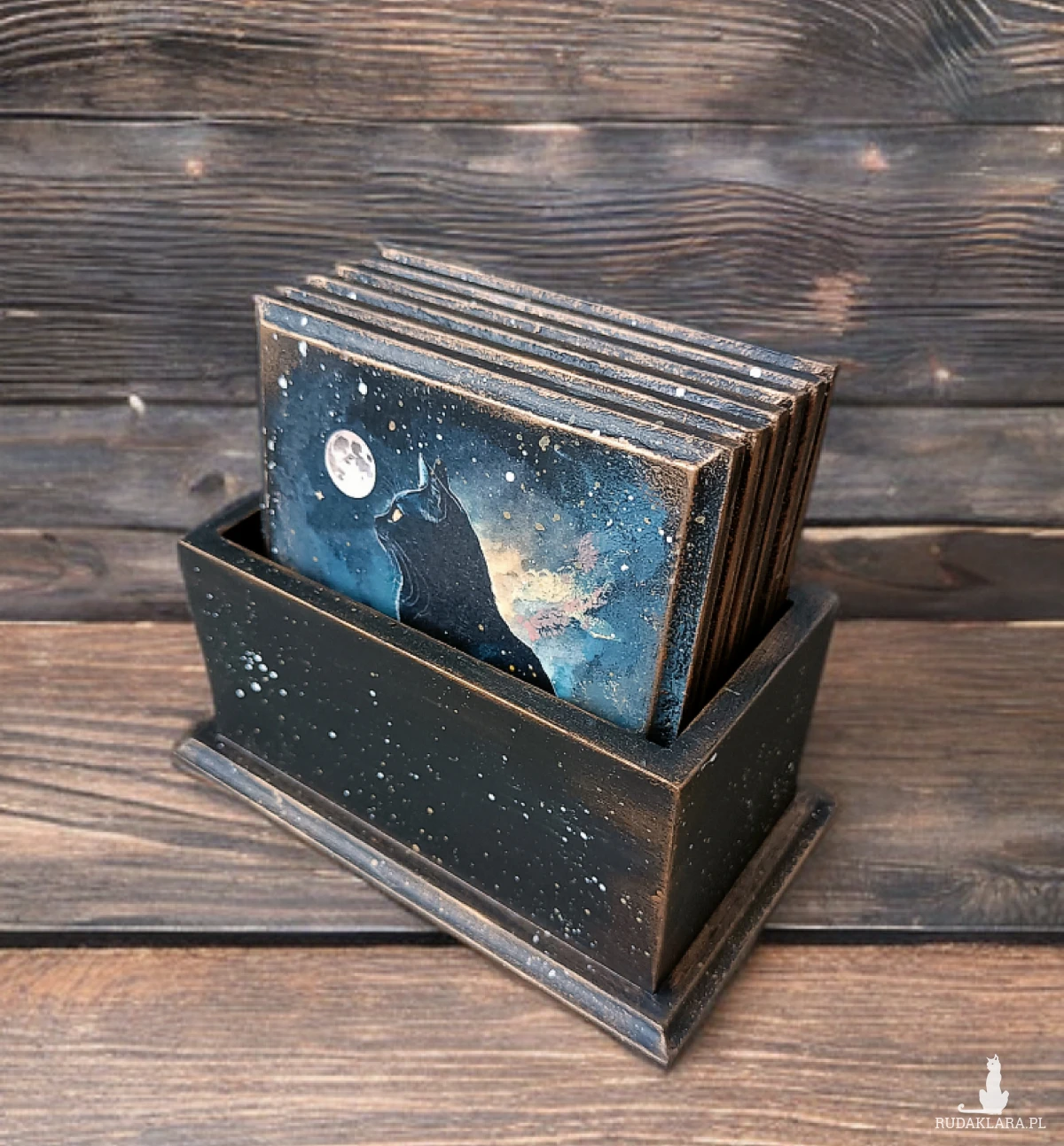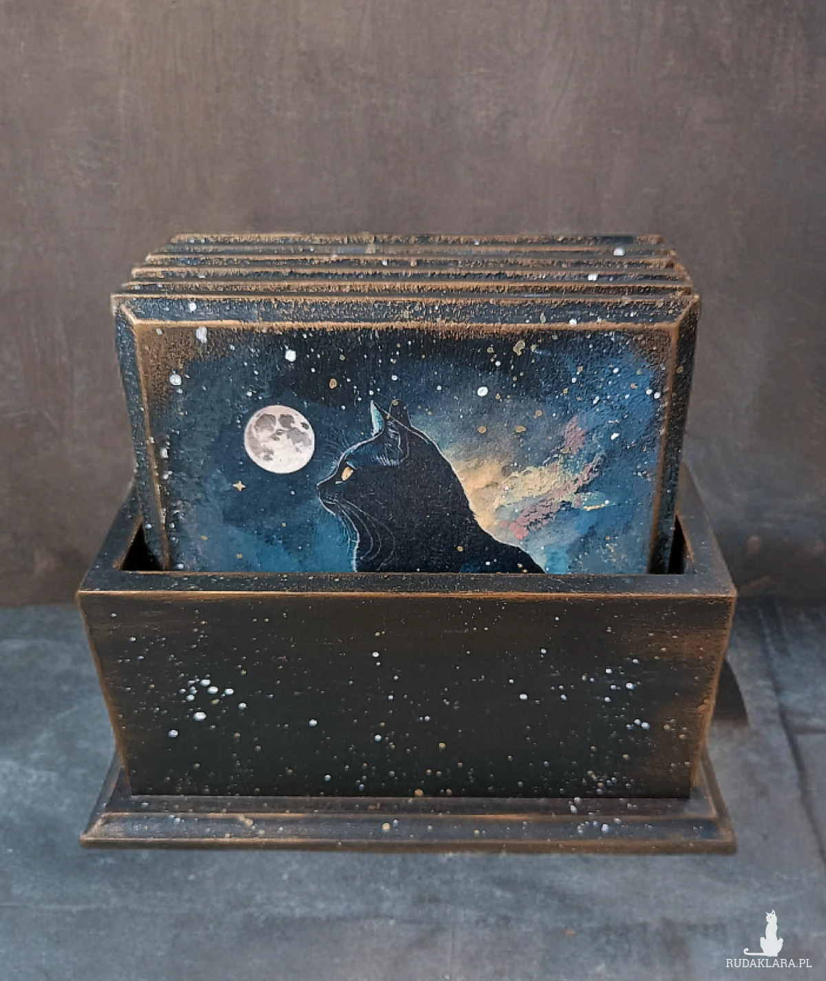 Wyjątkowy zestaw podkładek z motywem kotów w nocnej, magicznej odsłonie. Ozdobiony za pomocą techniki decoupage.
