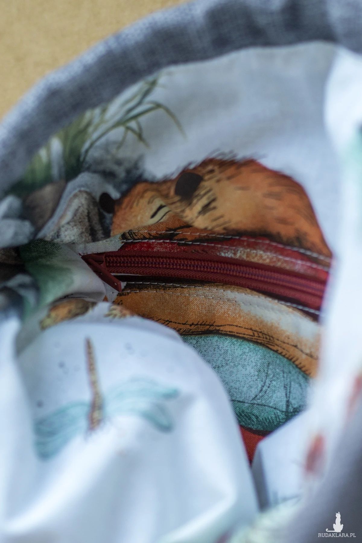W środku plecak posiada kieszeń zapinaną na suwak. Wykończony jest bawełnianą podszewkę w kapibary.