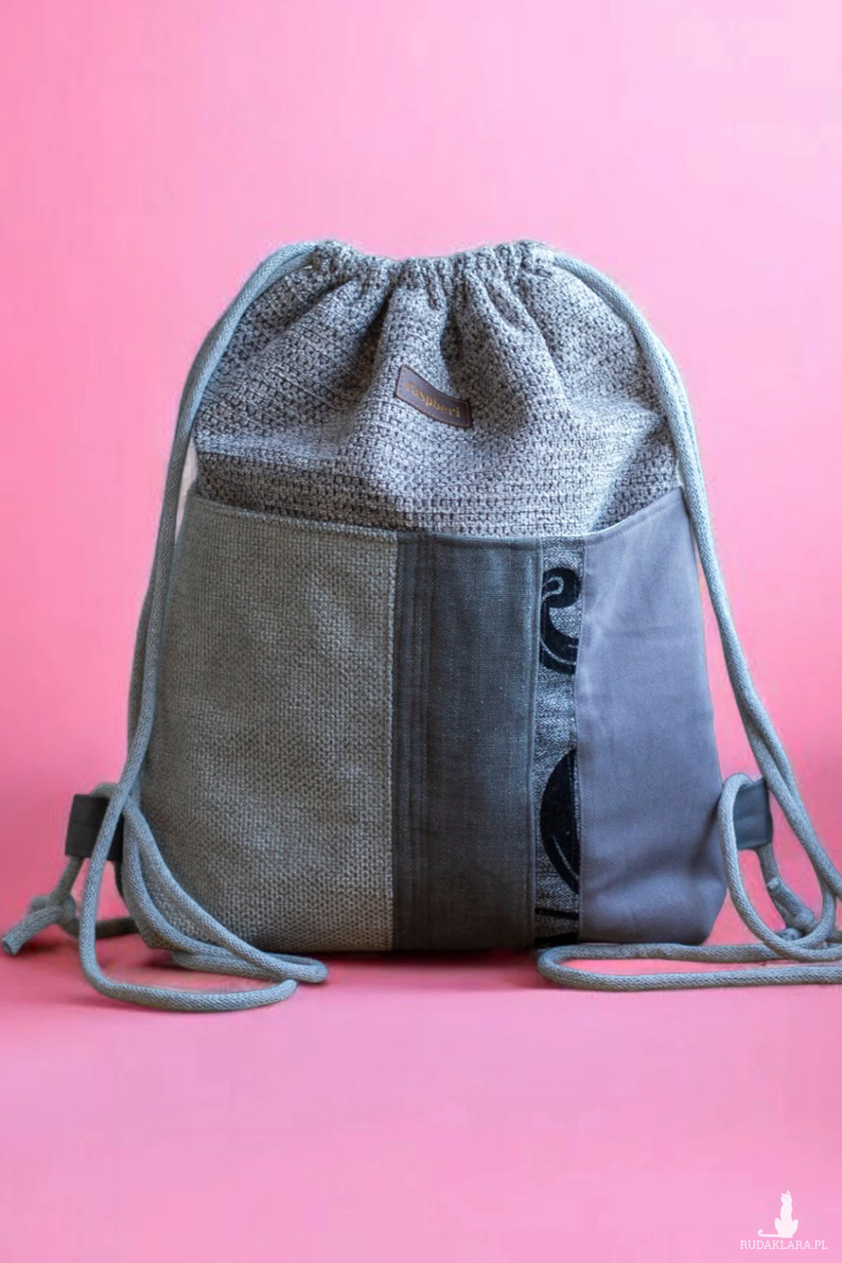 Workoplecak z plecionej tkaniny w kolorze szarym.