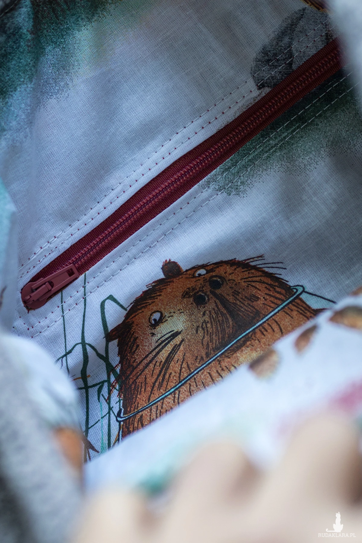 W środku plecak posiada kieszeń zapinaną na suwak. Wykończony jest bawełnianą podszewkę w kapibary.