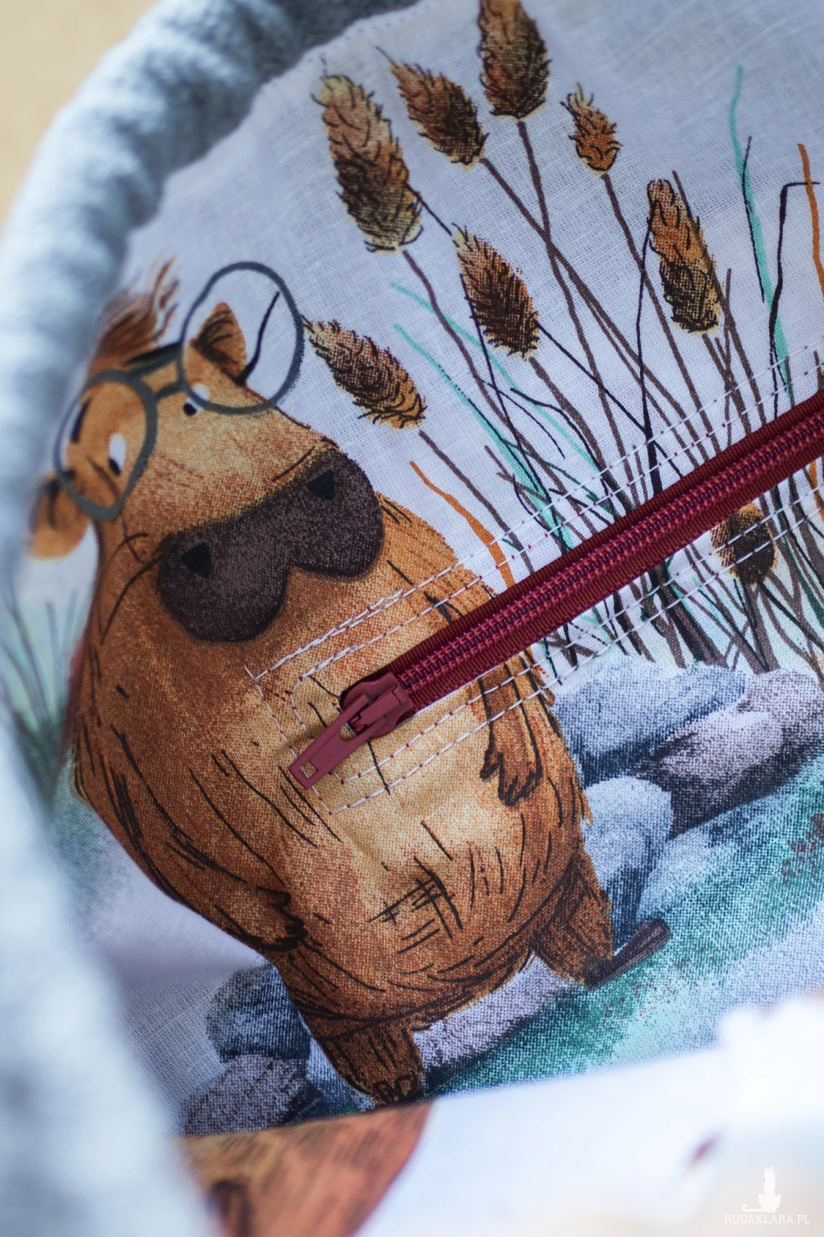 W środku plecak posiada kieszeń zapinaną na suwak. Wykończony jest bawełnianą podszewkę w kapibary.