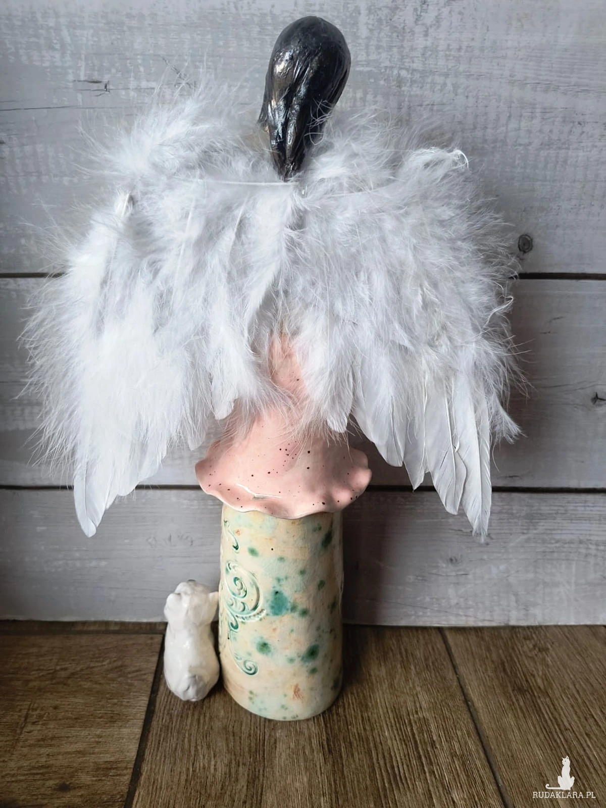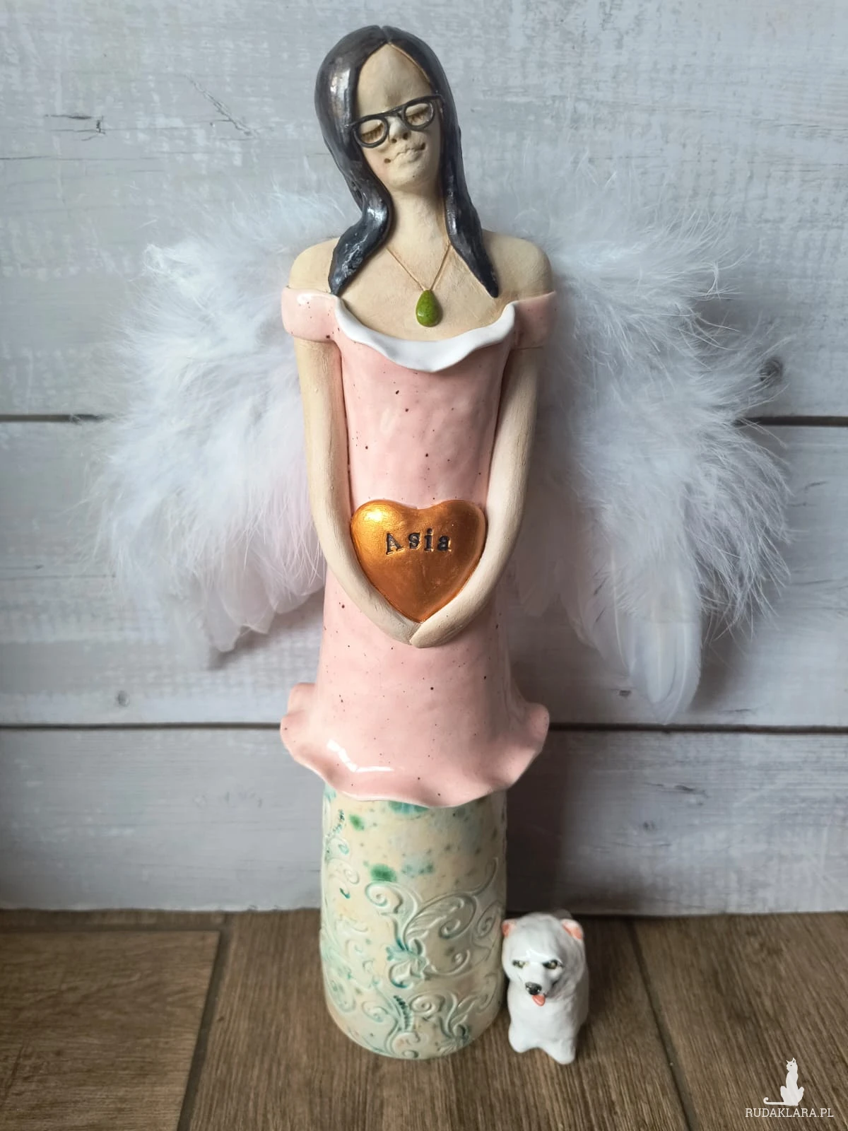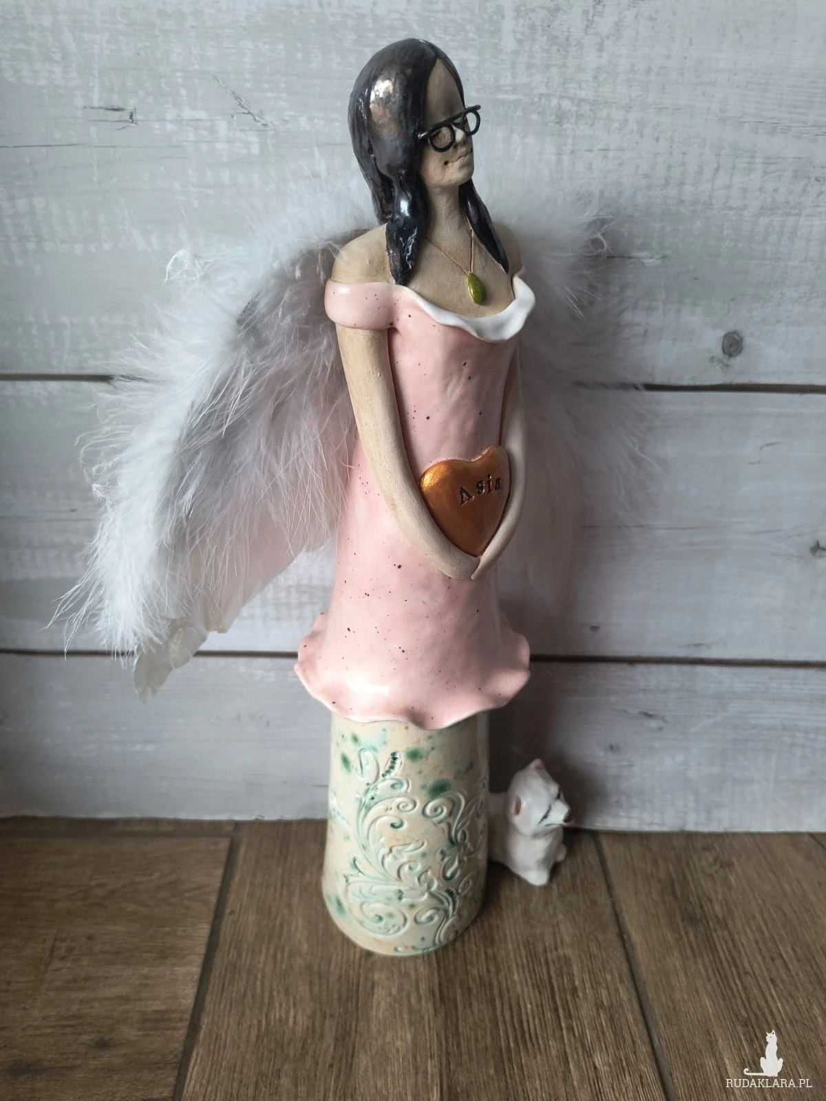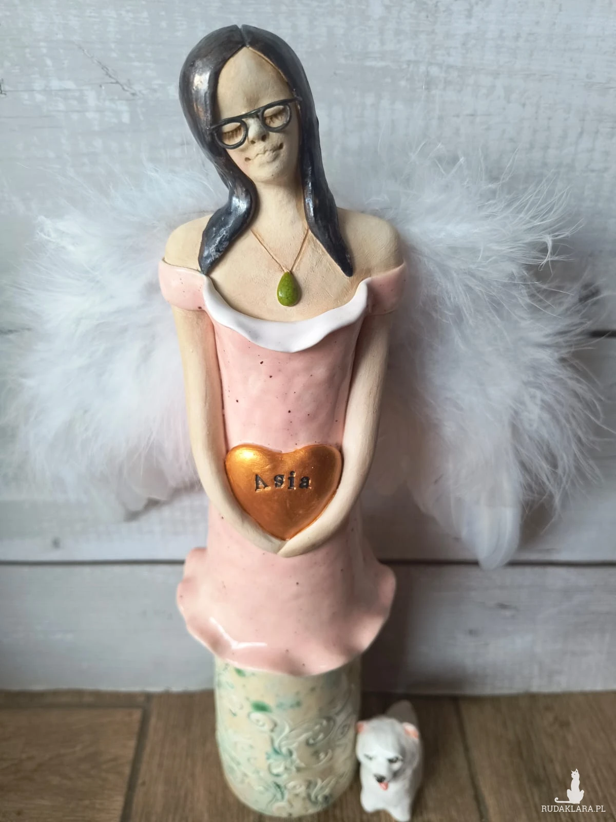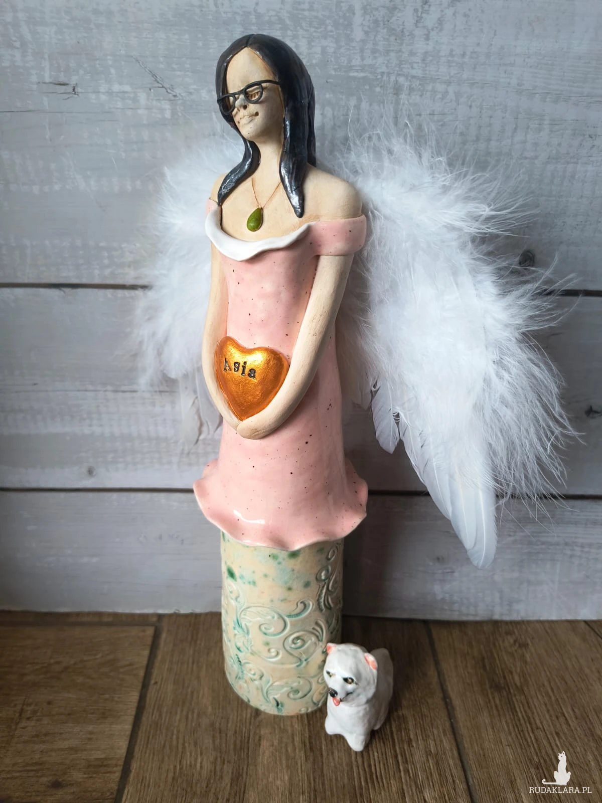 Anioł ceramiczny wykonany z gliny szamotowej, wypalony na biskwit, a następnie szkliwiony w temperaturze 1260 stopni C. Wysokość ok 35 cm. Idealny jako prezent okolicznościowy lub do ozdoby domu. Serdecznie polecam! Czas oczekiwania na realizację ok 2 tygodni, a w czasie wzmożonej sprzedaży lub przy większych zamówieniach do 30 dni roboczych. W uwagach dla artysty, proszę o podanie imienia.