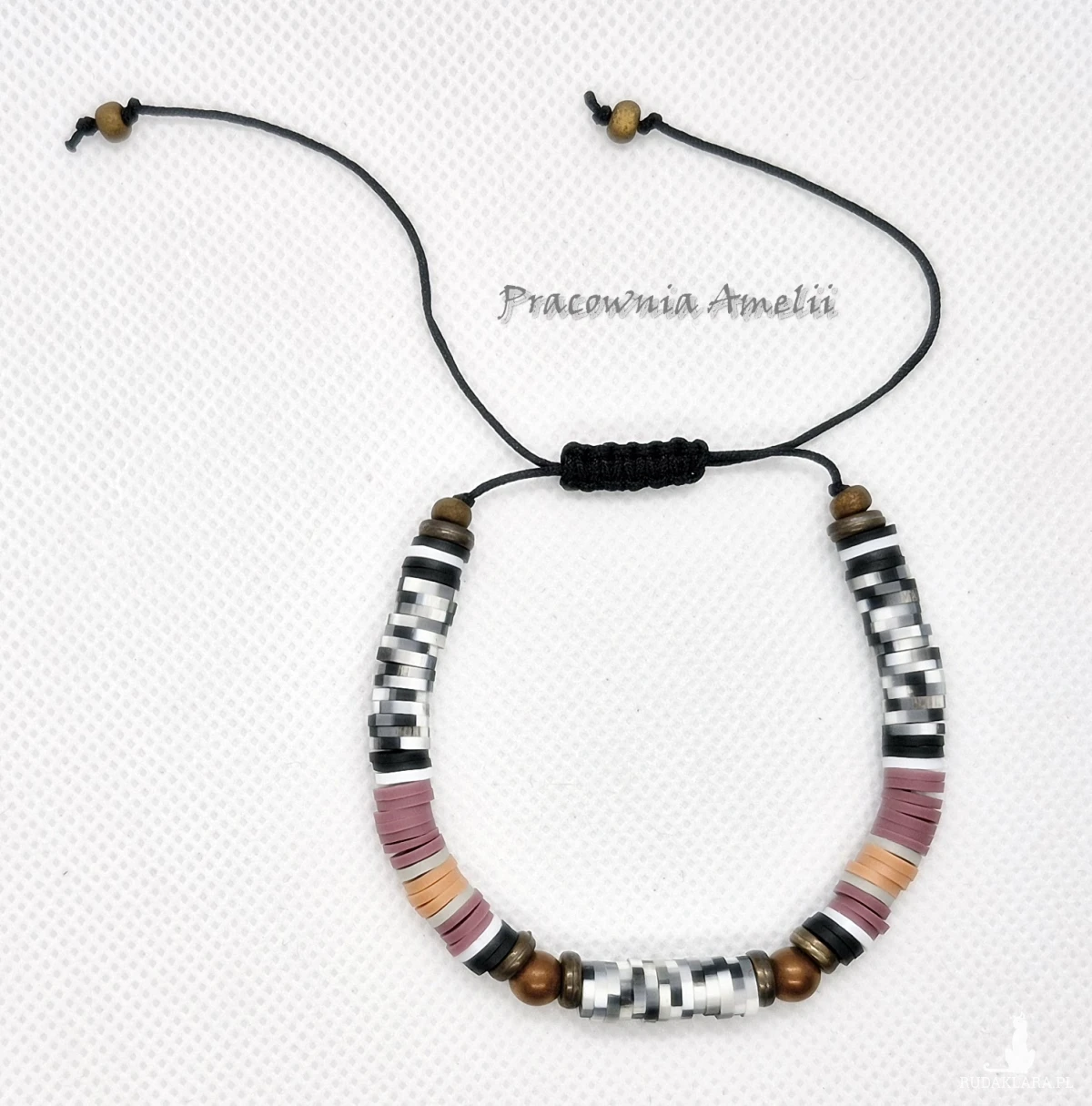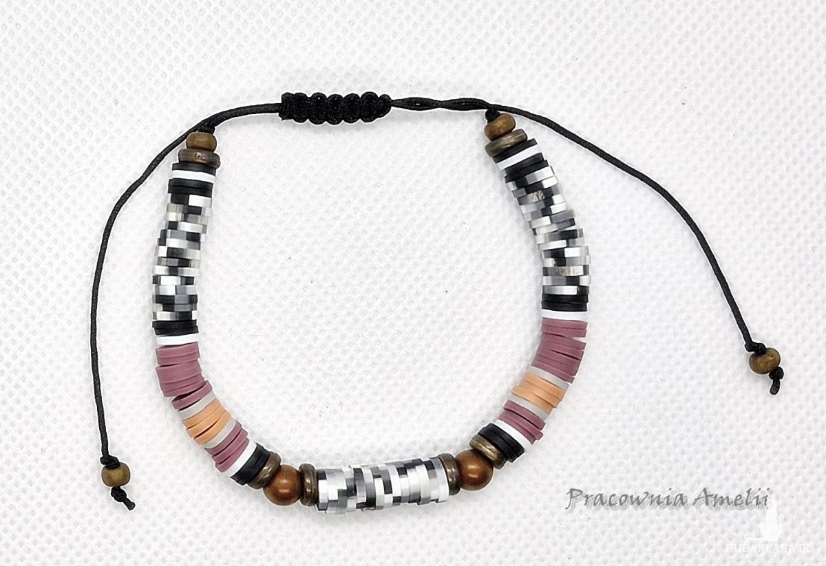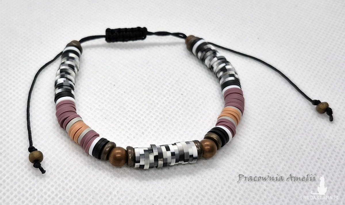 Bransoletka na czarnym sznurku nylonowym z dodatkiem kulek hematytu platerowanego (miedź mat) i koralików katsuki oraz szklanych koralików i elementów akrylowych. Rozmiar uniwersalny. Po całkowitym zaciśnięciu ok. 15-16 cm.