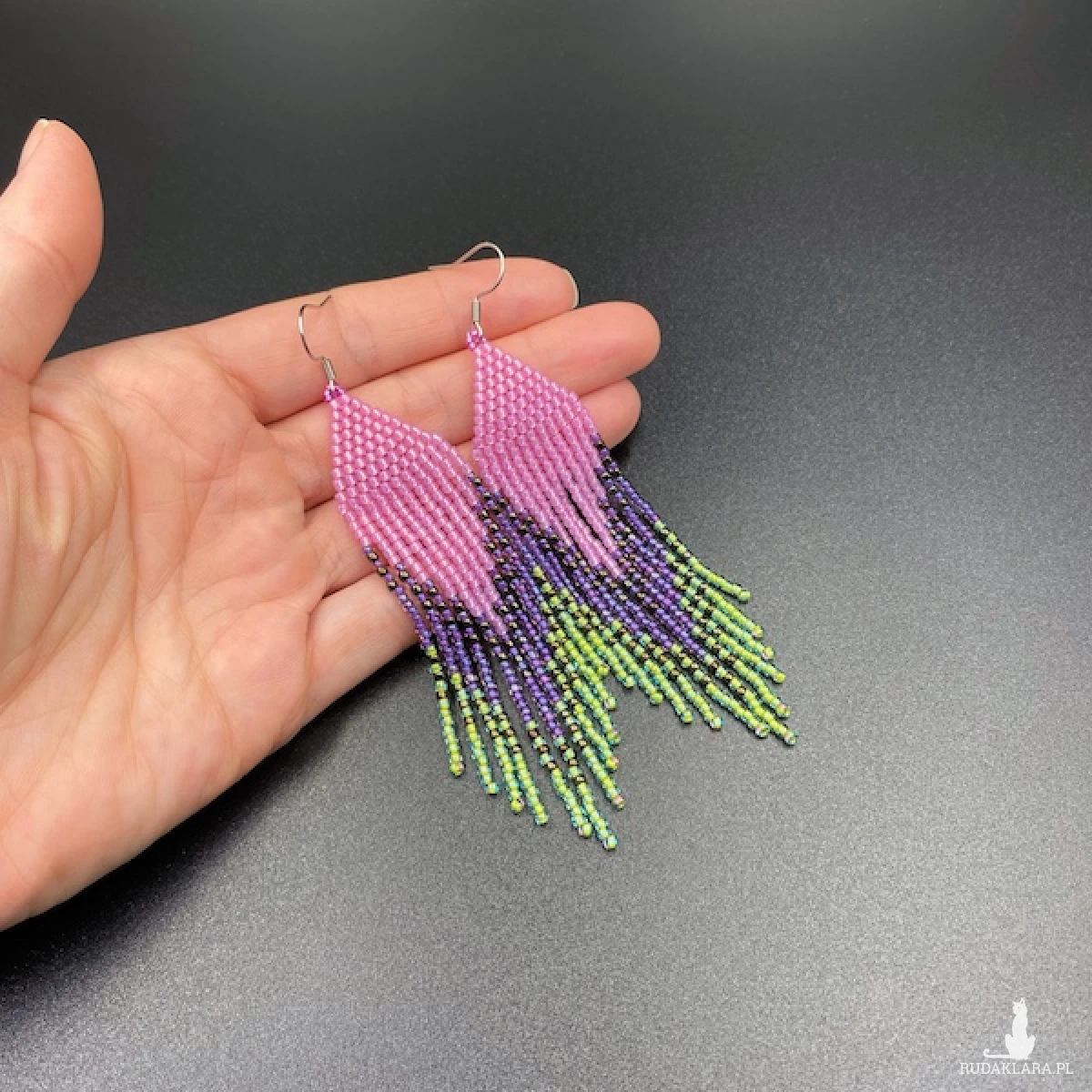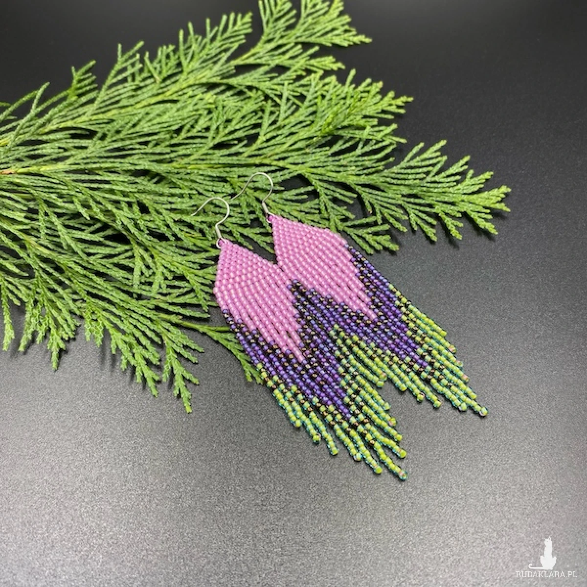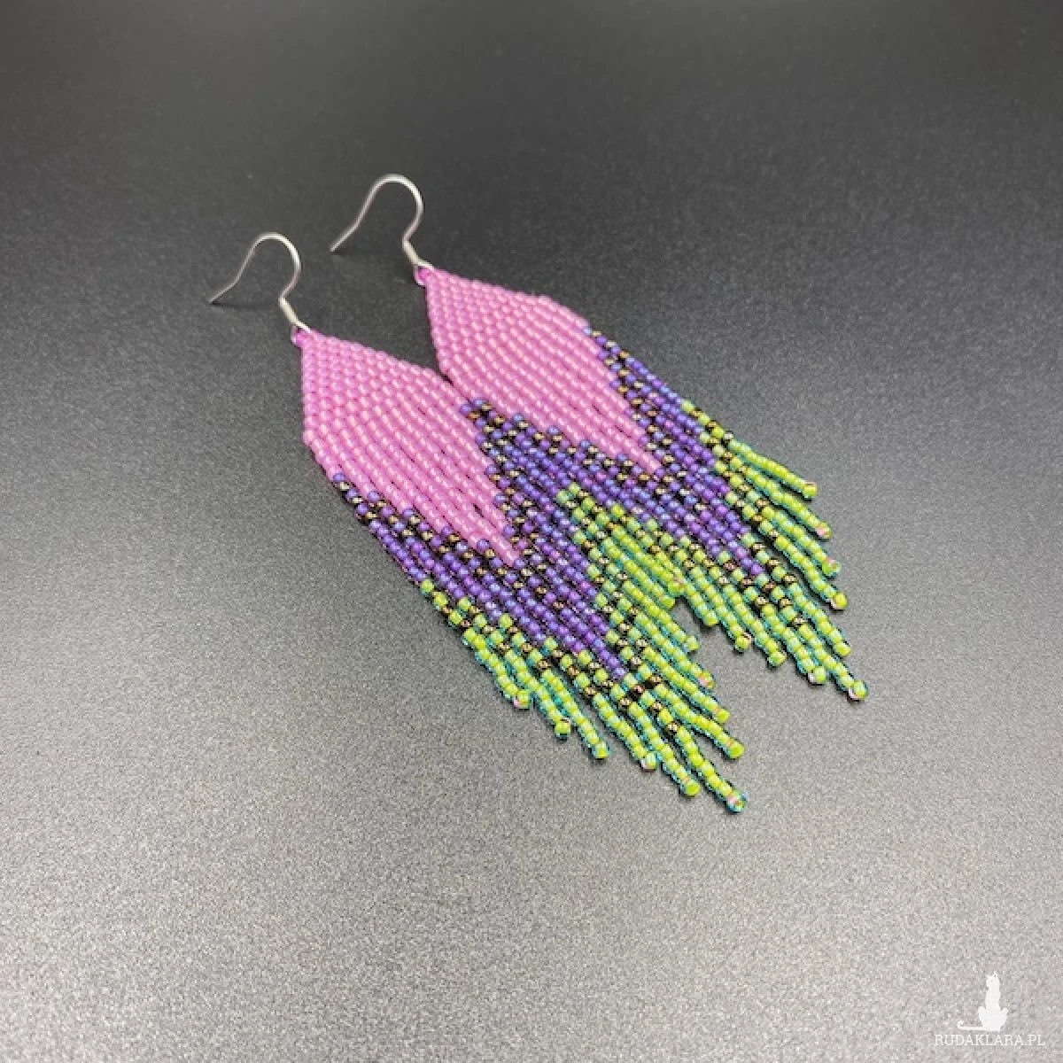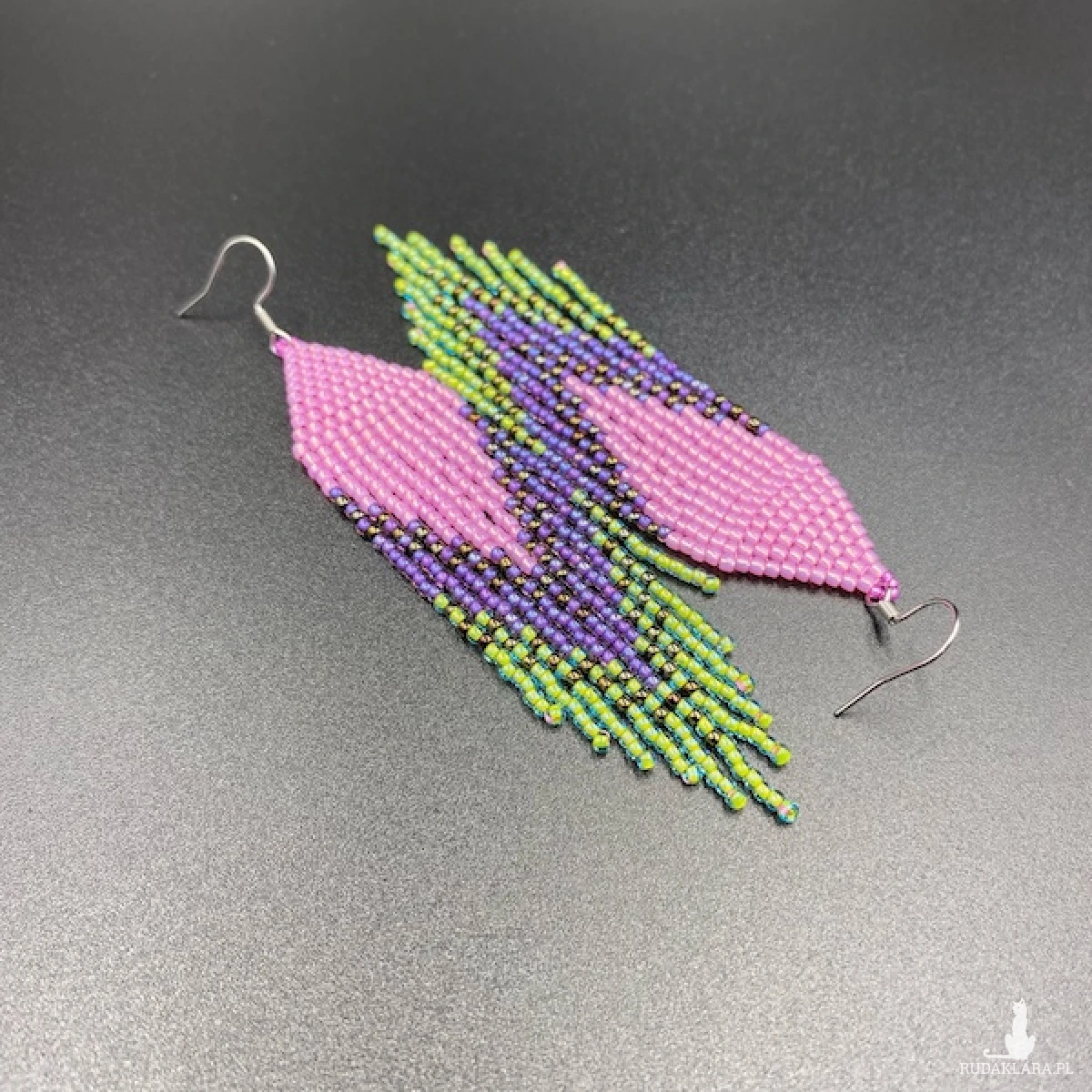 Kolory kolczyków: różowy, fioletowy, jasny zielony, odrobina metalicznego brązu.
