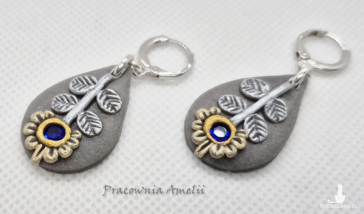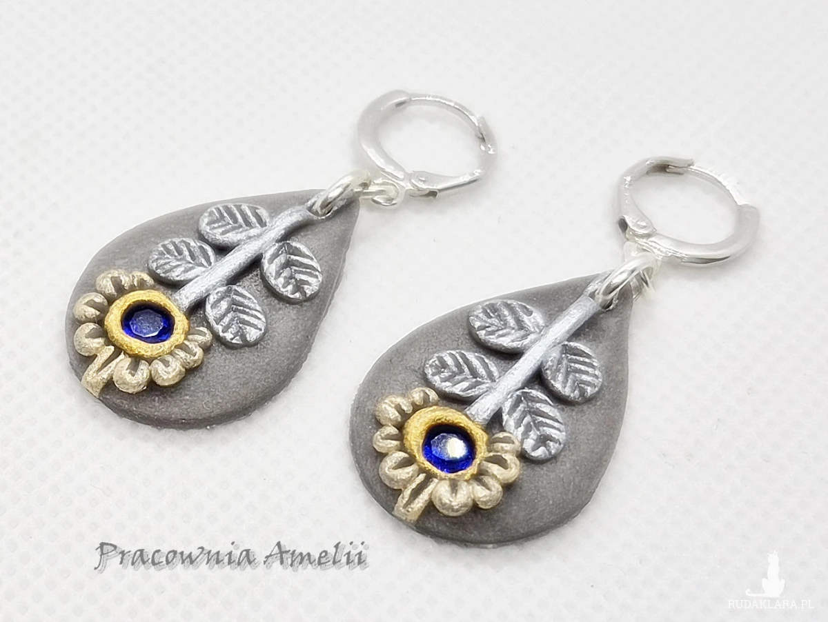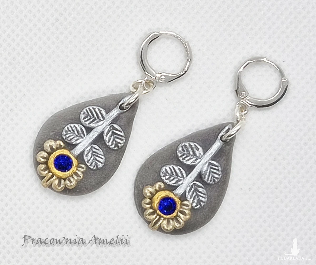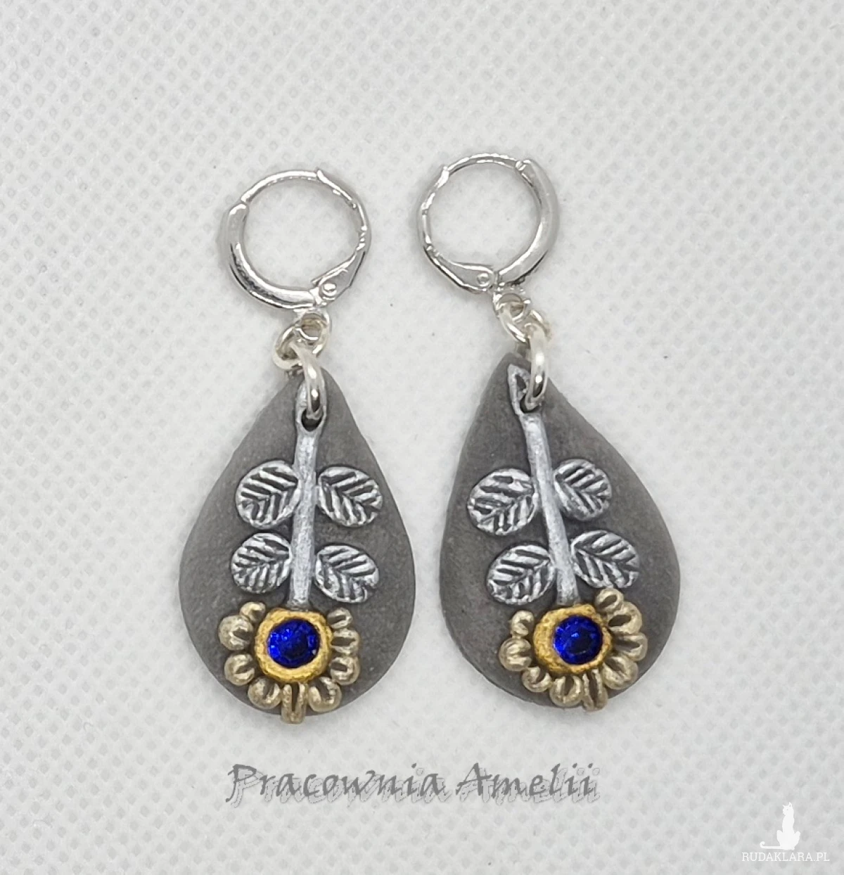 Urocze kolczyki w kształcie łezki z motywem kwiatka ze szklanym oczkiem; wykonane z gliny polimerowej na posrebrzanych biglach zamkniętych typu kajdanki. Projekt własny. Kolczyki wykonane tylko w jednym egzemplarzu, lekkie - nie obciążają ucha. Biżuteria z gliny polimerowej jest trwała i uniwersalna. Idealna na oryginalny prezent w atrakcyjnej cenie ;)