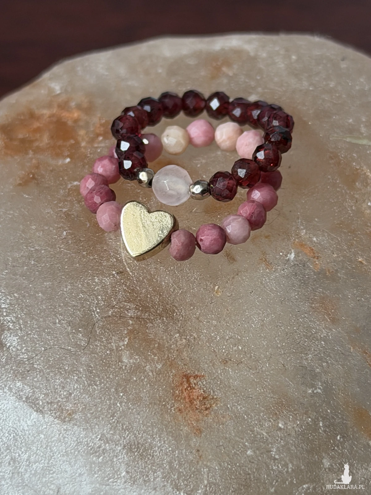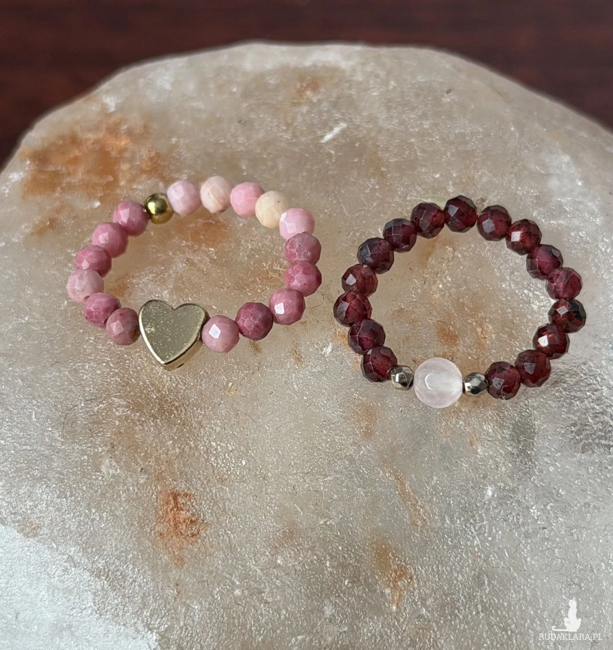 Zestaw dwóch pierścionków elastycznych na gumce. Kamienie naturalne: granat, kwarc różowy, rodochrozyt.