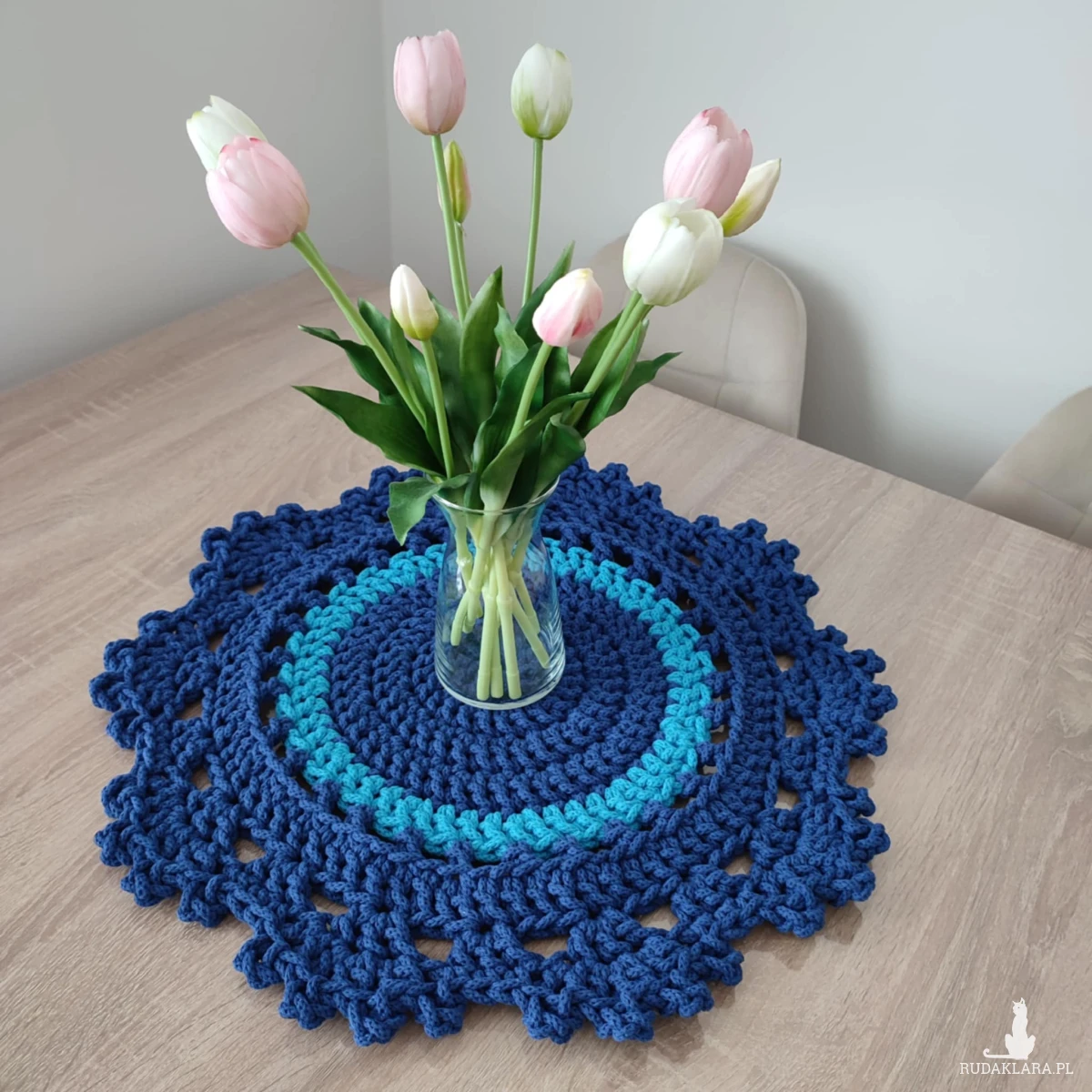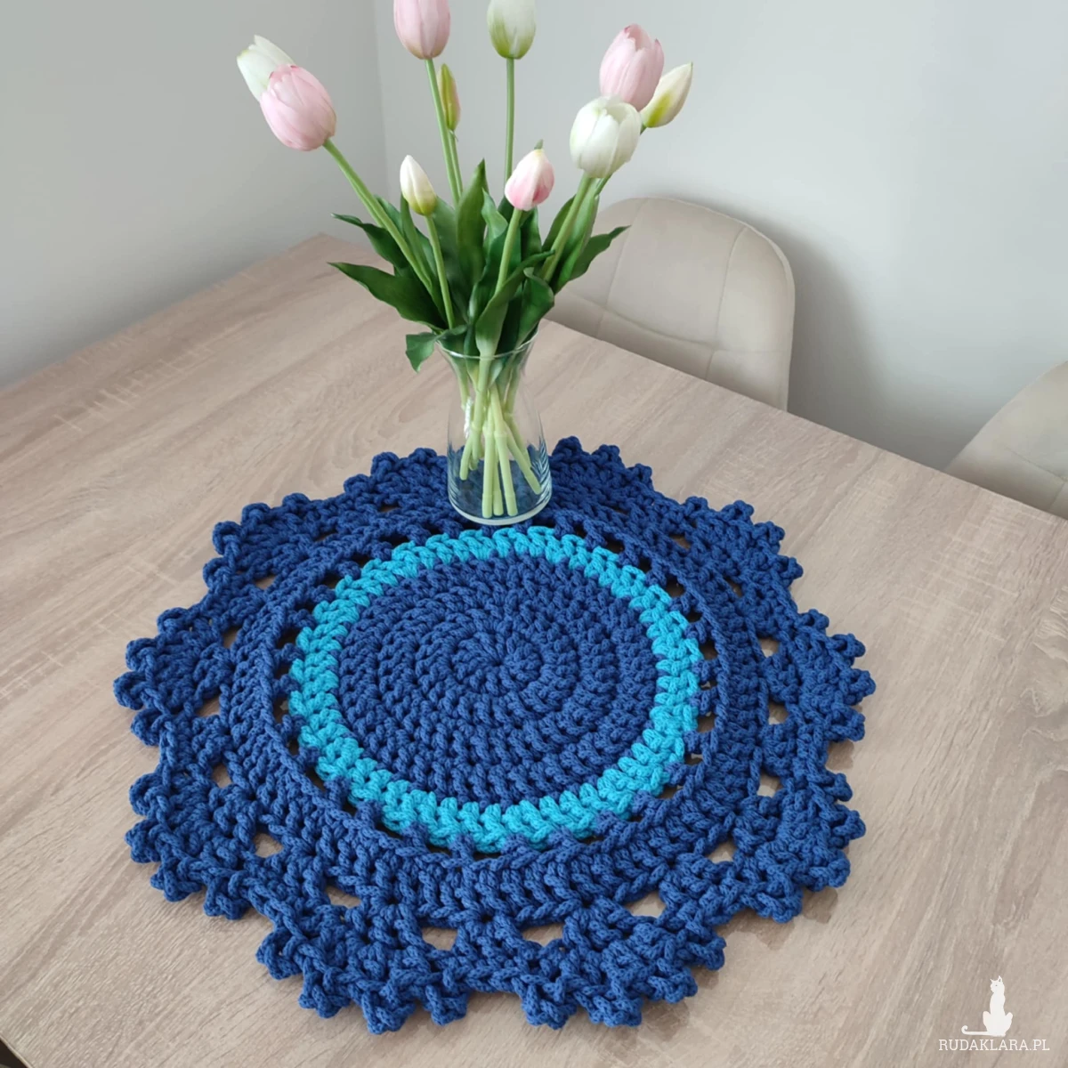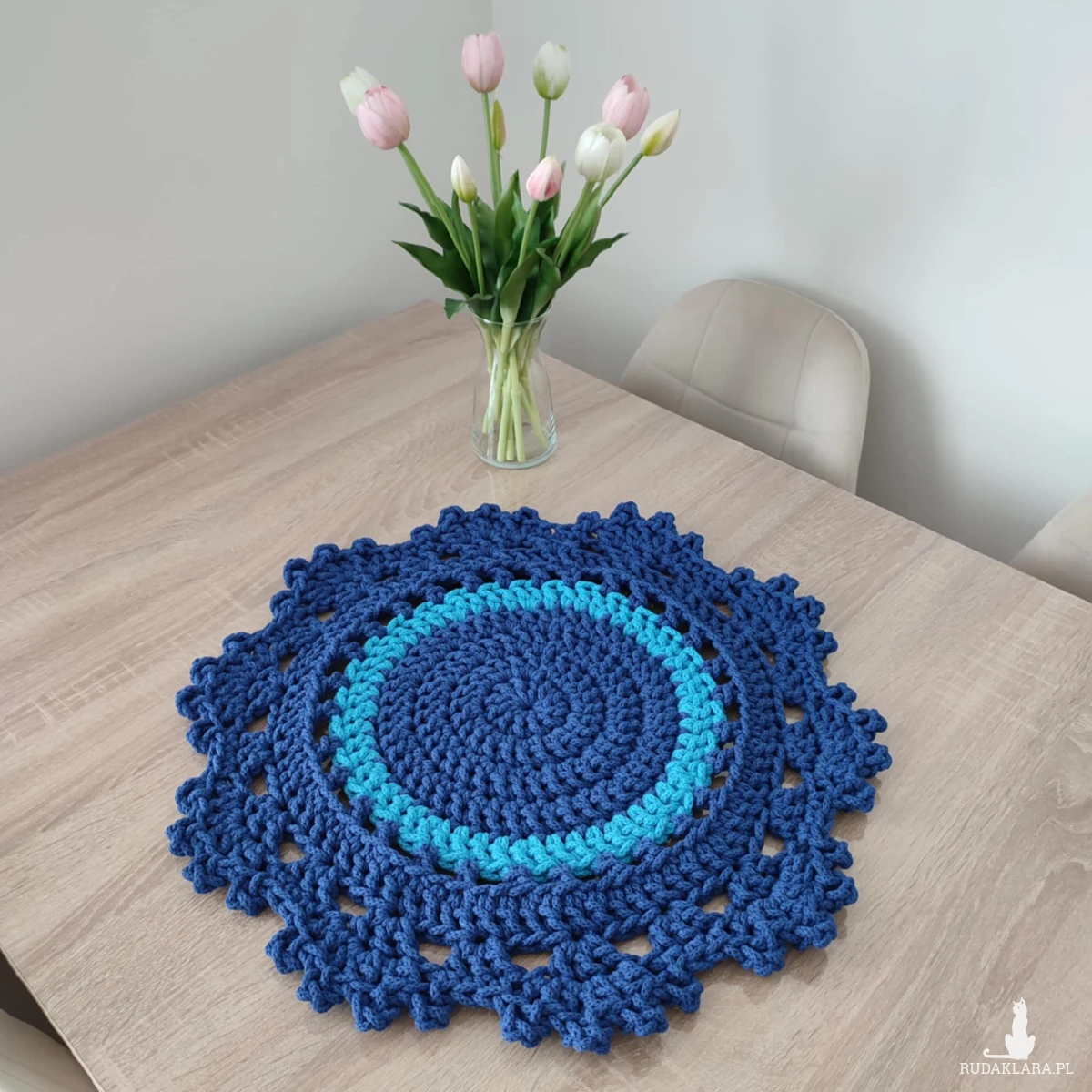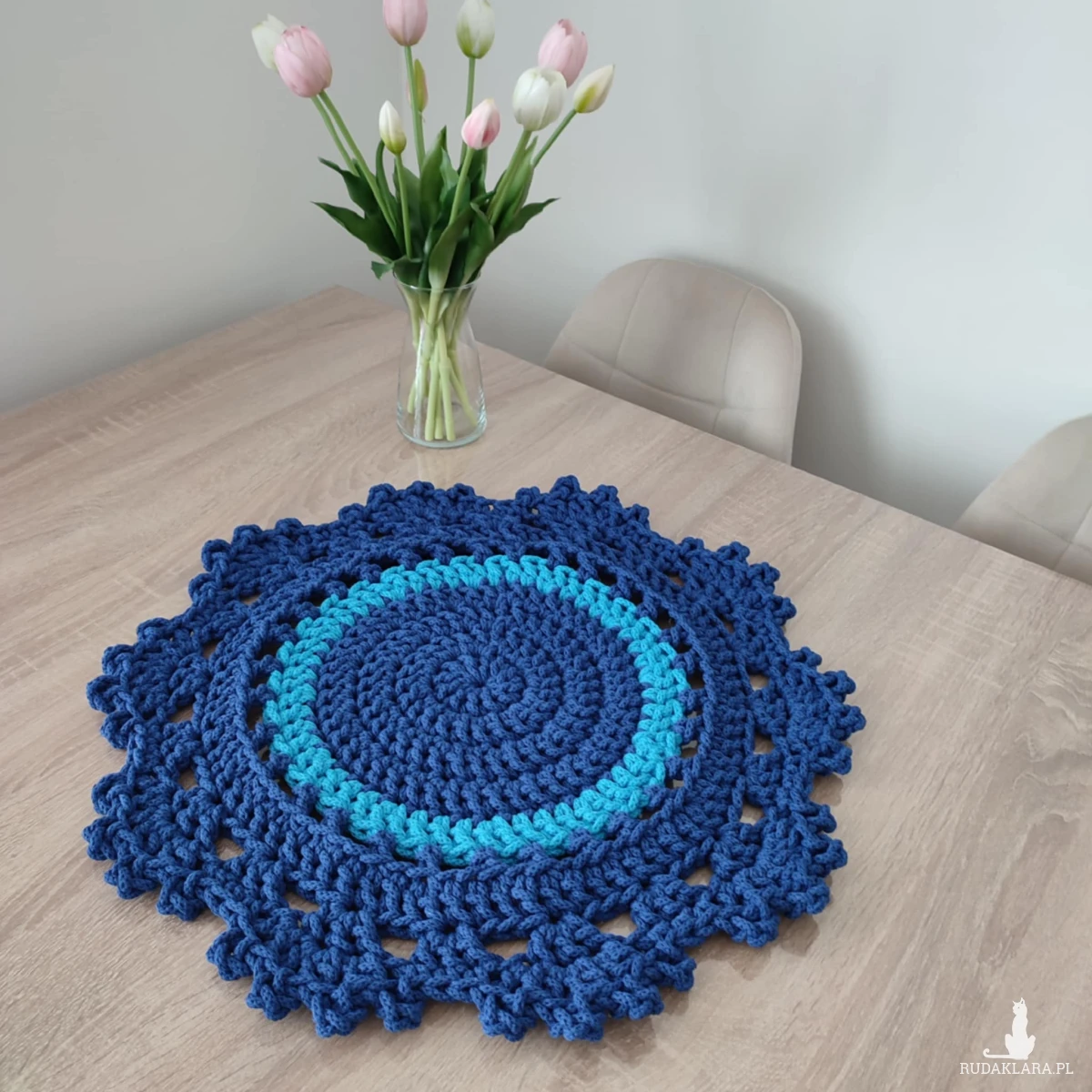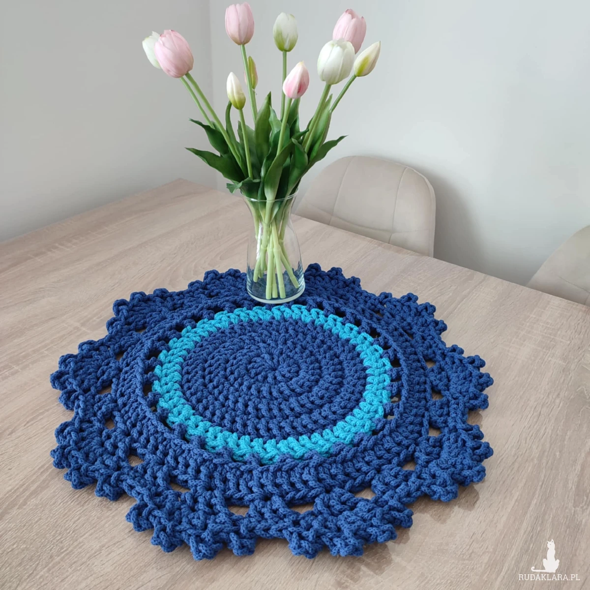 Podkładka o średnicy 50cm, wykonana metodą szydełkowania z polskiego sznurka bawełnianego 5mm.