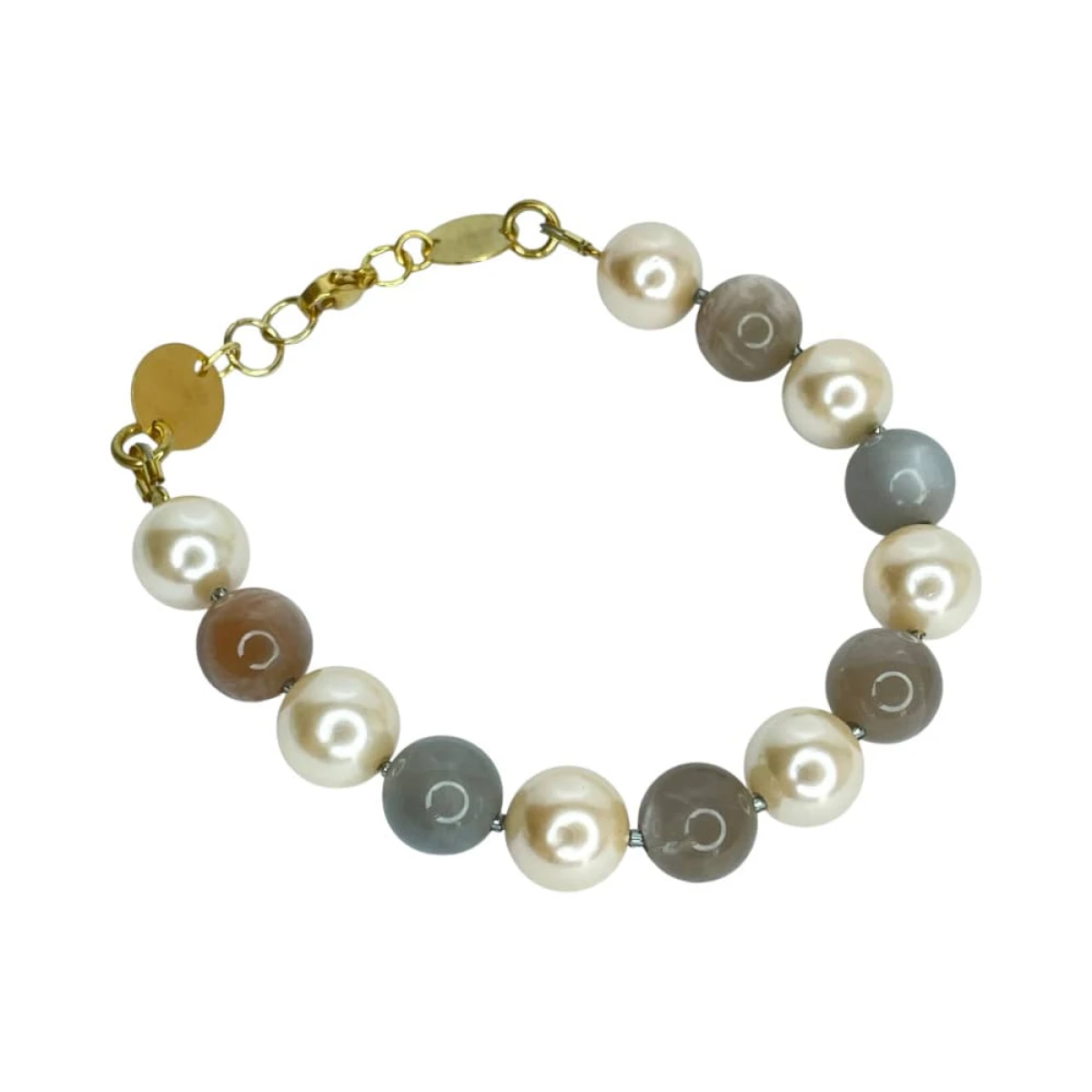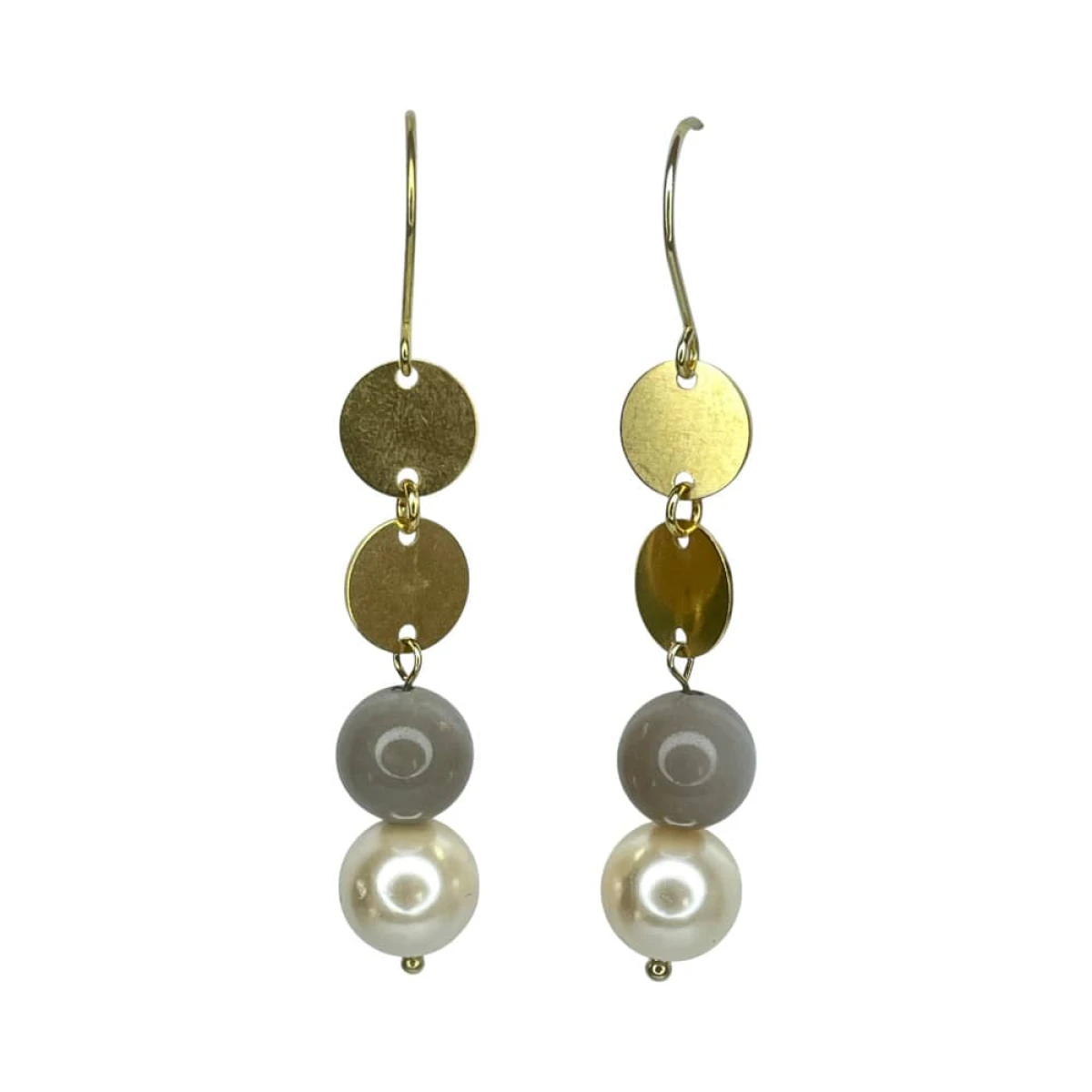 Materiał: perła Majorka, kamień księżycowy, kamień słoneczny, stal pozłacana, mosiądz pozłacany