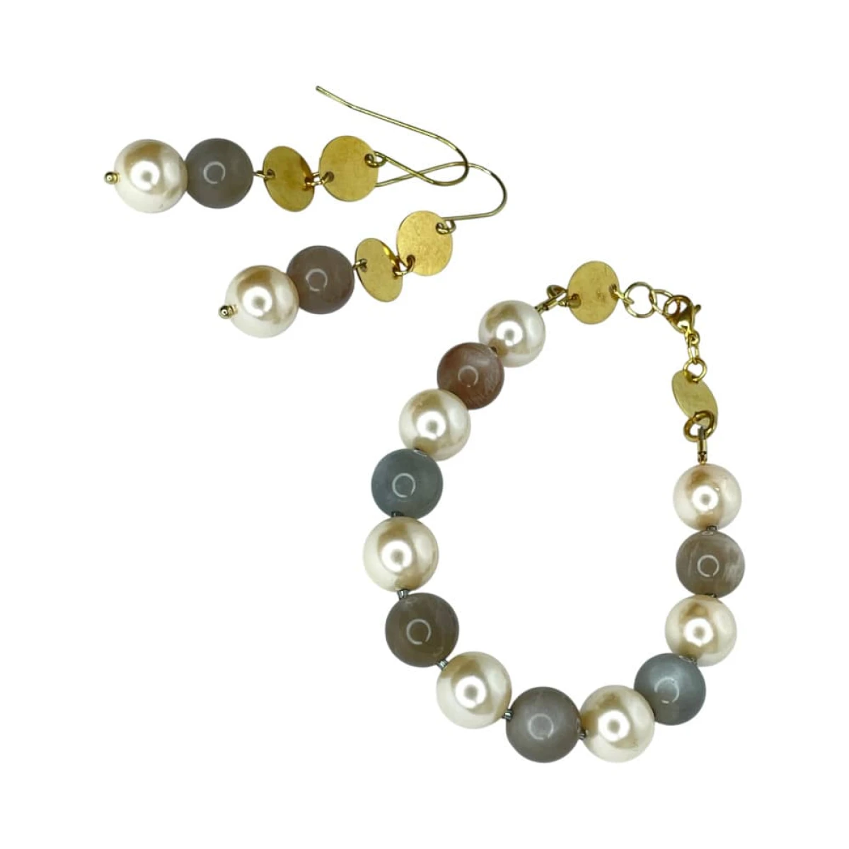 Komplet z kamieniem księżycowym i kamieniem słonecznym z kolekcji „Morskie szepty pereł” tworzy harmonijną, dopracowaną kompozycję, w której kolczyki i bransoletka wzajemnie się uzupełniają. Perły wnoszą klasyczną, kobiecą subtelność, kamień księżycowy dodaje chłodnej, delikatnej poświaty, a kamień słoneczny ociepla całość subtelnym, złotawym refleksem, budując naturalną równowagę barw. Złocone elementy ze stali szlachetnej oraz pozłacanego mosiądzu w formie okrągłych blaszek podkreślają nowoczesny charakter projektu i nadają mu eleganckie wykończenie. To propozycja dla kobiet, które wybierają ponadczasową klasę – idealna zarówno na wieczór, jak i jako wyrafinowany akcent w codziennych stylizacjach.