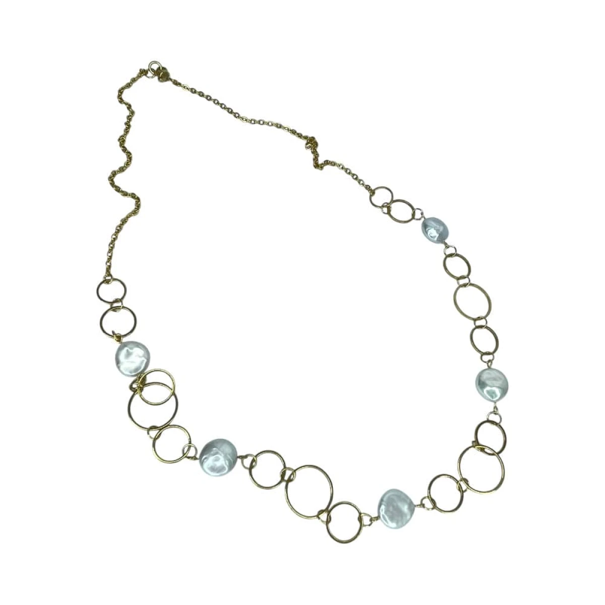 Naszyjnik z kolekcji „Morskie szepty pereł” wykonano z pozłacanej stali szlachetnej i naturalnych pereł, które połączono łańcuchem z dużych, okrągłych ogniw. Regularny układ złoconych form przeplatanych perłami tworzy wyrazisty rytm, przywodzący na myśl lekką pianę morską unoszącą się na powierzchni wody. Złote wykończenie nadaje projektowi współczesnej elegancji i wydobywa naturalną świetlistość pereł. To model, który wyróżnia się formą, a jednocześnie zachowuje ponadczasowy charakter i klasę.