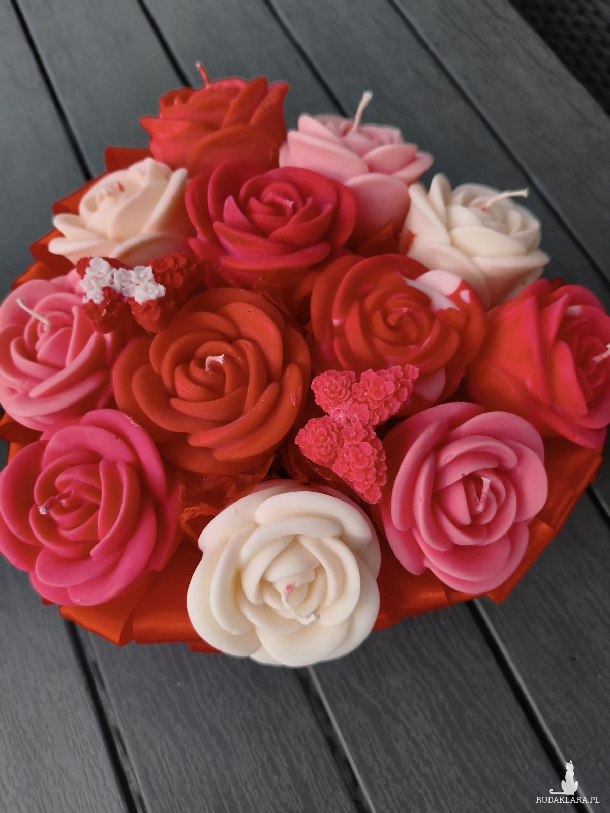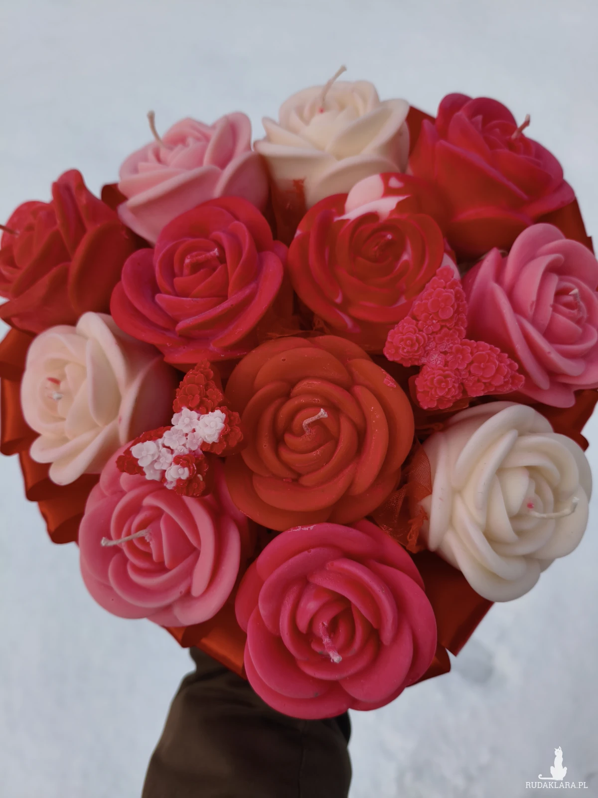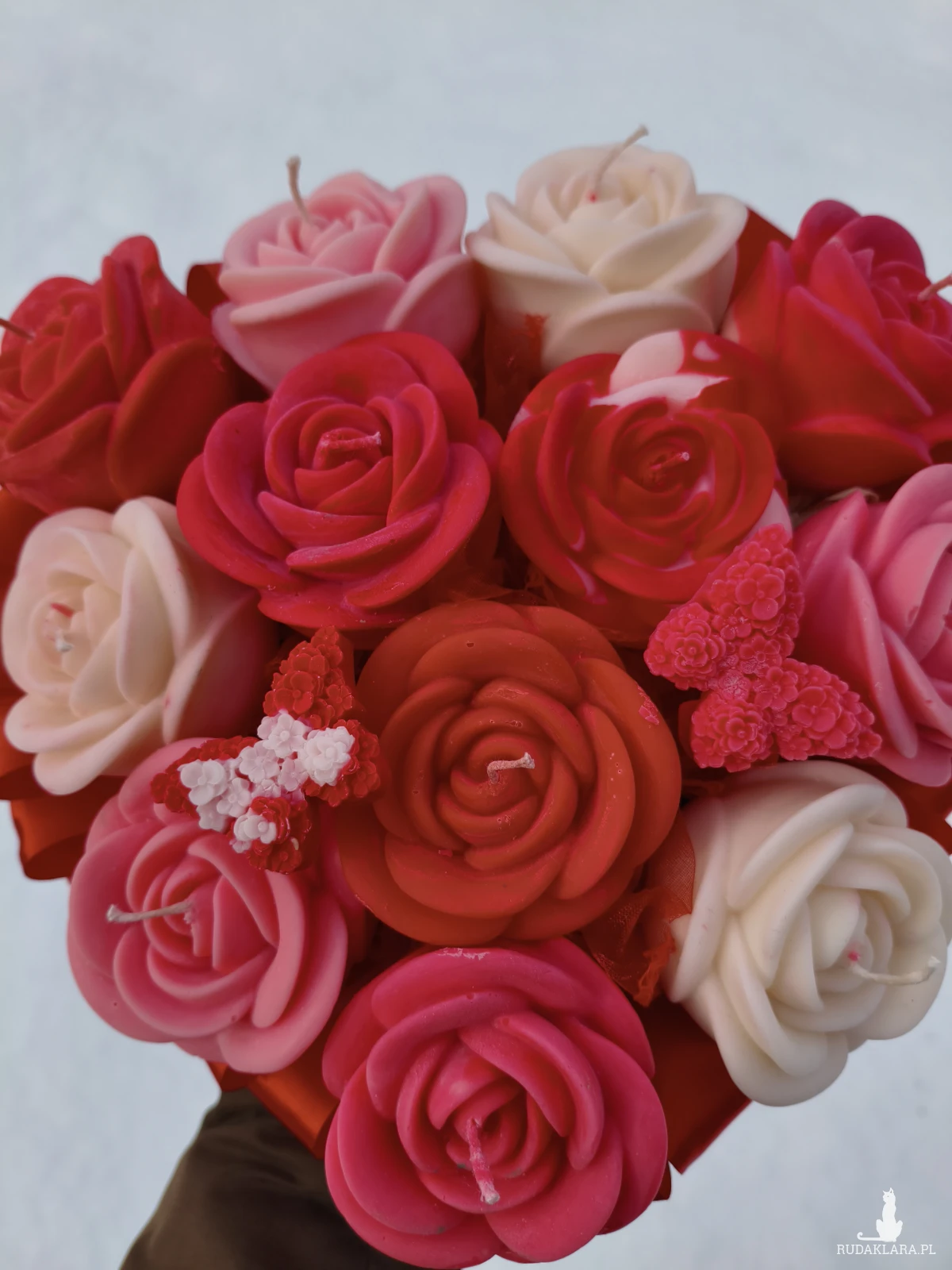Flower box zawiera główki kwiatów które po wyciągnięciu z bukietu można zapalić. Flower box wysyłam zapakowany w celofan, wstążkę i bukiecik ze suszu oraz instrukcją palenia świec - gotowy do wręczenia jako prezent.