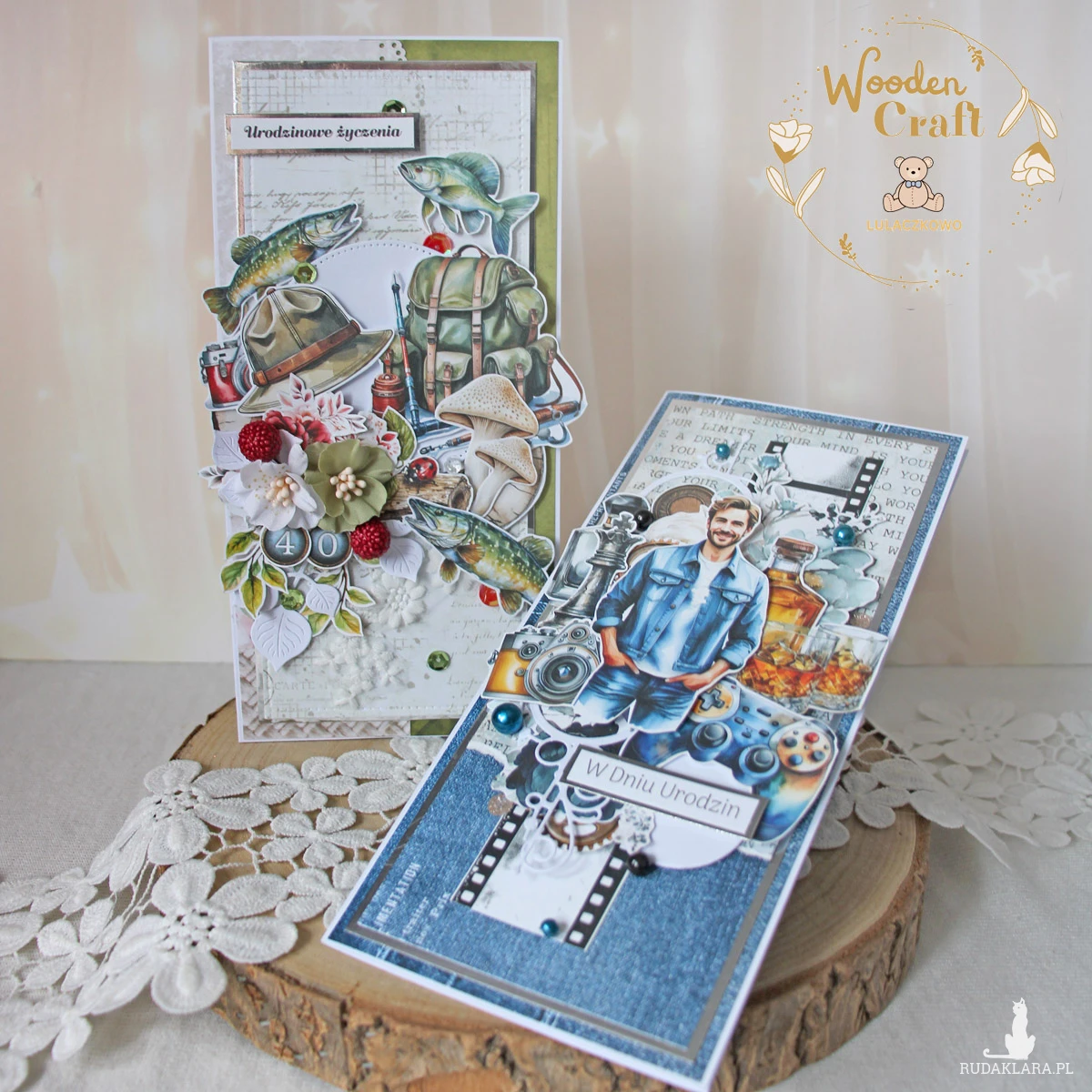 Nietuzinkowa, męska kartka urodzinowa, dla fana wędkarstwa. Utrzymana w odcieniach beżu, bieli i zieleni z dodatkiem błyszczących srebrnych akcentów, zamknięta w białym pudełeczku z okienkiem. Wykonana ręcznie z mixu męskich kolekcji papierów, ozdobiona licznymi grafikami o tematyce wędkarskiej, zielonymi cekinami, a także napisem "Urodzinowe życzenia" (do napisu mogę dodać również imię solenizanta oraz cyferki).