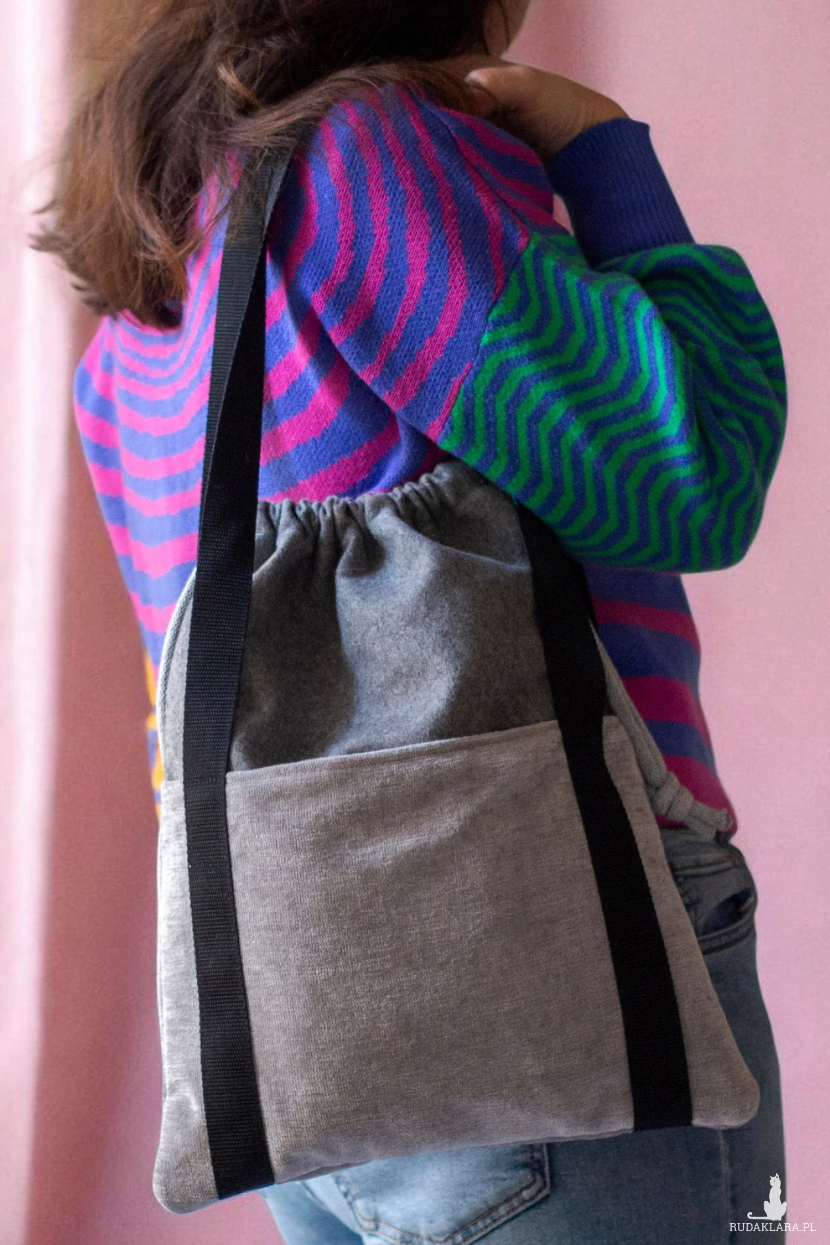 Torba na ramię z kominem, ściągana jak worek, w kolorze szarym. Z przodu i z tyłu torebki duże otwarte kieszenie.