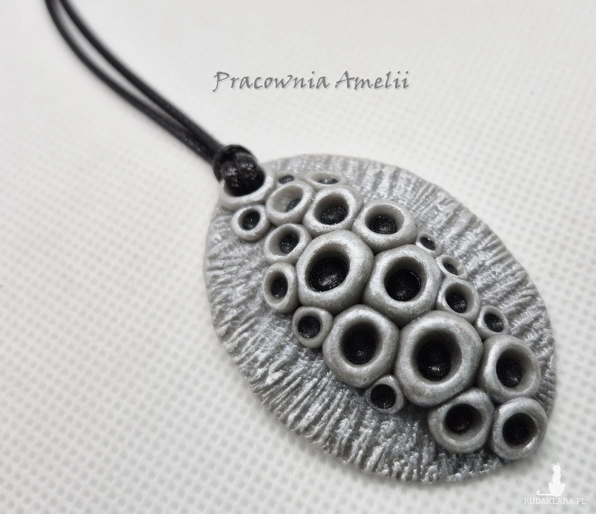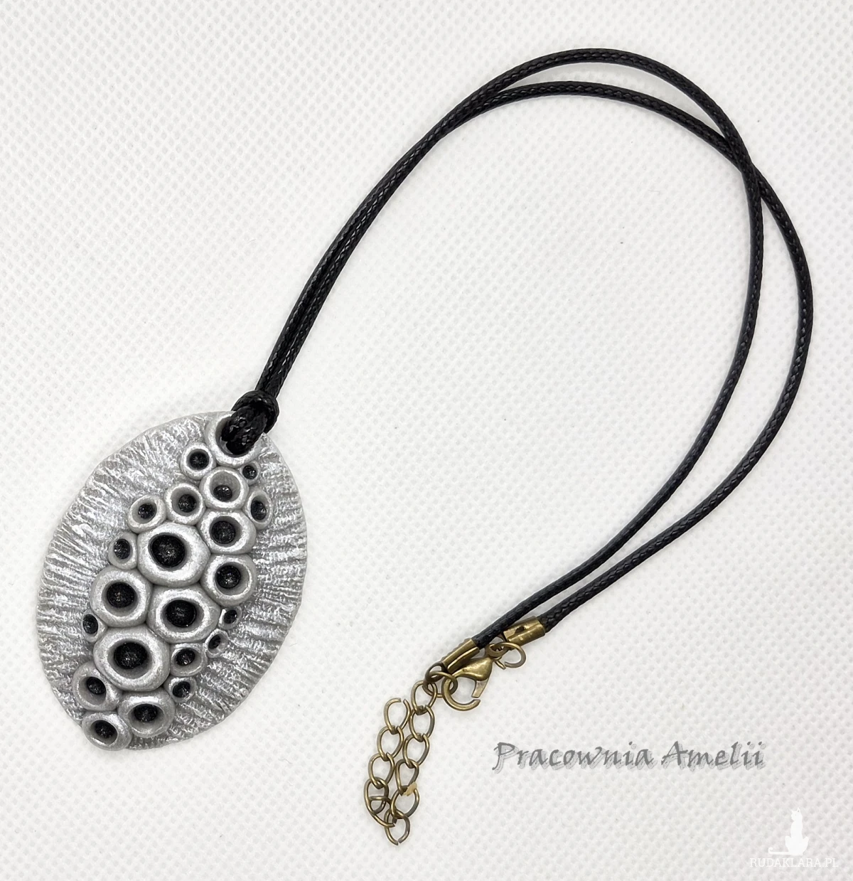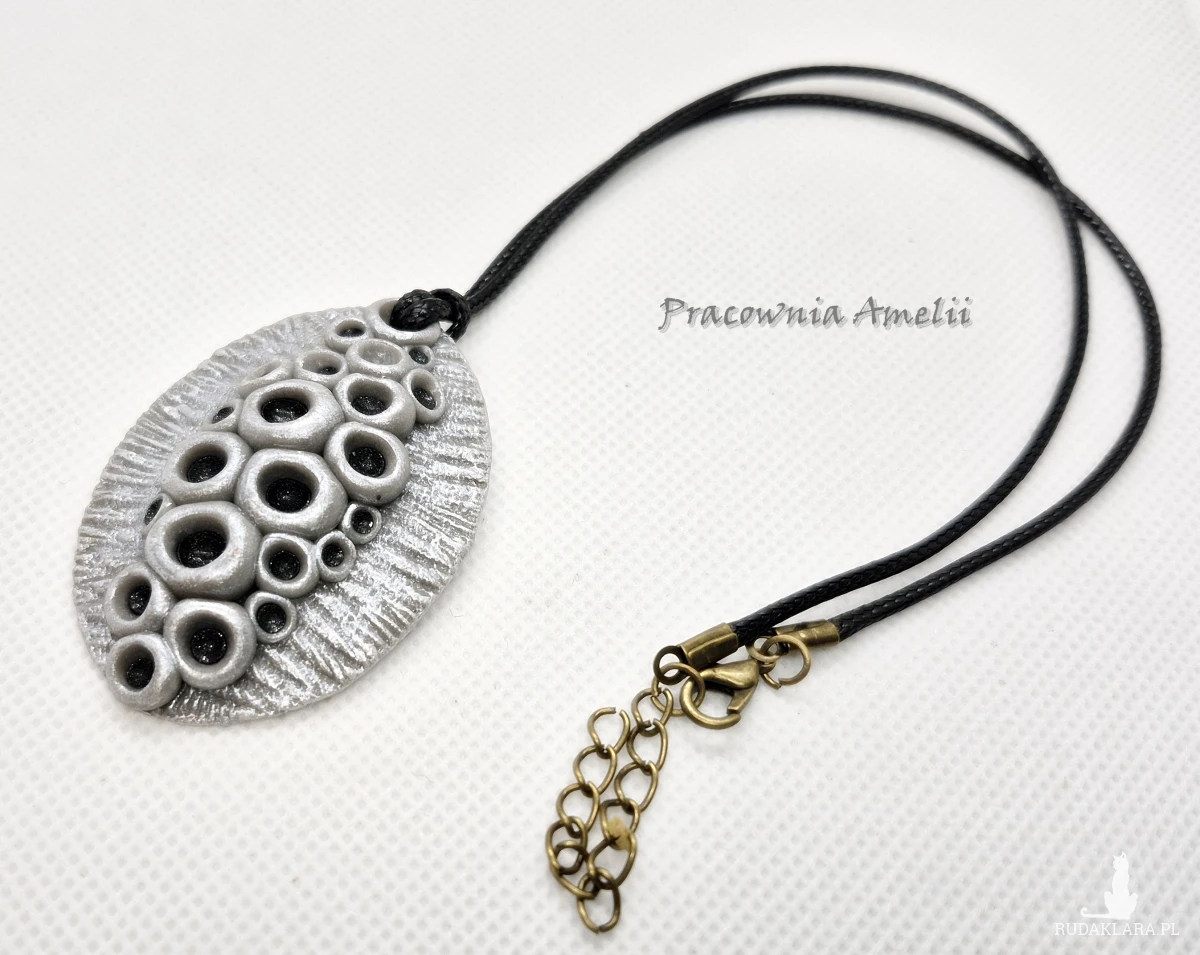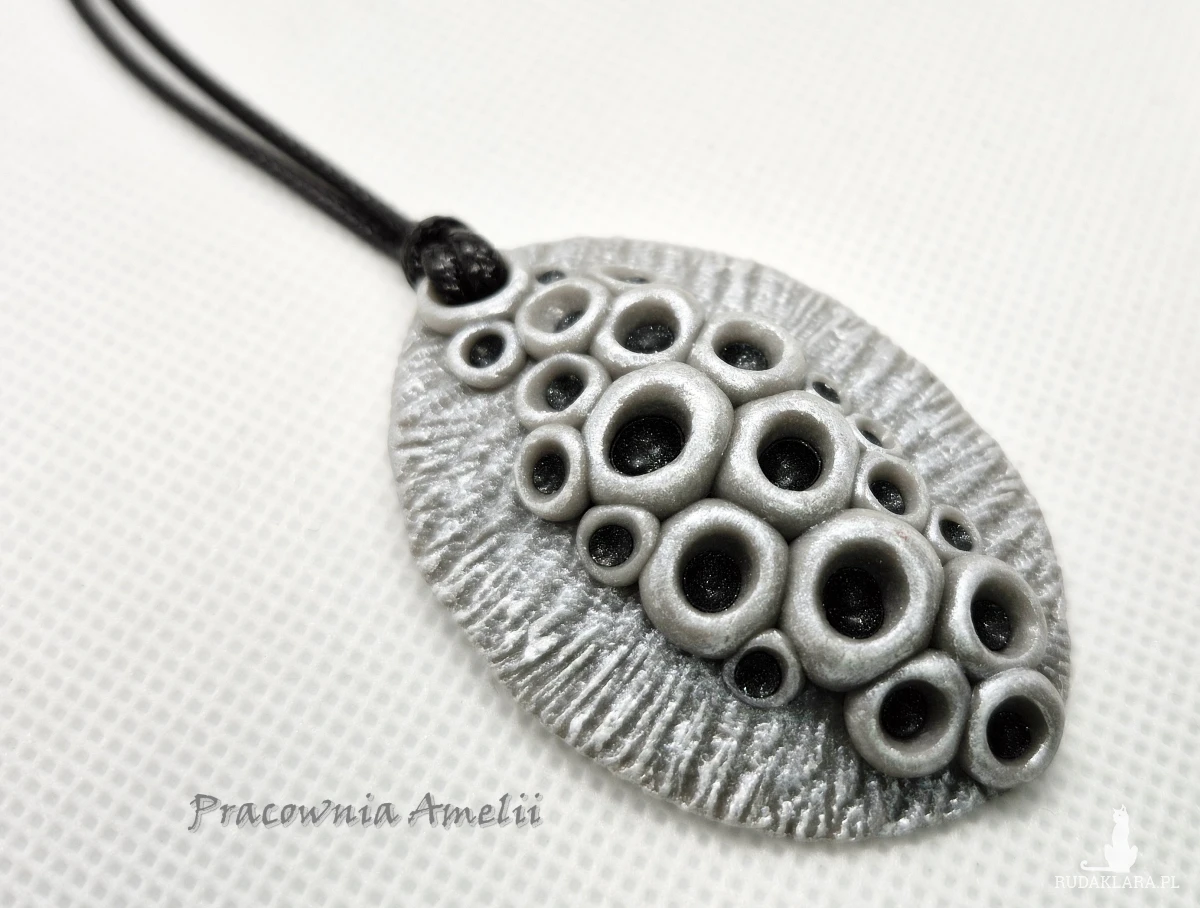 Wisior wykonany z gliny polimerowej zawieszony na czarnym powlekanym sznurku zapinanym na karabińczyk (z łańcuszkiem regulacyjnym). Wisior ma strukturę przywodzącą na myśl suszony kwiat lotosu. Ładnie prezentuje się na dekolcie. Projekt własny, wykonany tylko w jednym egzemplarzu. Biżuteria z gliny polimerowej jest trwała i uniwersalna. Idealna na oryginalny prezent w atrakcyjnej cenie.