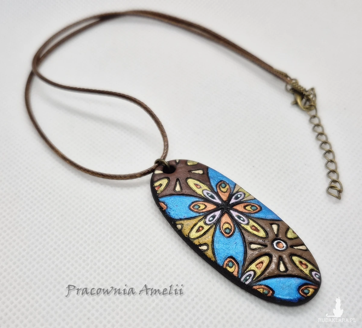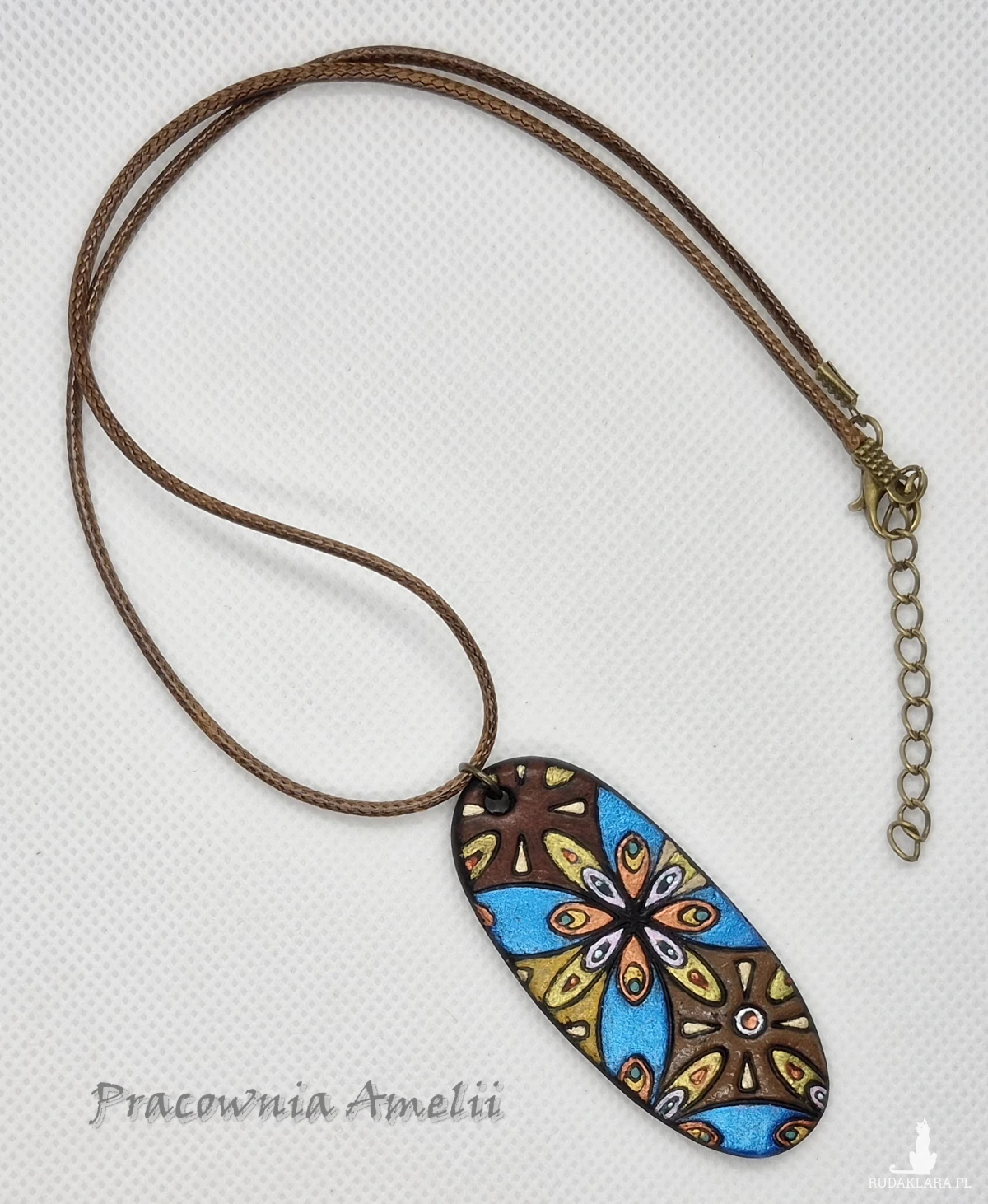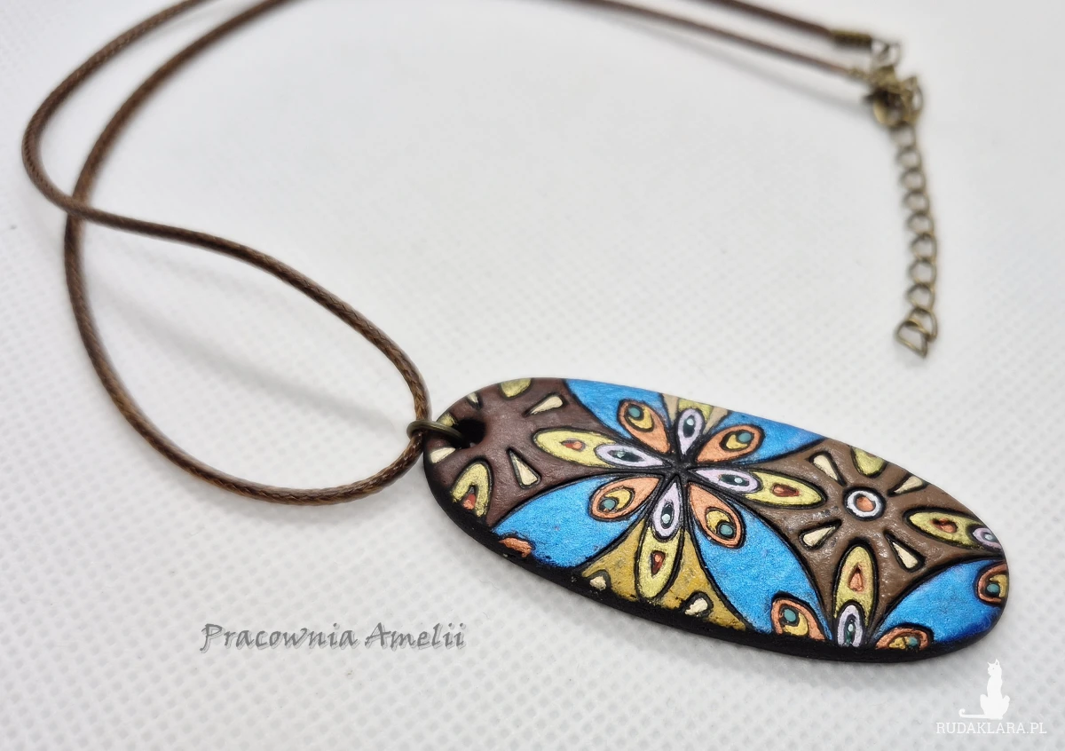 Wisior wykonany z gliny polimerowej zawieszony na brązowym powlekanym sznurku zapinanym na karabińczyk (z łańcuszkiem regulacyjnym). Ładnie prezentuje się na dekolcie. Projekt własny, wykonany tylko w jednym egzemplarzu. Biżuteria z gliny polimerowej jest trwała i uniwersalna. Idealna na oryginalny prezent w atrakcyjnej cenie.