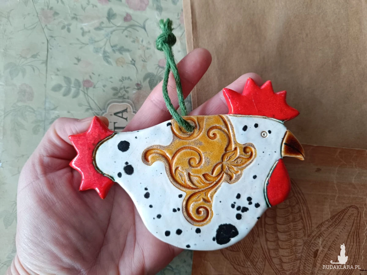 Kura nakrapiana zawieszka, wykonana została z gliny szamotowej, wypalona na biskwit, a następnie szkliwiona w temp ok 1260 stopni C. Wymiary ok 13 cm x 9 cm. Polecam serdecznie do ozdoby kuchni lub jako upominek wielkanocny.