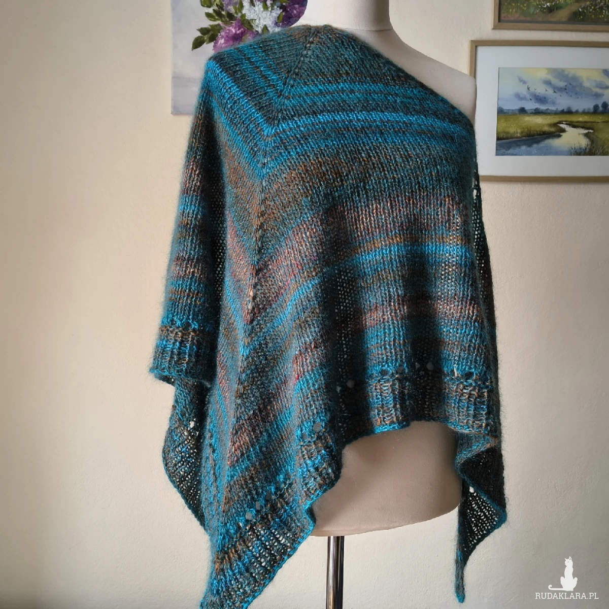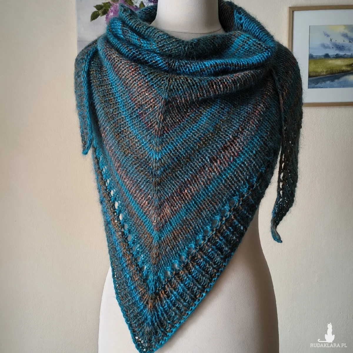 Miła, puchata, mięsista, lejąca i bardzo ciepła chusta, wykonana ręcznie na drutach podwójną nitką z doskonałych włóczek (w tym wyjątkowej, kultowej i niestety bardzo drogiej włóczki japońskiej firmy Noro), kanadyjskiego, szlachetnego jedwabiu z moherem i wełenki 100% merino. Łączny skład włóczek to: jedwab, moher, wełenka merino i minimalna ilość poliamidu. Niestety zdjęcia nie oddają piękna kolorów ich gradientów i uroku włóczek. kolorystyka włóczek jedwabno-moherowych została dobrana w taki sposób, aby jak najlepiej wyeksponować japońską Noro. Chusta jest twarzowa, a jej barwy niecodzienne i oryginalne. Jest przy tym bardzo ciepła: doskonała do zimowego otulenia, jak i okrycia w cieplejszych miesiącach. Wymiary: 202 cm. najdłuższy bok, 86 cm. wys. trójkąta. Na cenę chusty ma wpływ cena włóczek. Pranie wyłącznie ręczne.