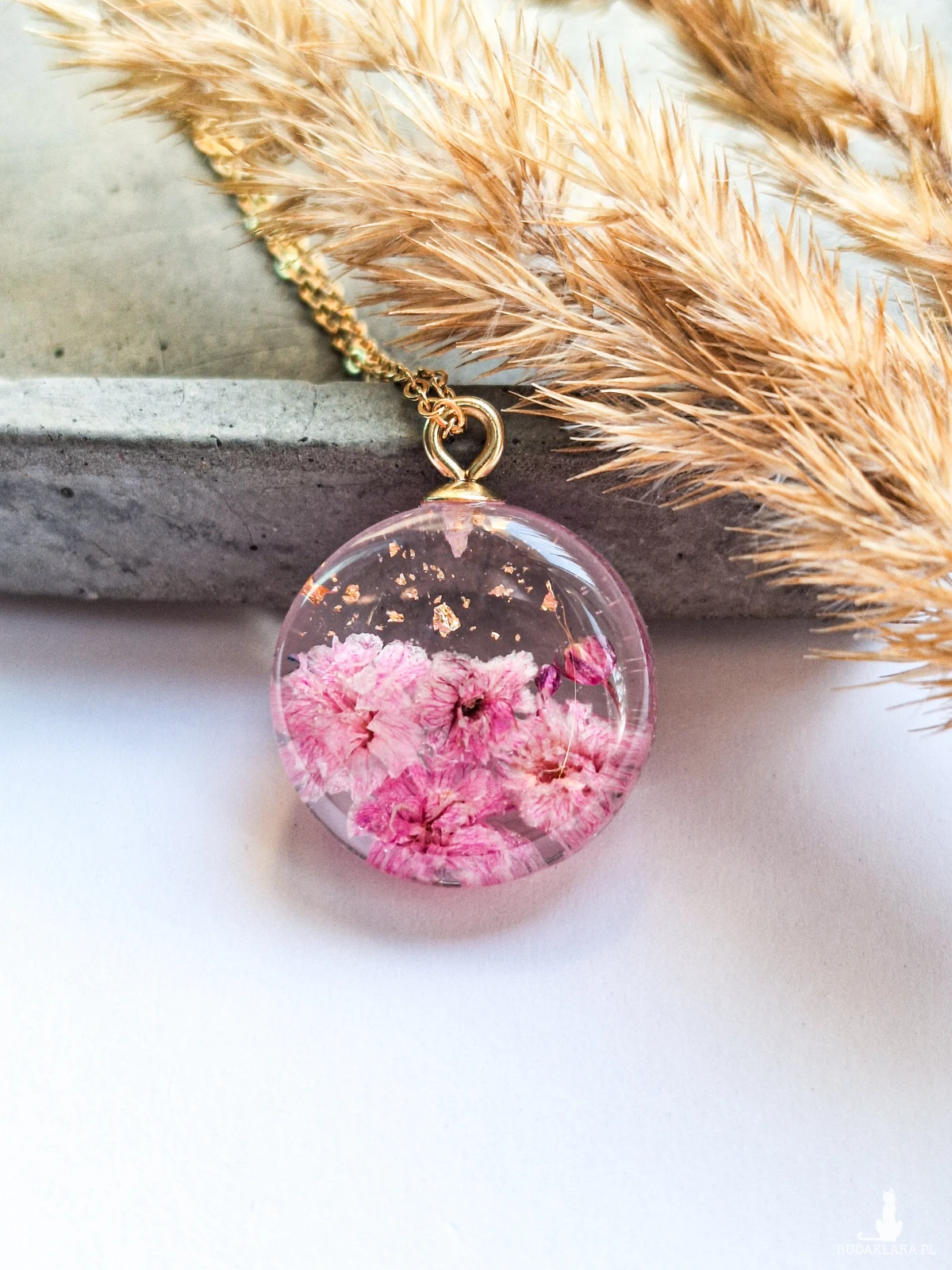 Uroczy wisiorek z zatopionymi kwiatami różowej gipsówki i płatkami złota. Wykonany z wysokiej klasy żywicy, która nie zmienia koloru pod wpływem promieniowania uv oraz wysokiej jakości stali chirurgicznej. Dostępny jest też taki sam wisiorek w większym rozmiarze, kolczyki i bransoletka.