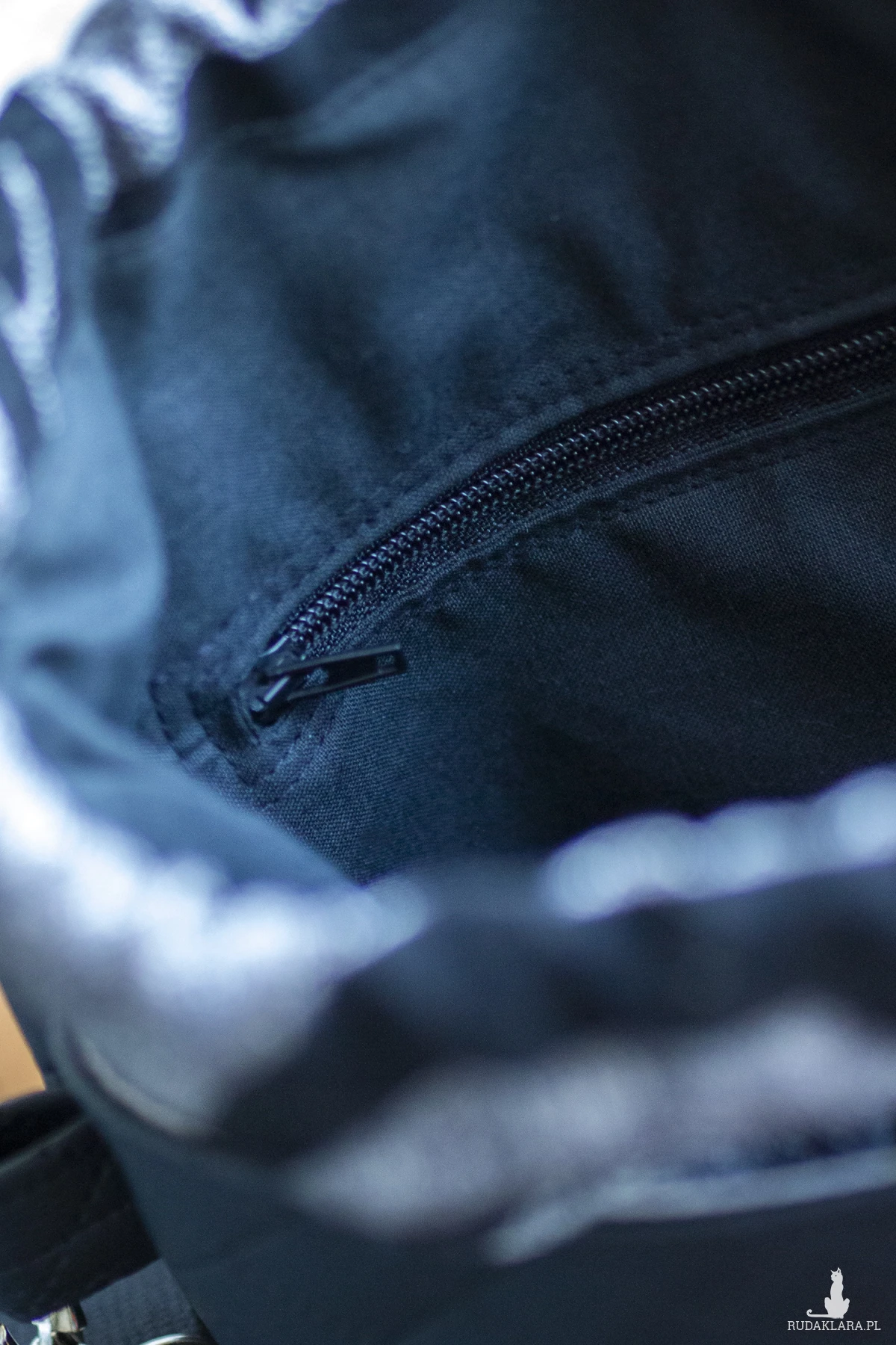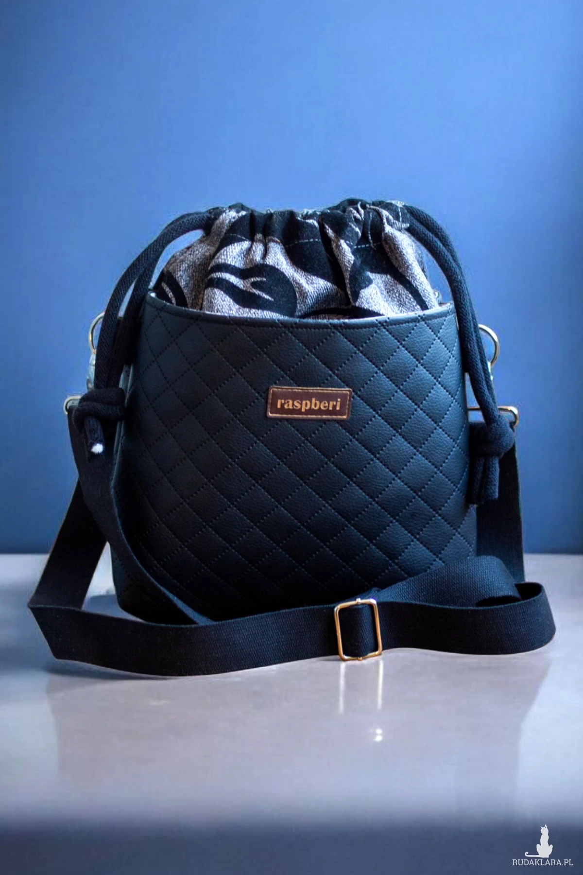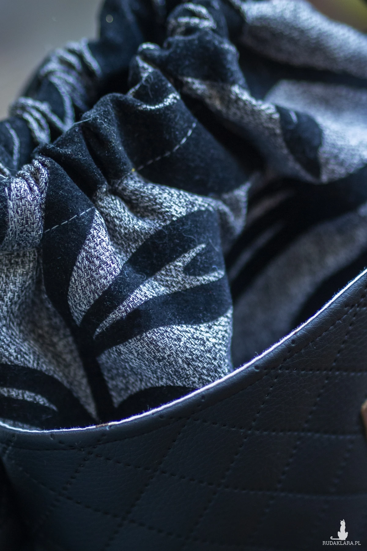 Wykonana z szaro-czarnej tkaniny we wzory. Z przodu oraz z na tyle torebki kieszenie (np. na telefon czy chusteczki) z czarnej pikowanej ekoskóry. W środku kieszonka zapinana na suwak.