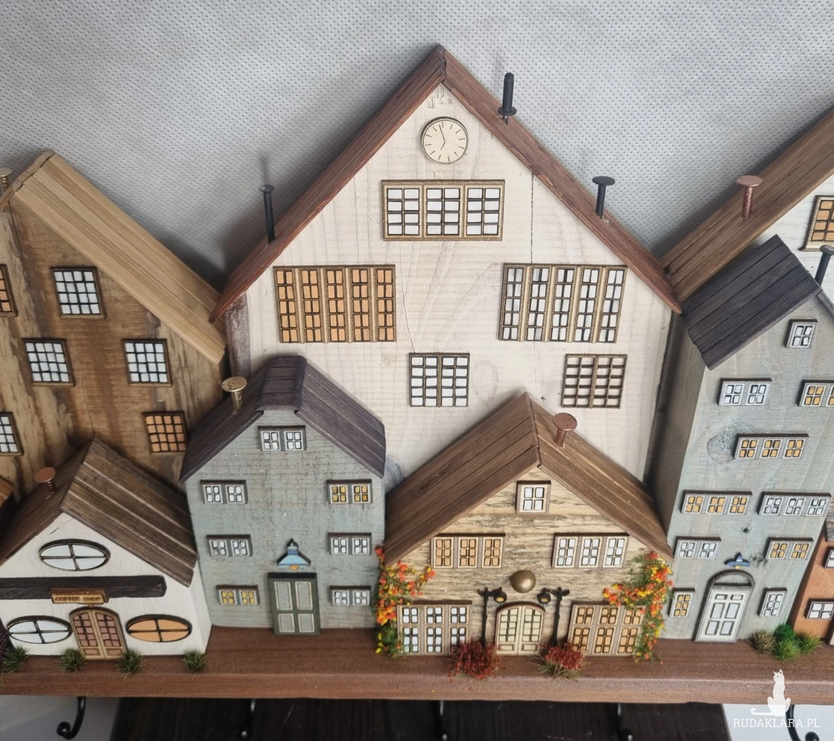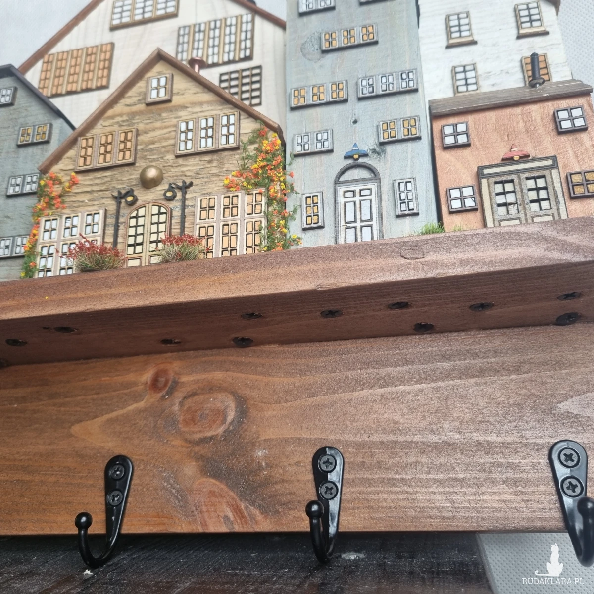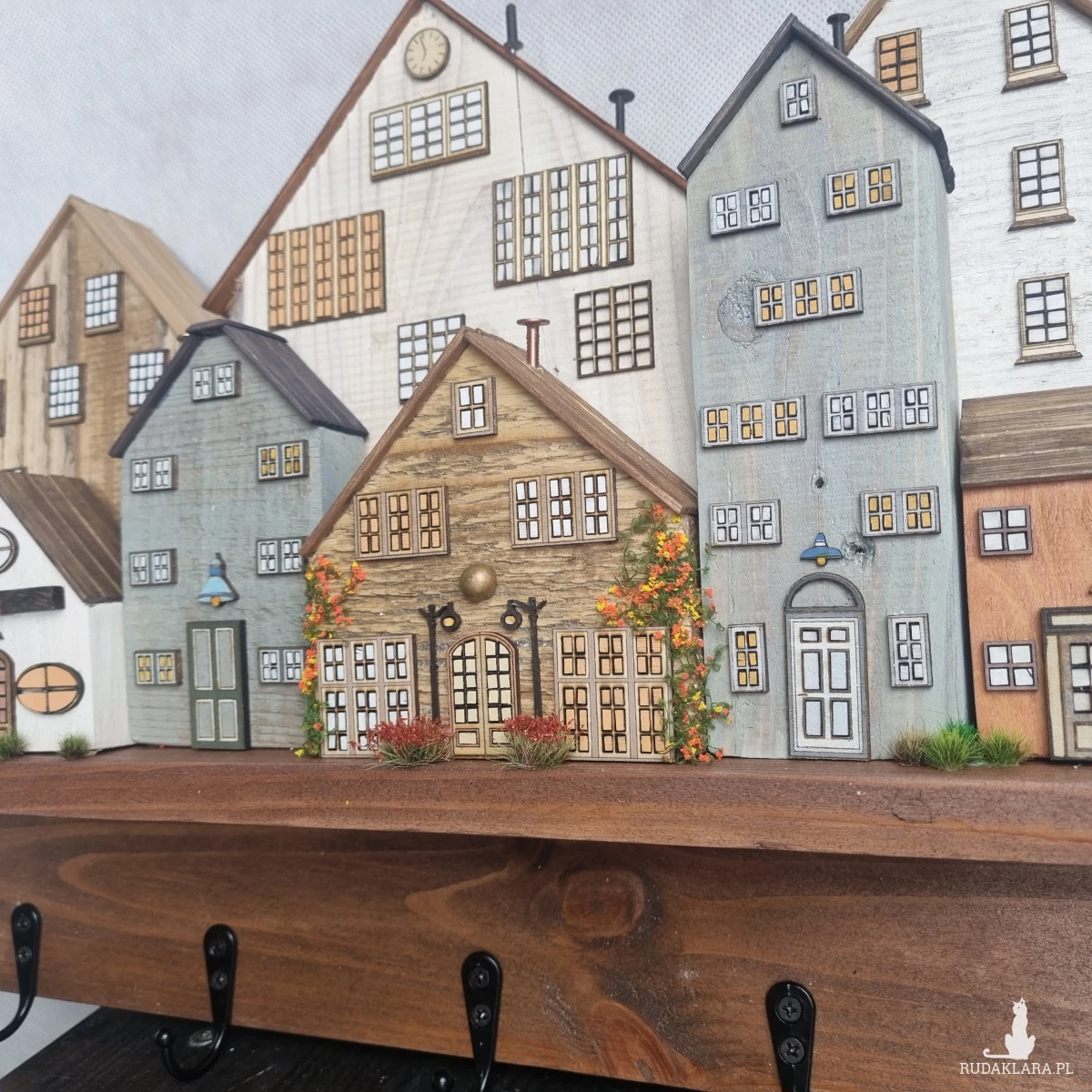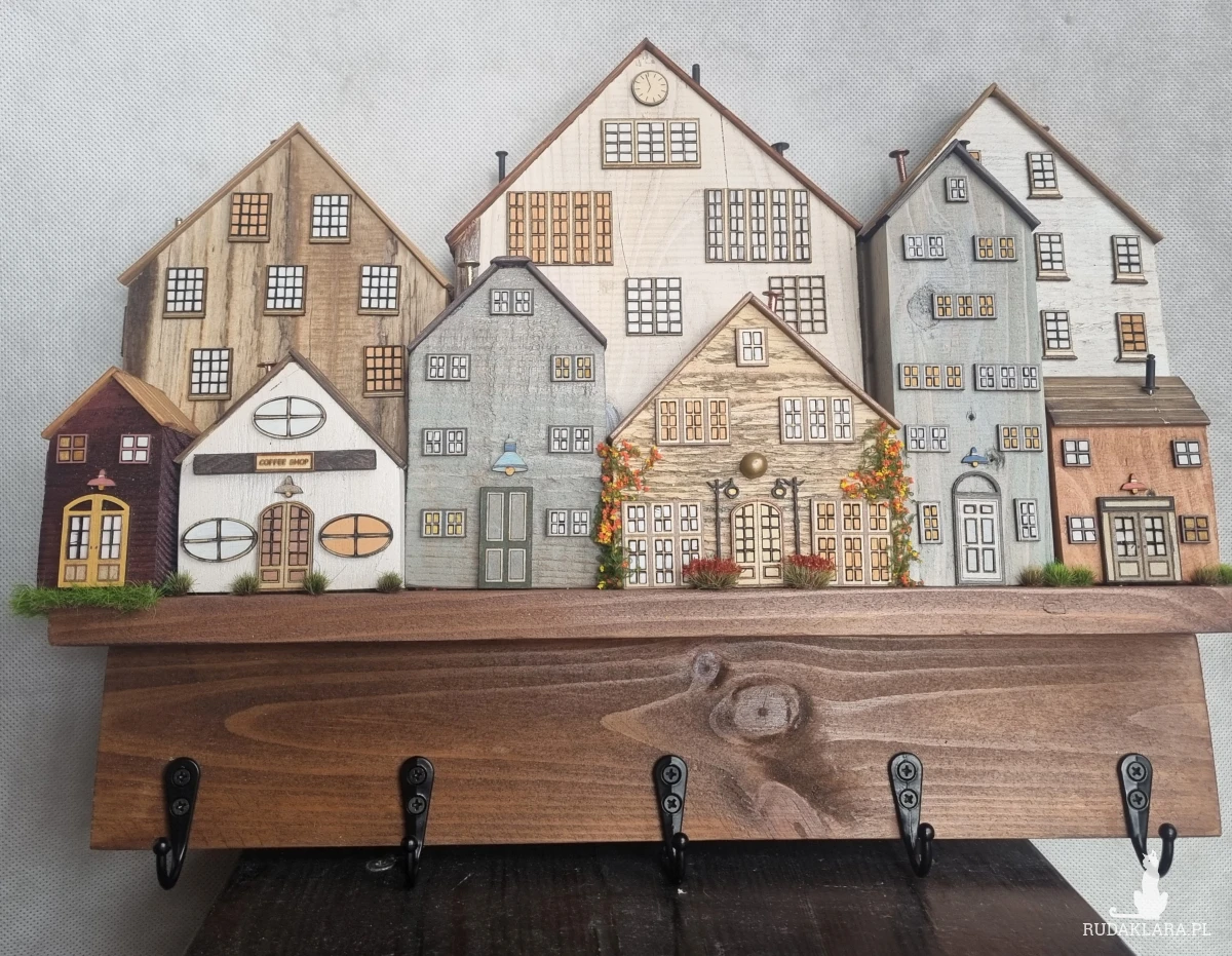 Drewniane domki handmade, mogące służyć jako wieszak na klucze (5), ręczniki inne drobiazgi. Domki wykonane desek ze starych palet z odzysku. Drewno bejcowane, woskowane, malowane w różnych odcieniach - ładnie podkreślające starość drewna - malowane bezbarwną farbą akrylową. Drewniane, wycinane okna i drzwi, również inne detale. Długość 41 cm, wysokość 30 cm, szerokość 7 cm . Całość do zawieszenia na ścianie na 2 hakach. (18)