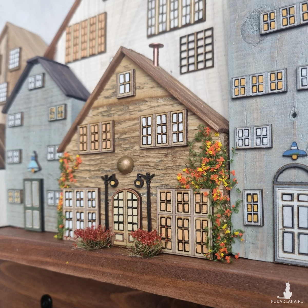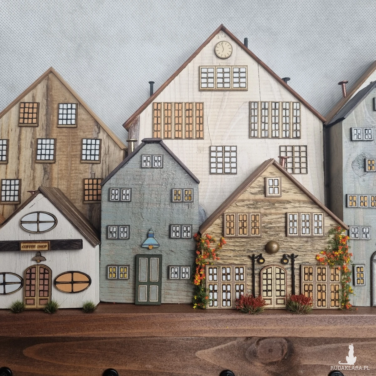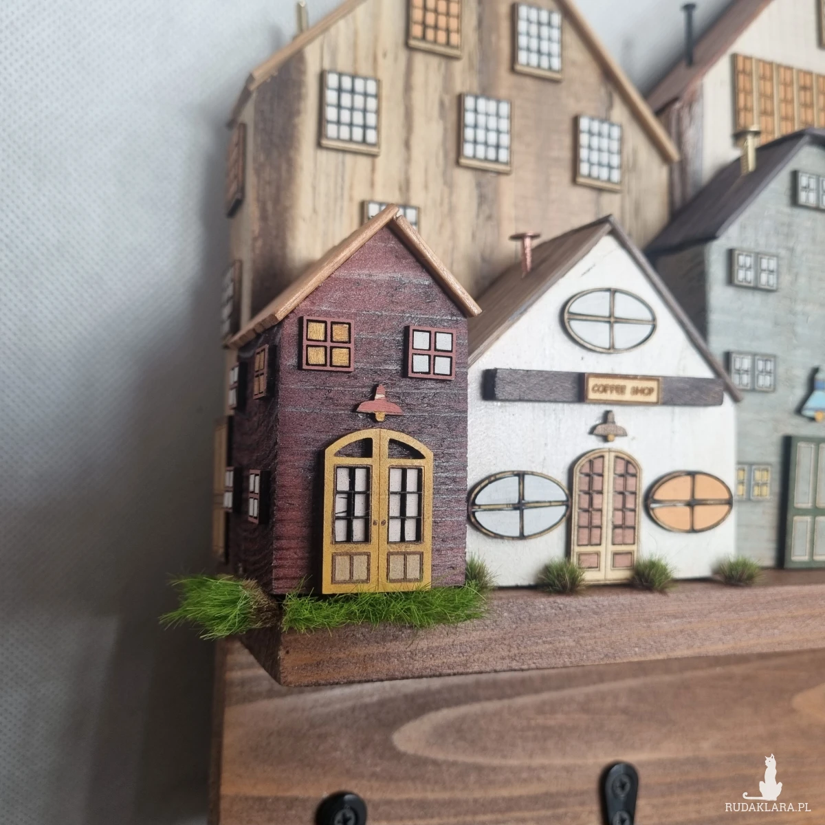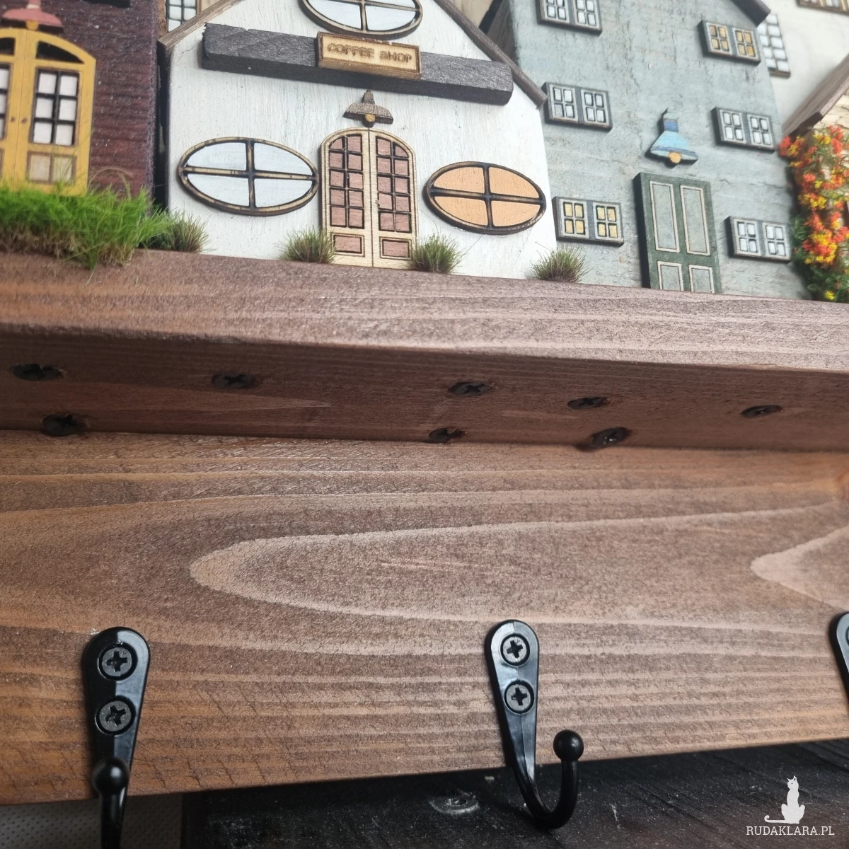 Drewniane domki handmade, mogące służyć jako wieszak na klucze (5), ręczniki inne drobiazgi. Domki wykonane desek ze starych palet z odzysku. Drewno bejcowane, woskowane, malowane w różnych odcieniach - ładnie podkreślające starość drewna - malowane bezbarwną farbą akrylową. Drewniane, wycinane okna i drzwi, również inne detale. Długość 41 cm, wysokość 30 cm, szerokość 7 cm . Całość do zawieszenia na ścianie na 2 hakach. (18)