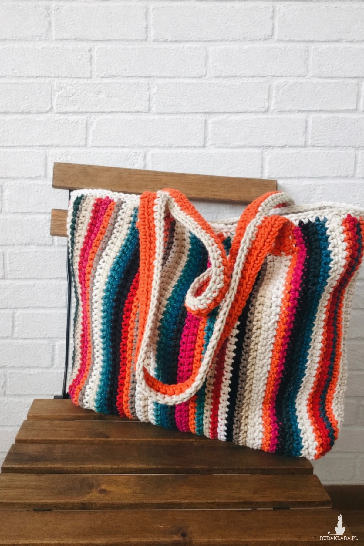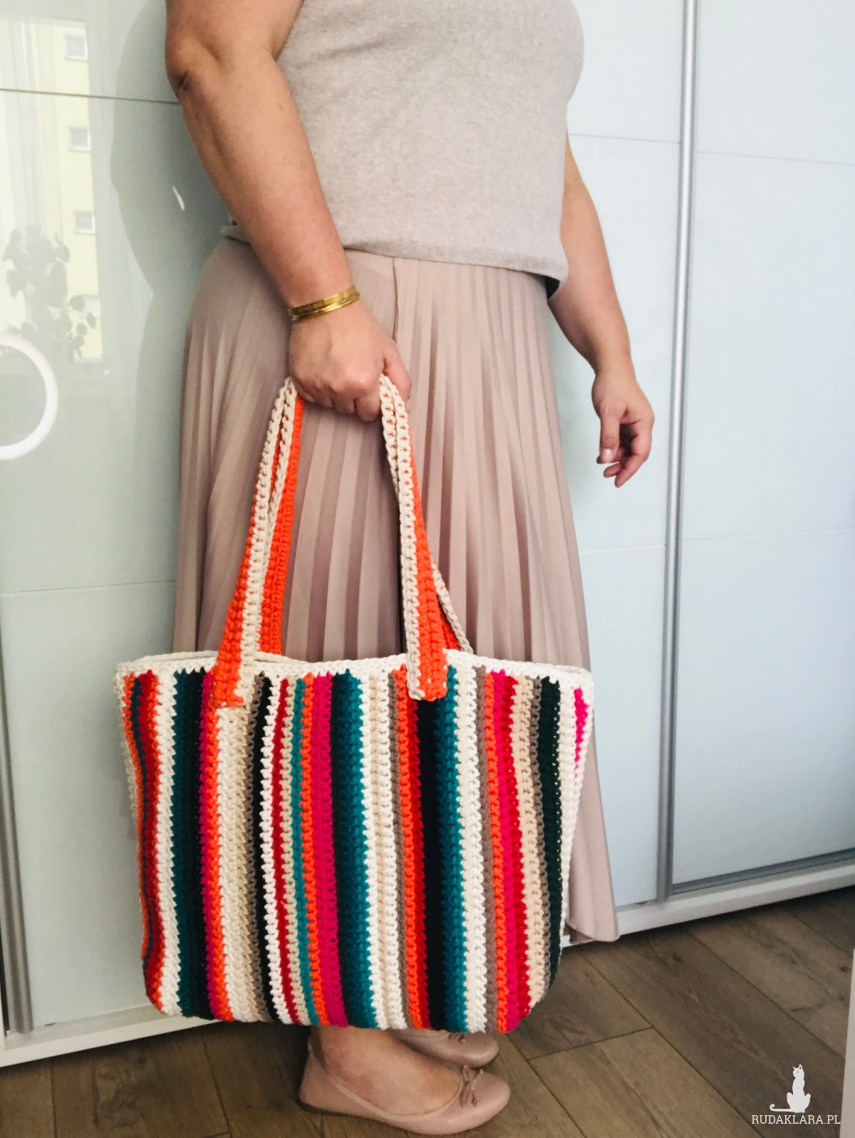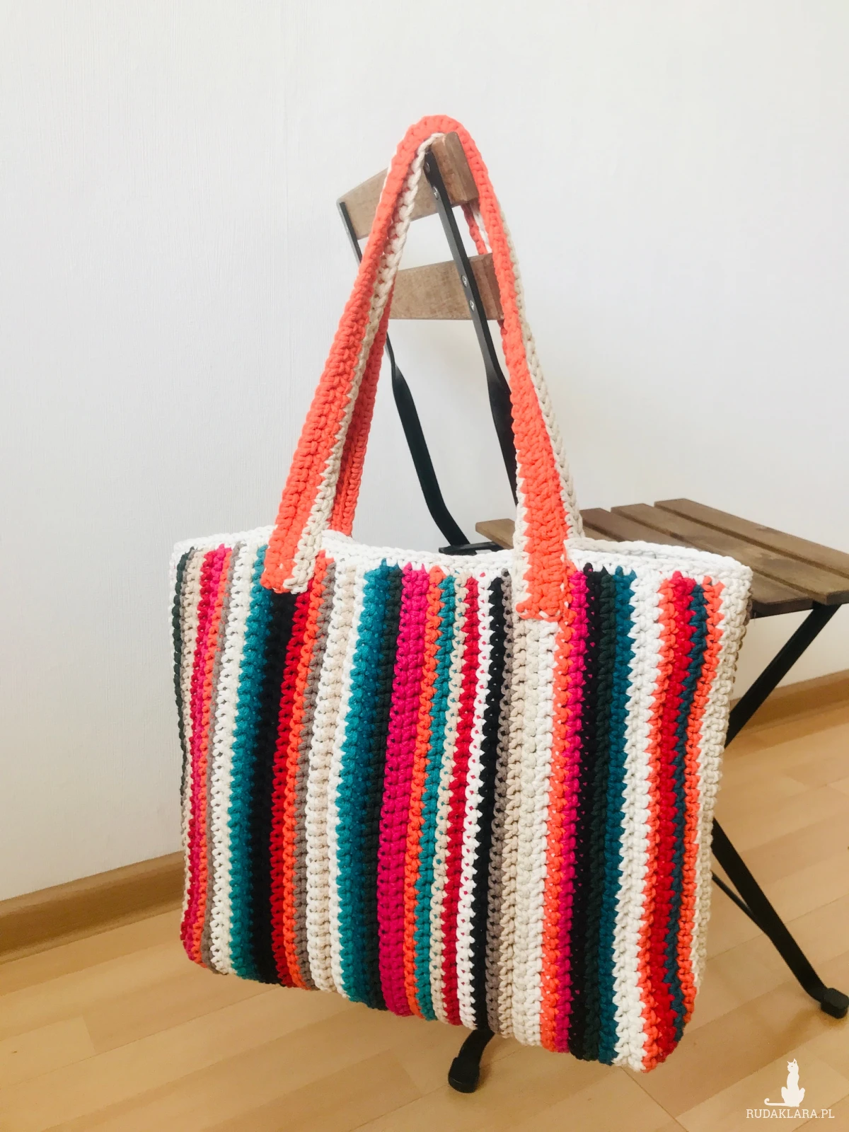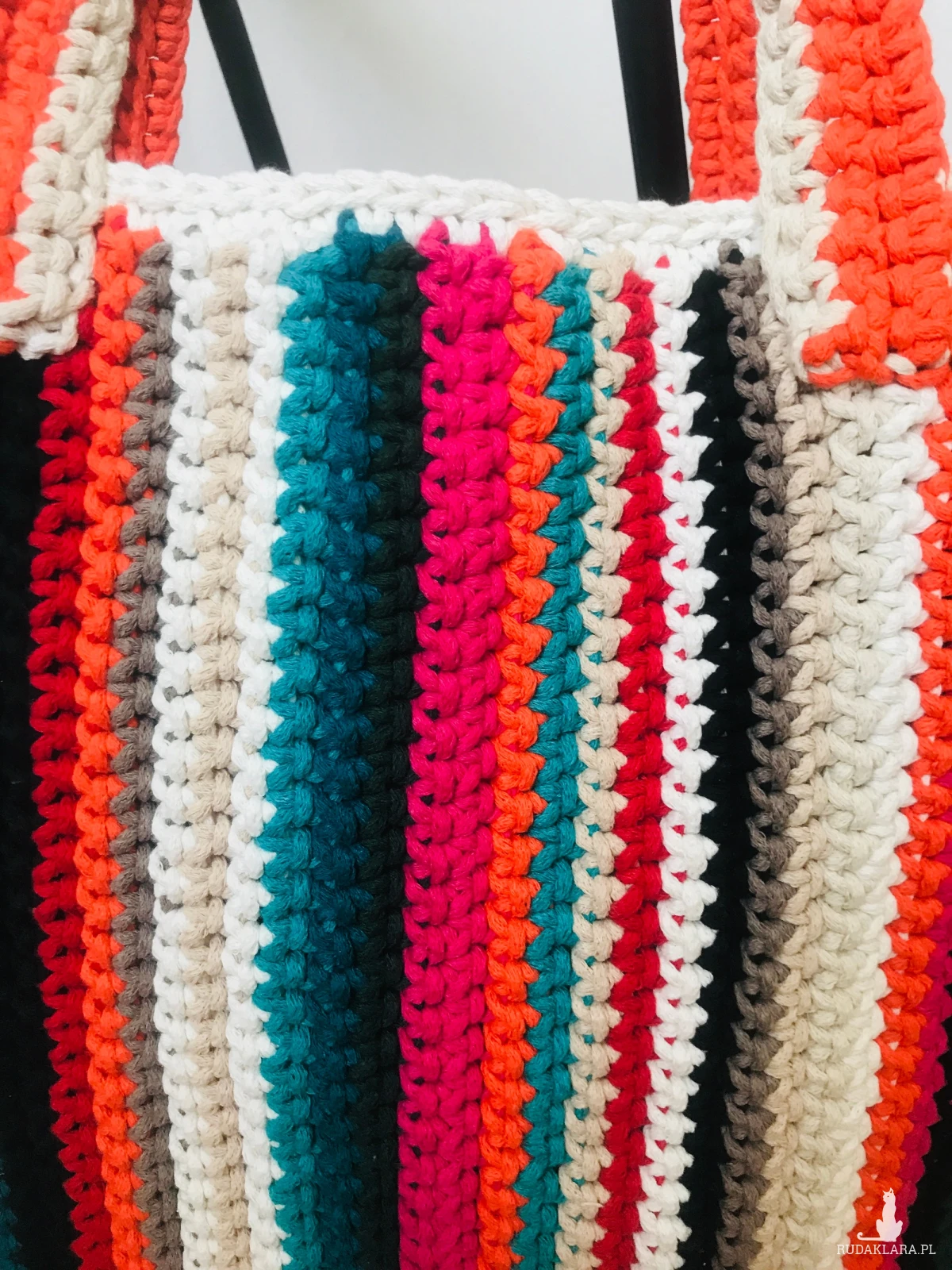 Duża, pojemna torebka w prostokątnym kształcie, wykonana ręcznie ze sznurka bawełnianego 3 mm w energetyczne, kolorowe pasy. To model, który łączy funkcjonalność z wyrazistym, radosnym designem i unikatowym charakterem.