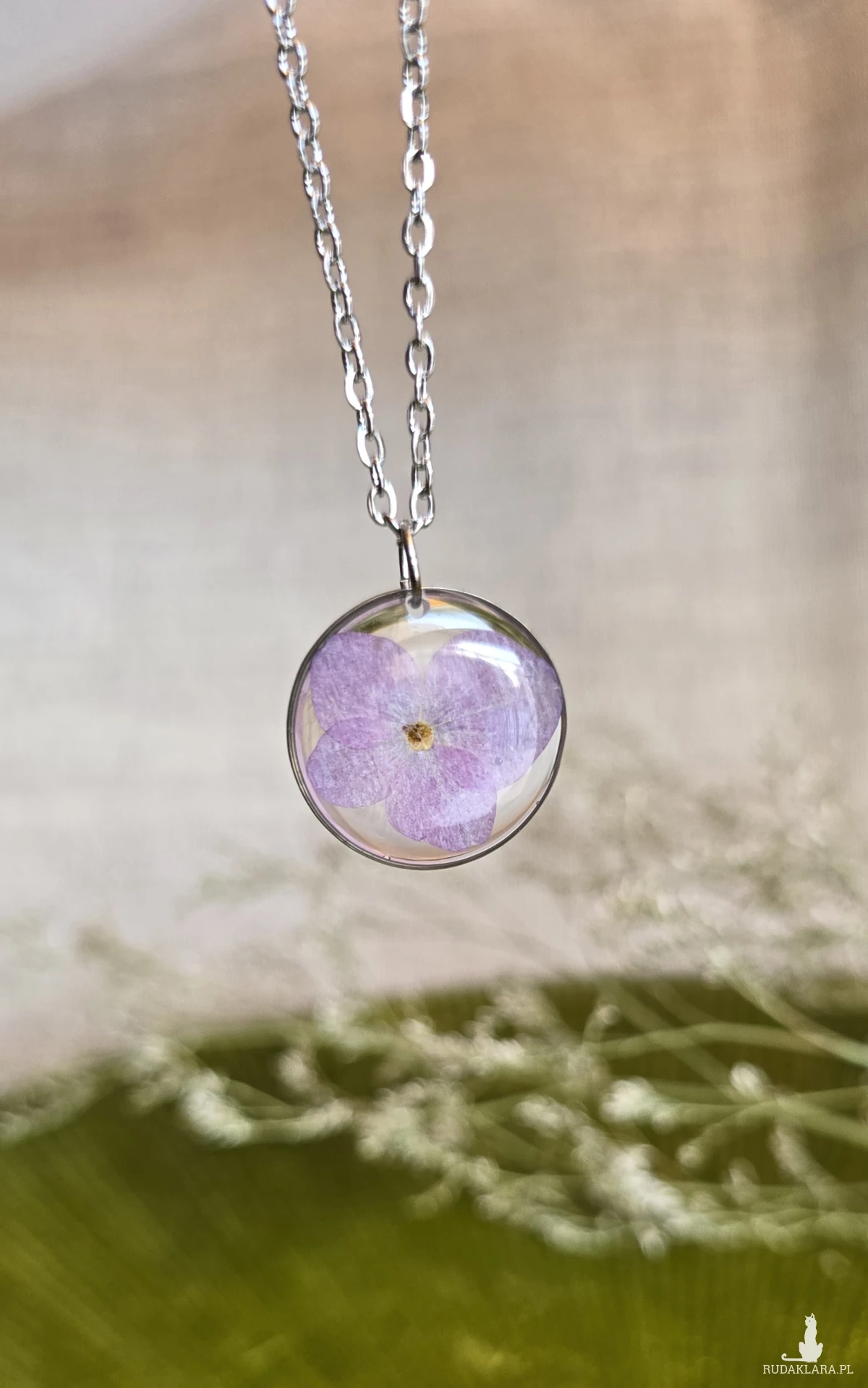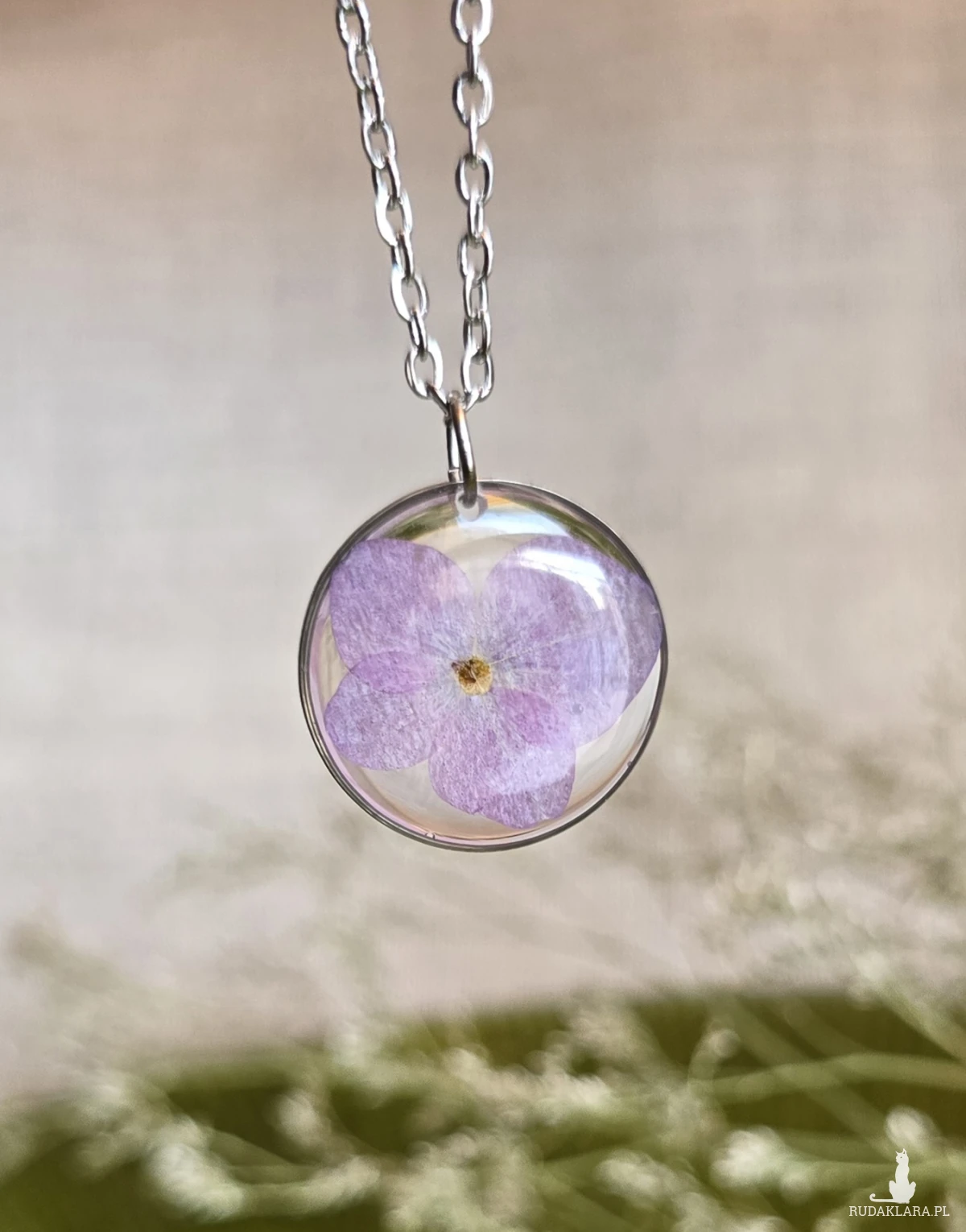 Oferuję Państwu unikalną biżuterię. Zawieszka jest wykonana z suszonych kwiatów i żywicy epoksydowej. Biżuteria jest wspaniałym i oryginalnym prezentem na lata.