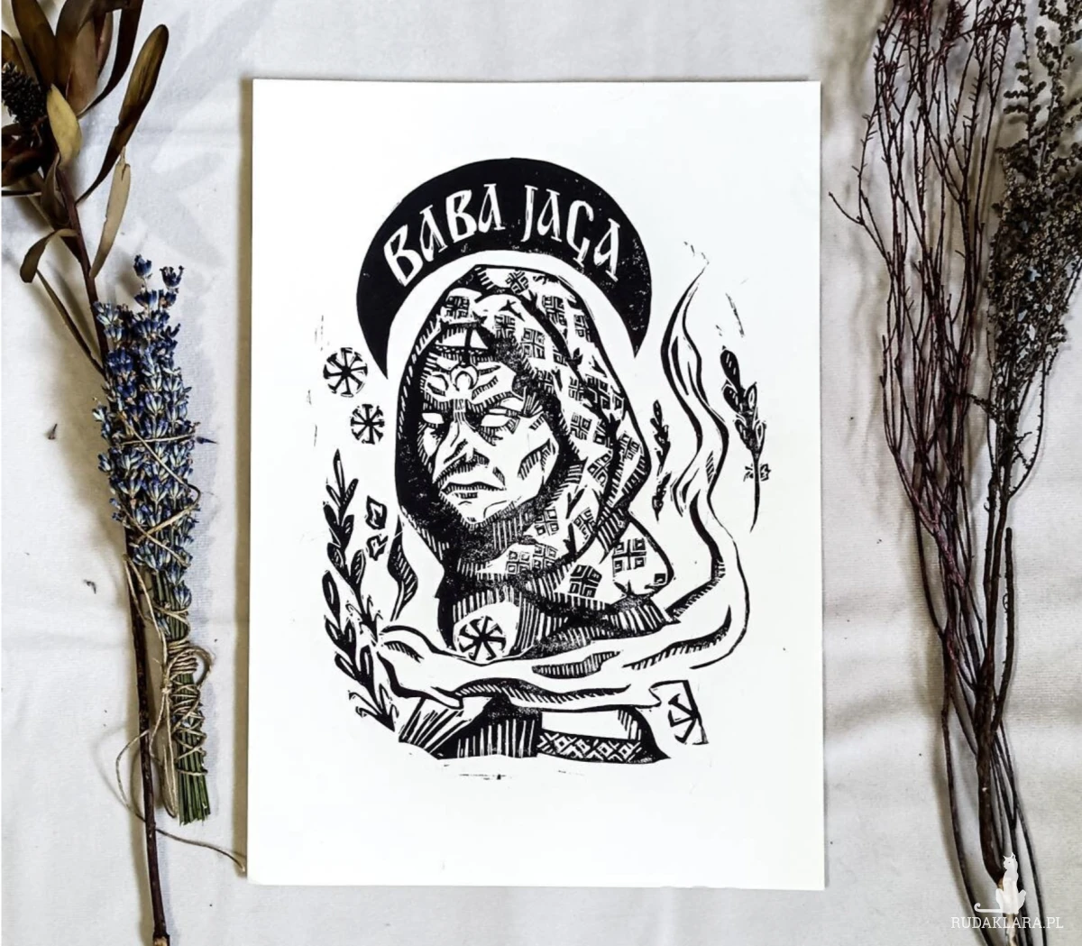 Na sprzedaż oferuję oryginalny linoryt inspirowany słowiańską mitologią, przedstawiający postać Baby Jagi w stylu folkowym. Grafika została wykonana tradycyjną techniką druku wypukłego – każdy egzemplarz odbijany jest ręcznie, co nadaje mu niepowtarzalny charakter.
