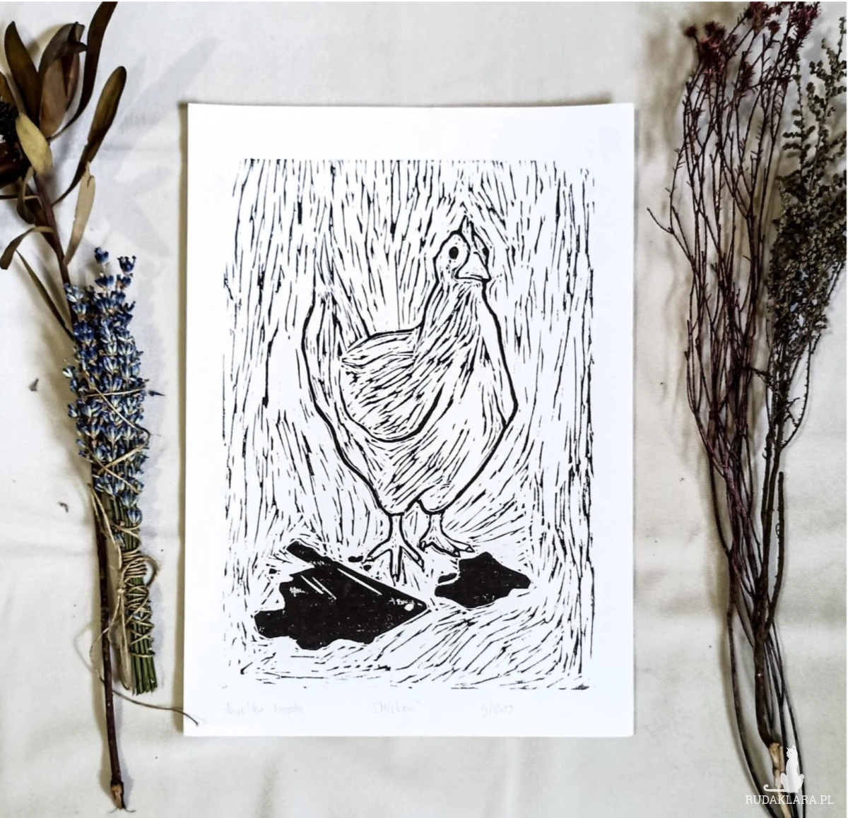 Oryginalny linoryt przedstawiający kurę w naturalnym, rustykalnym otoczeniu. Grafika wykonana została techniką druku wypukłego, gdzie wzór ręcznie wycinany jest w linoleum, a następnie odbijany farbą na papierze. Każdy egzemplarz jest unikatowy i może różnić się drobnymi detalami – to naturalna cecha rękodzieła.