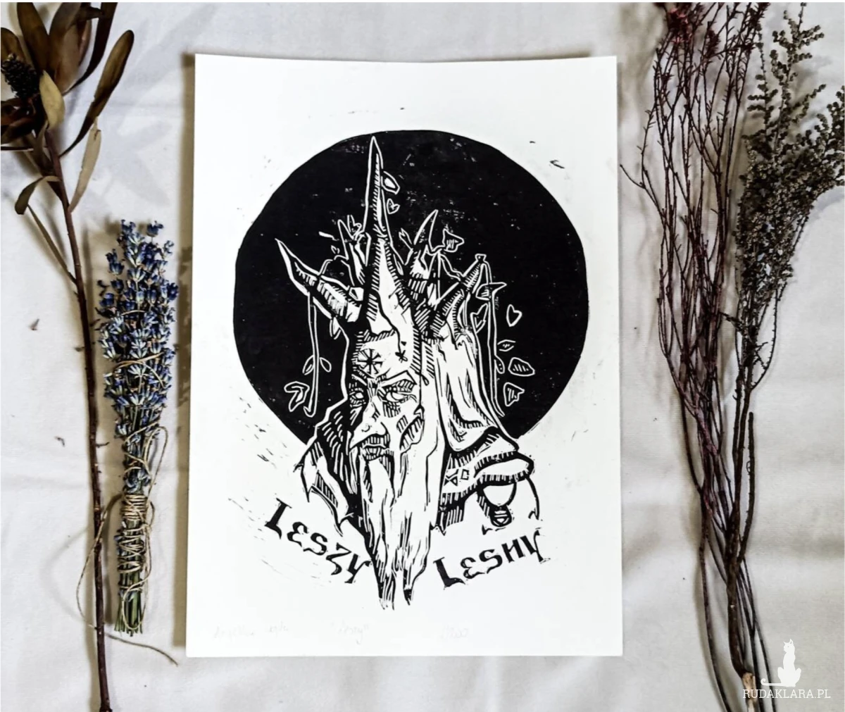 Oryginalny linoryt przedstawiający Leszego – słowiańskiego ducha lasu, strażnika natury i opiekuna dzikiej puszczy. Grafika została wykonana tradycyjną techniką druku wypukłego, w której wzór ręcznie wycinany jest w linoleum, a następnie odbijany farbą drukarską na papierze. Dzięki temu każda odbitka jest niepowtarzalna i posiada własny charakter.