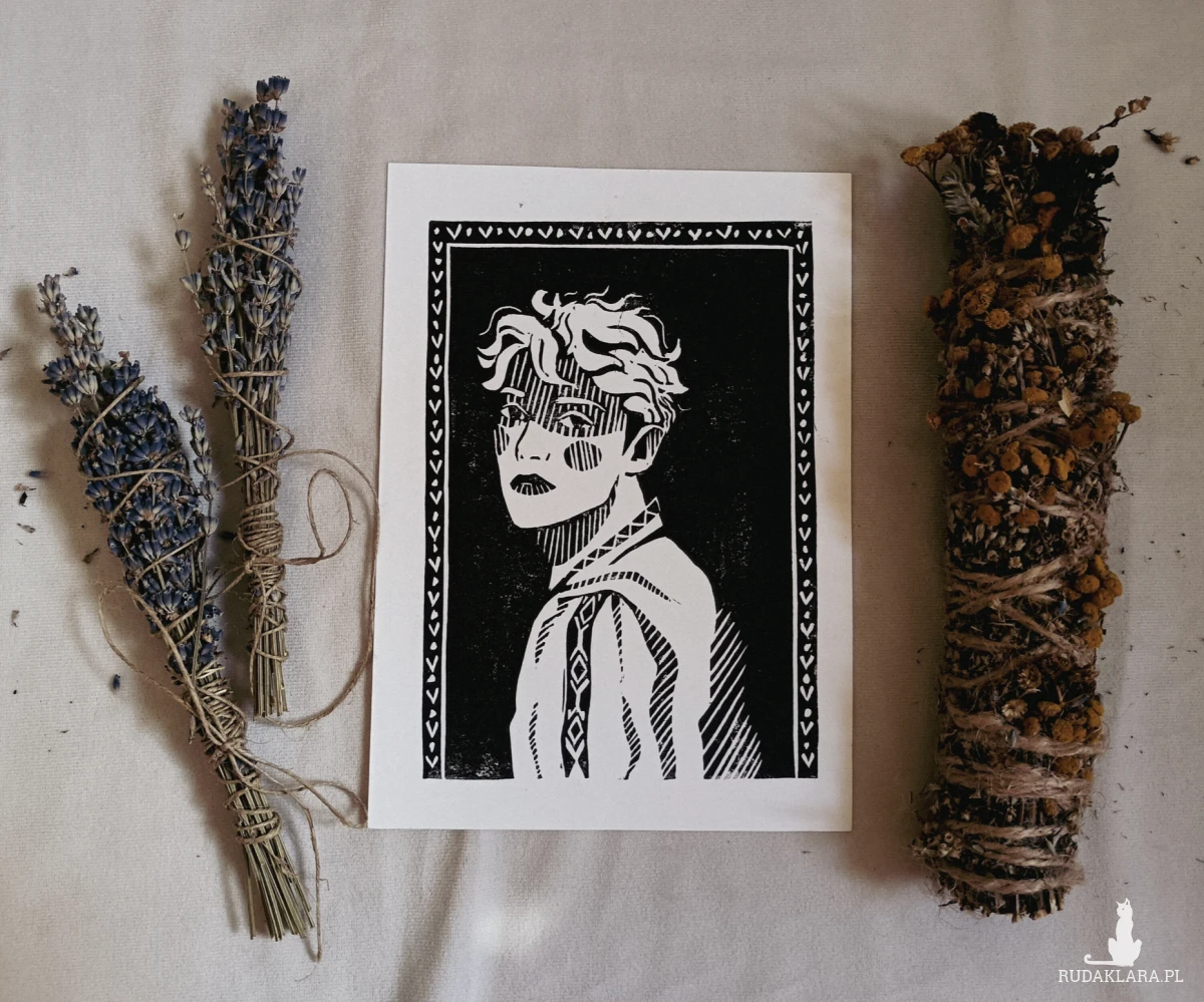 Oferuję wyjątkowy, ręcznie wykonany linoryt przedstawiający chłopaka z falowanymi włosami i subtelnymi rumieńcami na policzkach. Grafika została odbita metodą tradycyjnego druku wypukłego, dzięki czemu każdy egzemplarz posiada unikatowy charakter – delikatne różnice w odbiciu, fakturze i nasyceniu tuszu świadczą o jej autentycznym, rzemieślniczym pochodzeniu.