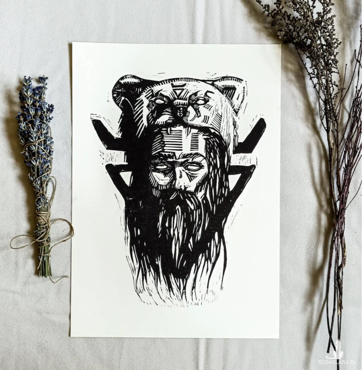 Ręcznie wykonany linoryt przedstawiający Welesa – słowiańskiego boga podziemi, magii, bogactwa i opiekuna zmarłych. Grafika ukazuje postać Welesa w symbolicznej, mrocznej i tajemniczej estetyce, podkreślając jego związek ze światem duchowym i magią natury.