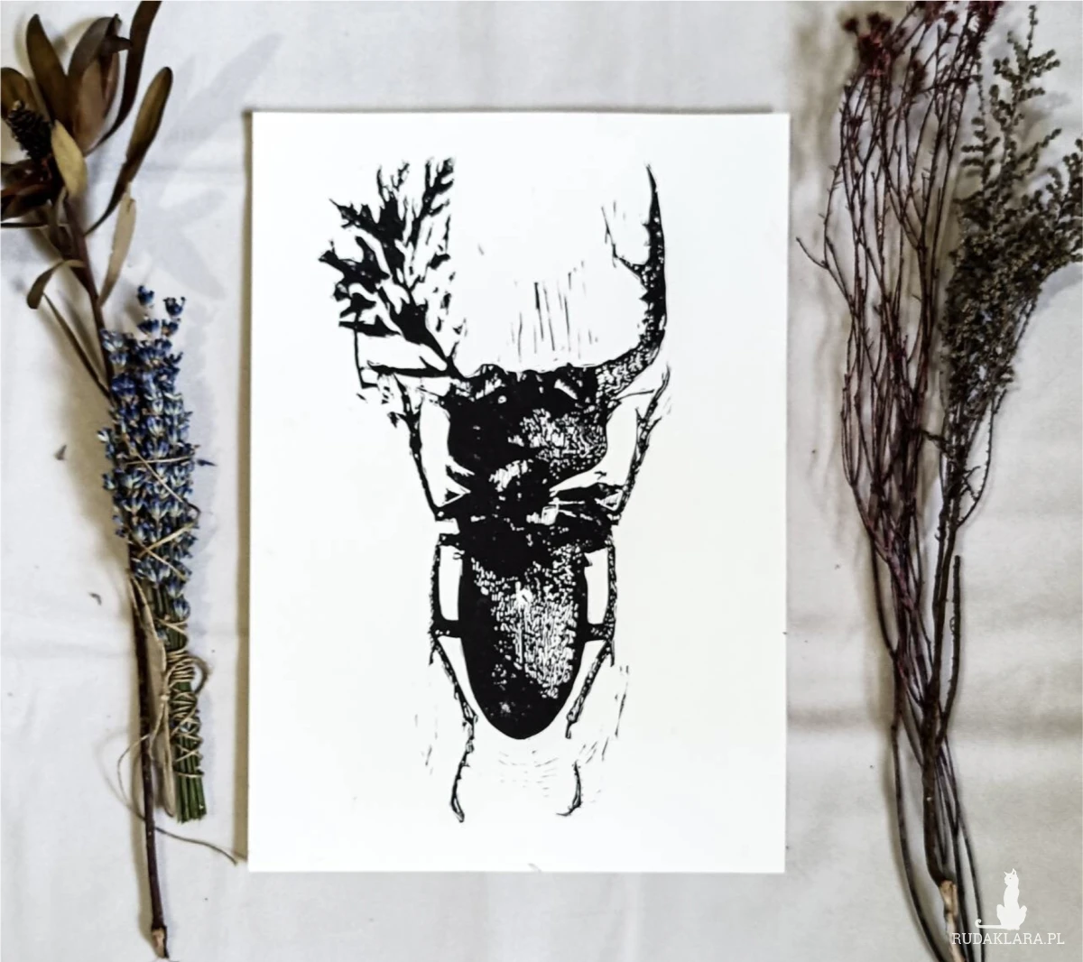 Ręcznie wykonany linoryt przedstawiający żuka – charakterystycznego, mocno zarysowanego owada, ukazanego w estetycznej, minimalistycznej i symbolicznej formie. Grafika podkreśla detale ciała żuka, jego charakterystyczną budowę i siłę, a kompozycja nadaje pracy wyrazistego charakteru.