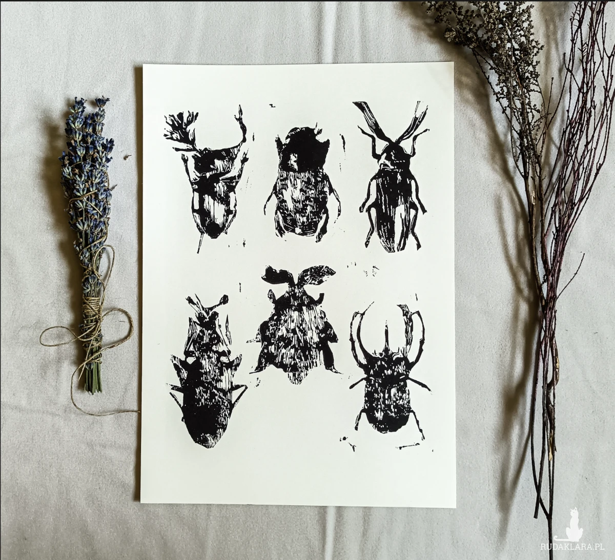 Ręcznie wykonany linoryt przedstawiający żuki – charakterystycznego, mocno zarysowanego owada, ukazanego w estetycznej, minimalistycznej i symbolicznej formie. Grafika podkreśla detale ciała żuka, jego charakterystyczną budowę i siłę, a kompozycja nadaje pracy wyrazistego charakteru.
