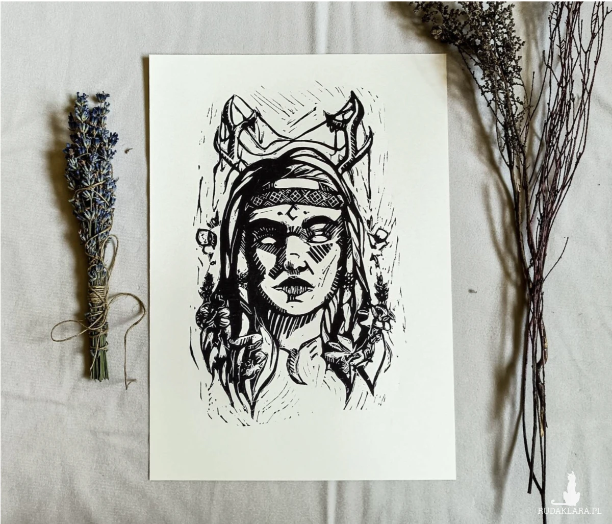 ęcznie wykonany linoryt przedstawiający Dziewannę – słowiańską boginię dzikiej przyrody, lasów, łowów i niezależności. Grafika ukazuje postać bogini w symbolicznej, artystycznej formie, podkreślając jej związek z naturą, wolnością i pierwotną siłą świata. Kompozycja łączy w sobie mistyczny klimat z ludową estetyką inspirowaną wierzeniami słowiańskimi.