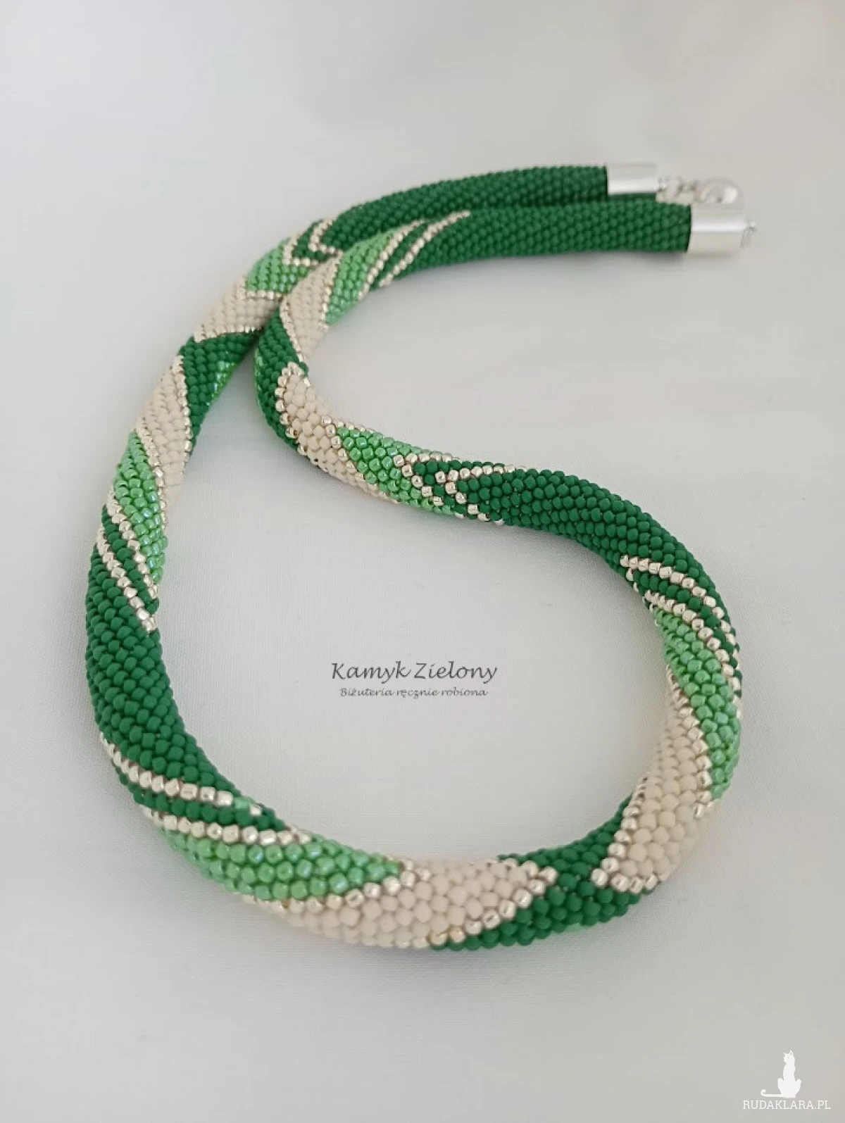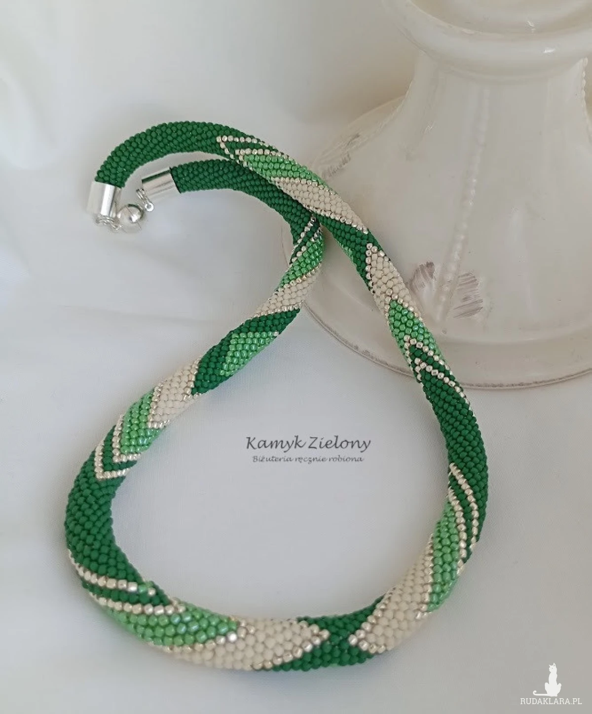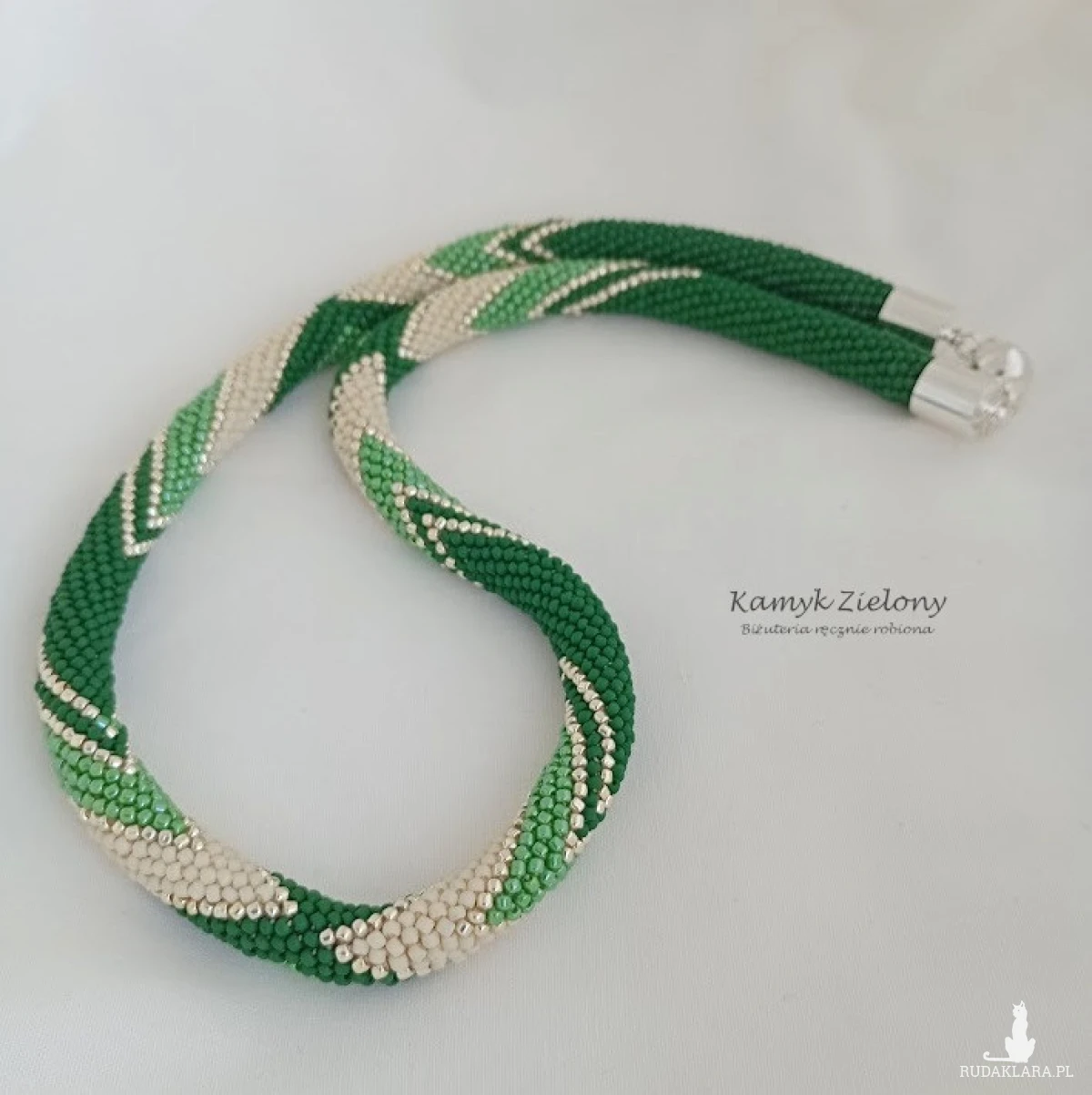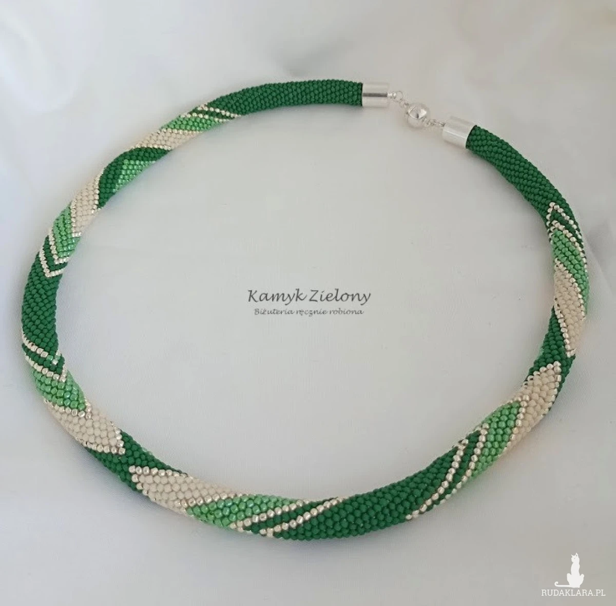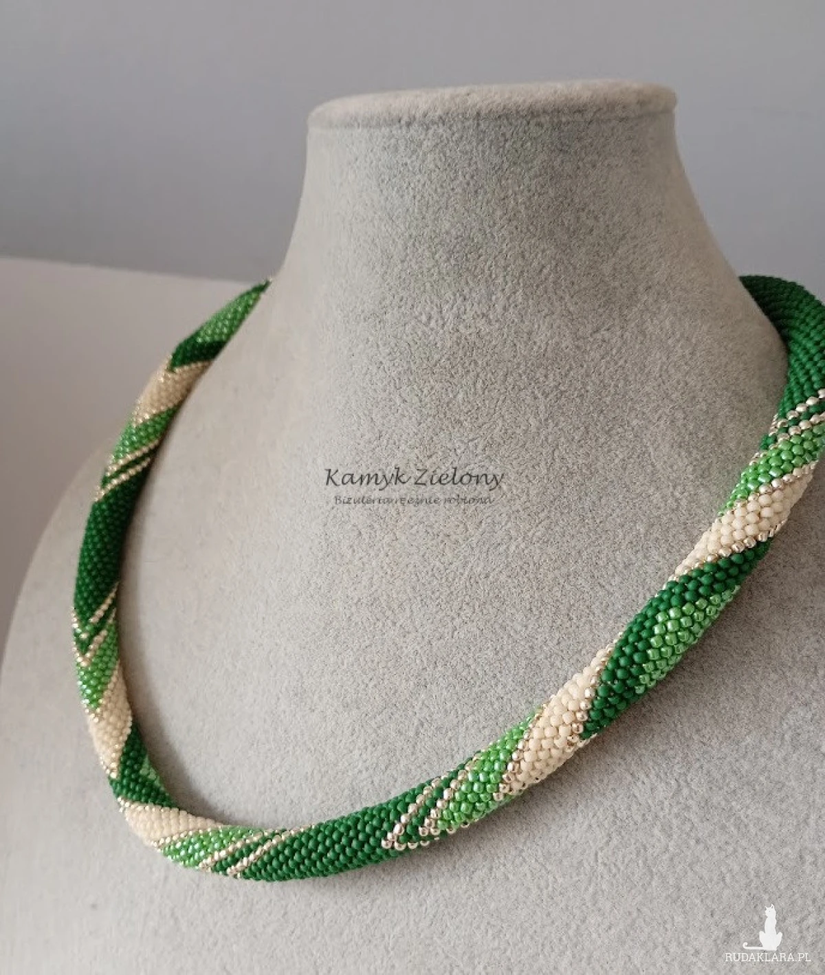 Powstał przy zastosowaniu pracochłonnej techniki sznura koralikowego-szydełkowego, w której każdy koralik obrabiany jest szydełkiem osobno, dzięki czemu powstaje wytrzymały sznur koralikowy. Koraliki w nim ułożone są równiutko, a sznur jest niezwykle plastyczny i ładnie układa się na szyi.