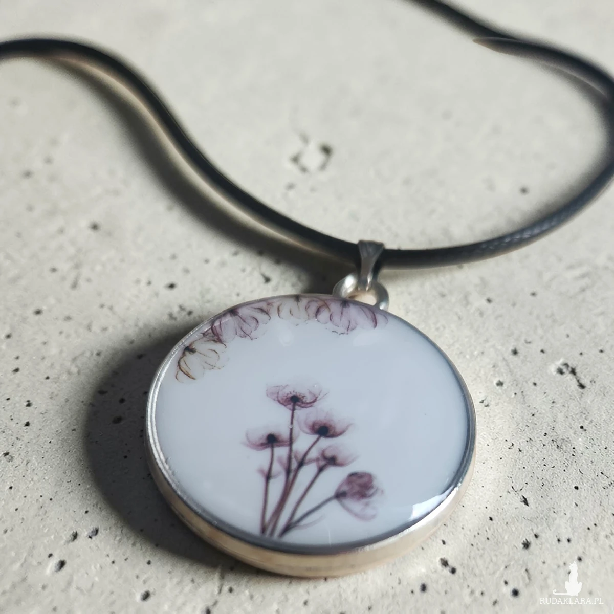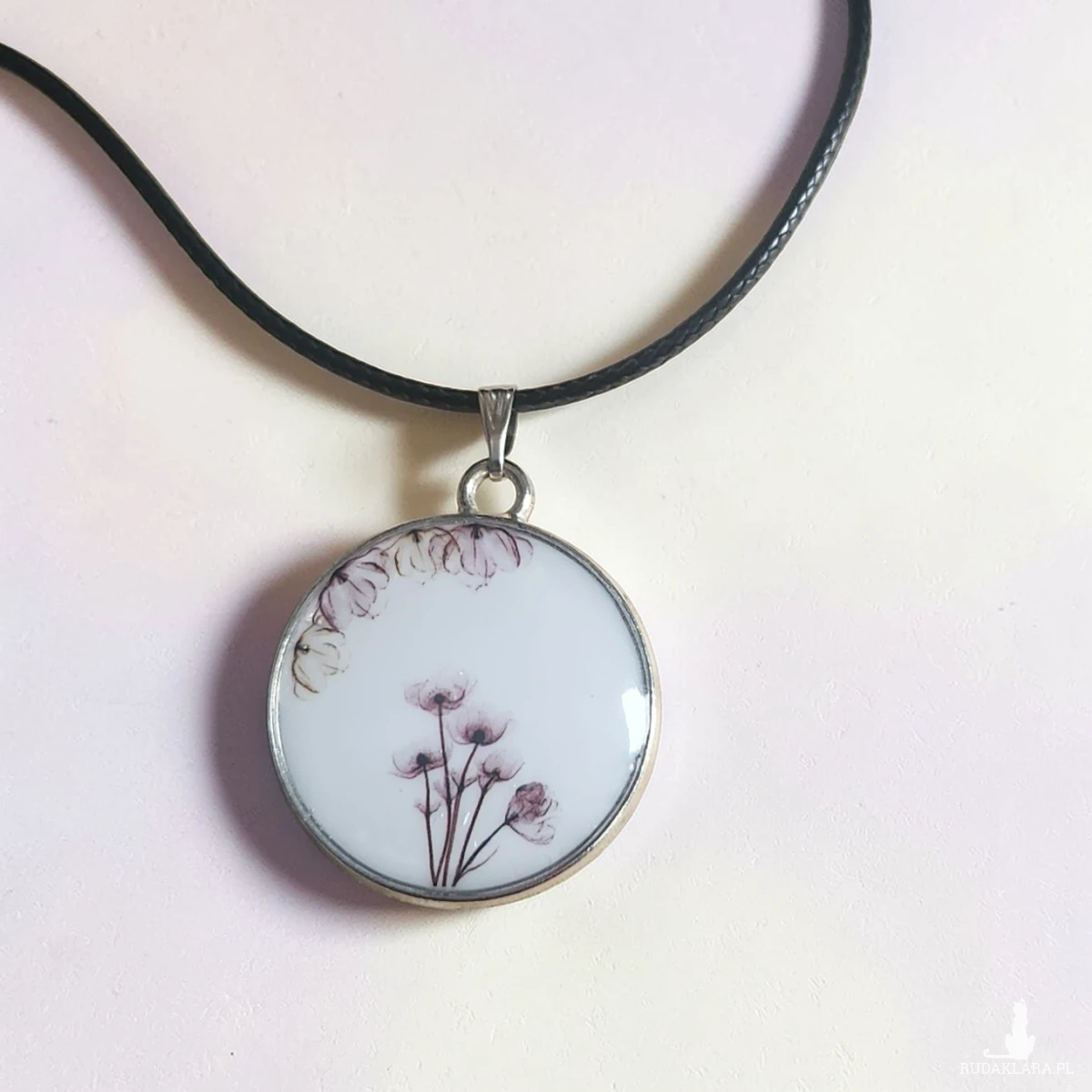 Naszyjnik: Większy wisior z rozbudowaną kompozycją kwiatową, zawieszony na klasycznym, czarnym rzemyku.