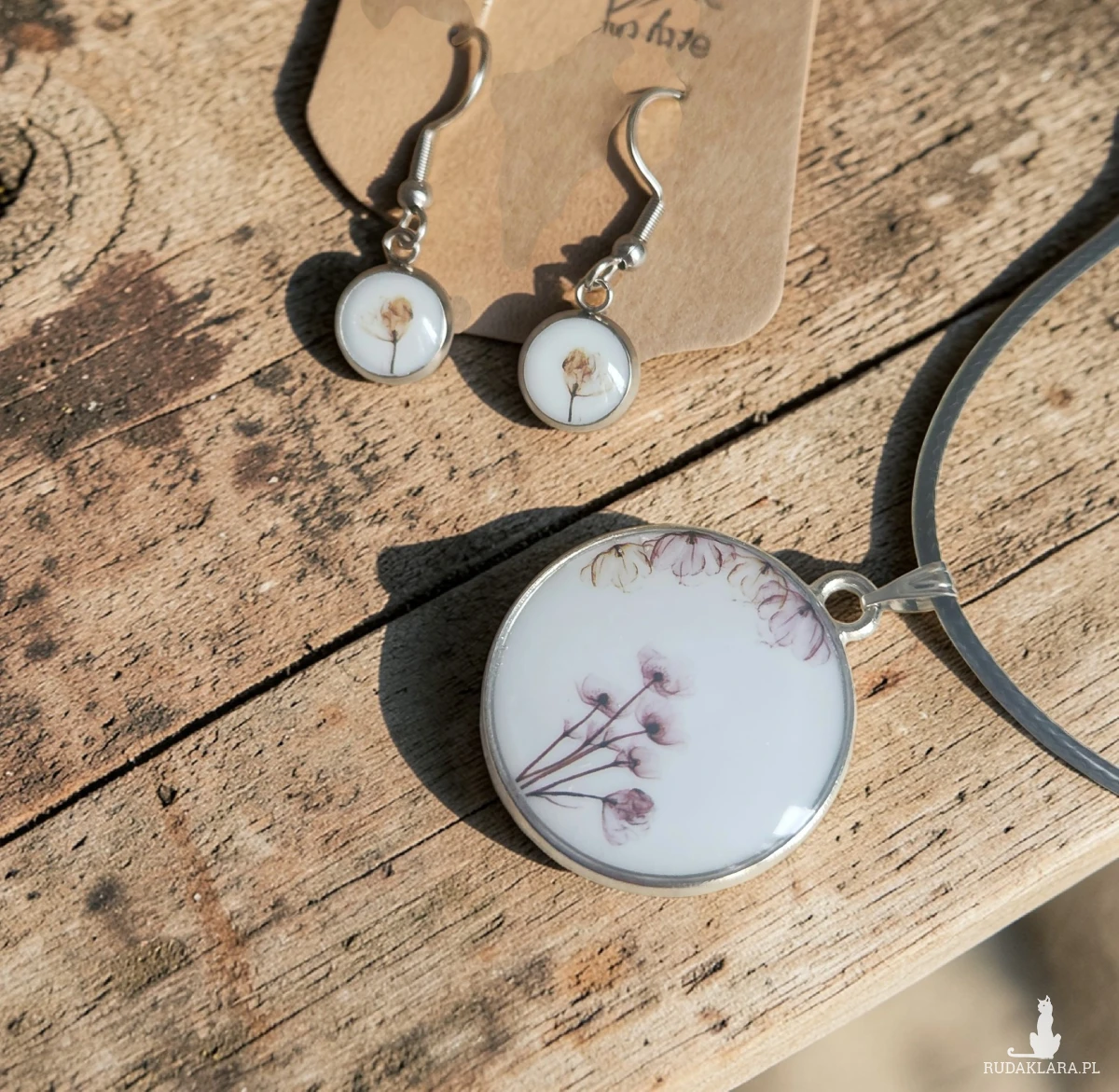 Przedmiotem sprzedaży jest elegancki, ręcznie wykonany zestaw biżuterii z motywem florystycznym. Połączenie krystalicznej żywicy z precyzyjną grafiką kwiatową tworzy efektowną i trwałą ozdobę, idealną do codziennych stylizacji oraz na specjalne okazje.