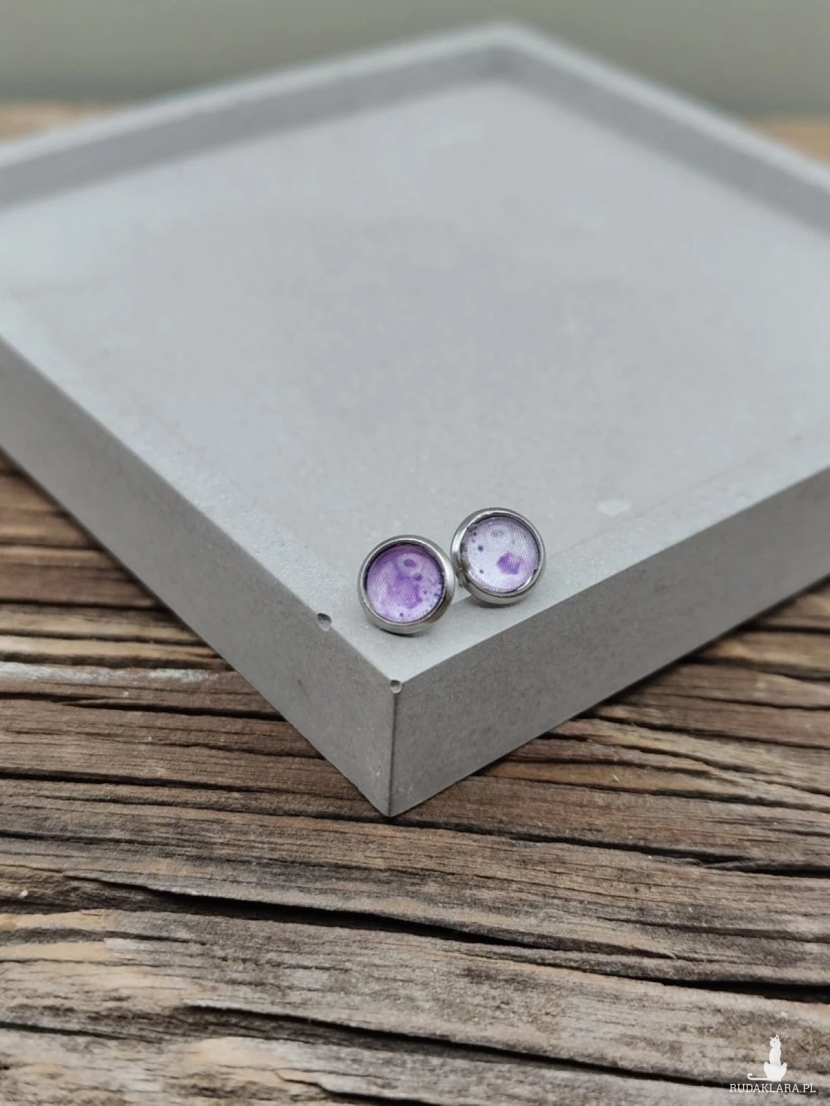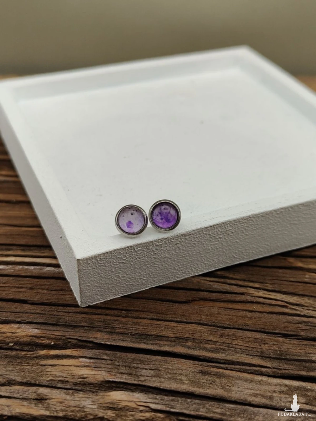 Subtelne, a jednocześnie przyciągające spojrzenia kolczyki sztyfty z unikatowym wzorem inspirowanym kosmiczną mgławicą. Delikatne odcienie fioletu, lawendy i śliwki tworzą niepowtarzalną kompozycję, dzięki czemu każda para jest jedyna w swoim rodzaju. Minimalistyczna forma sprawia, że kolczyki doskonale uzupełniają zarówno codzienne stylizacje, jak i bardziej eleganckie zestawy, dodając im artystycznego charakteru i nuty tajemniczości.