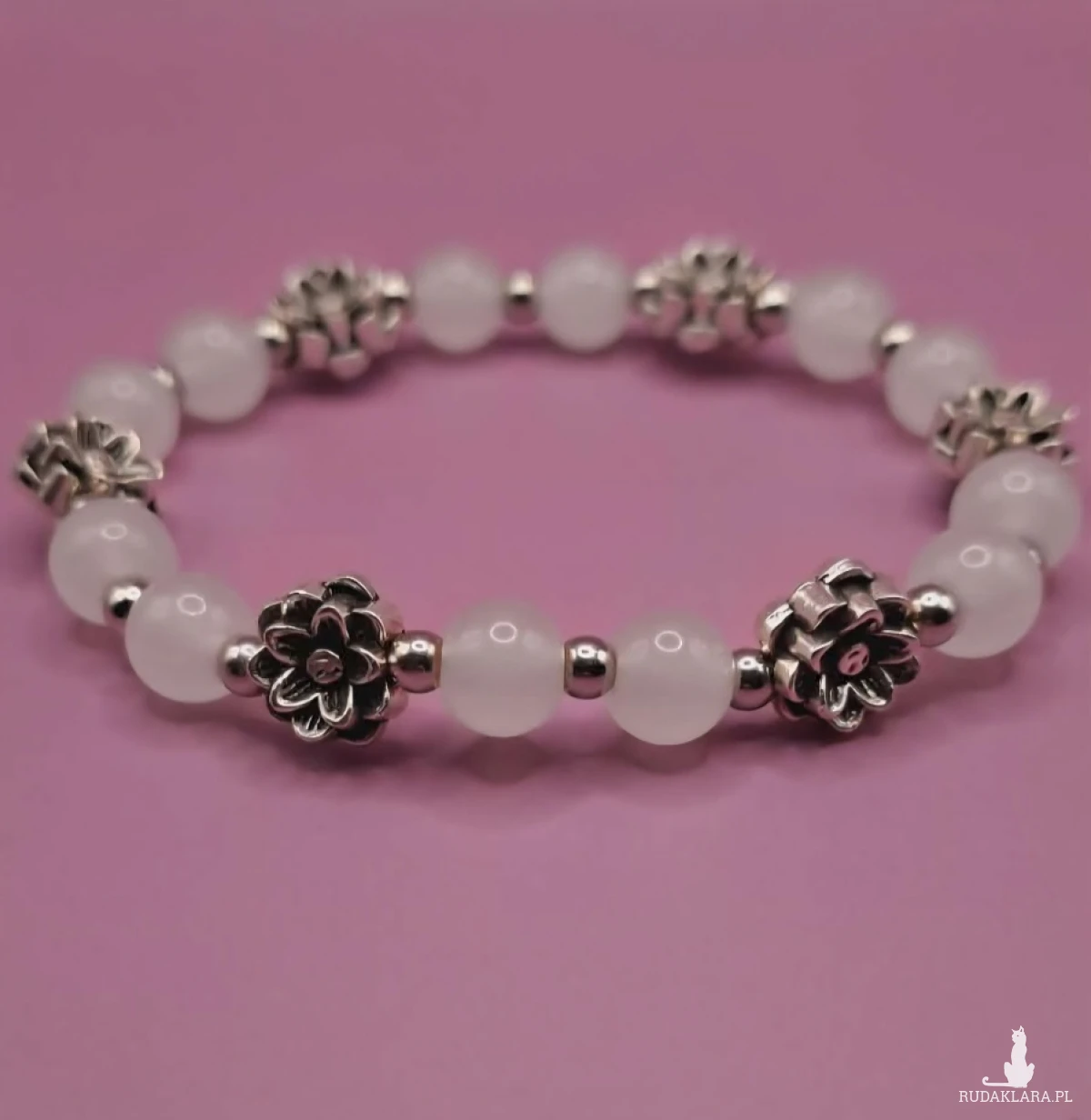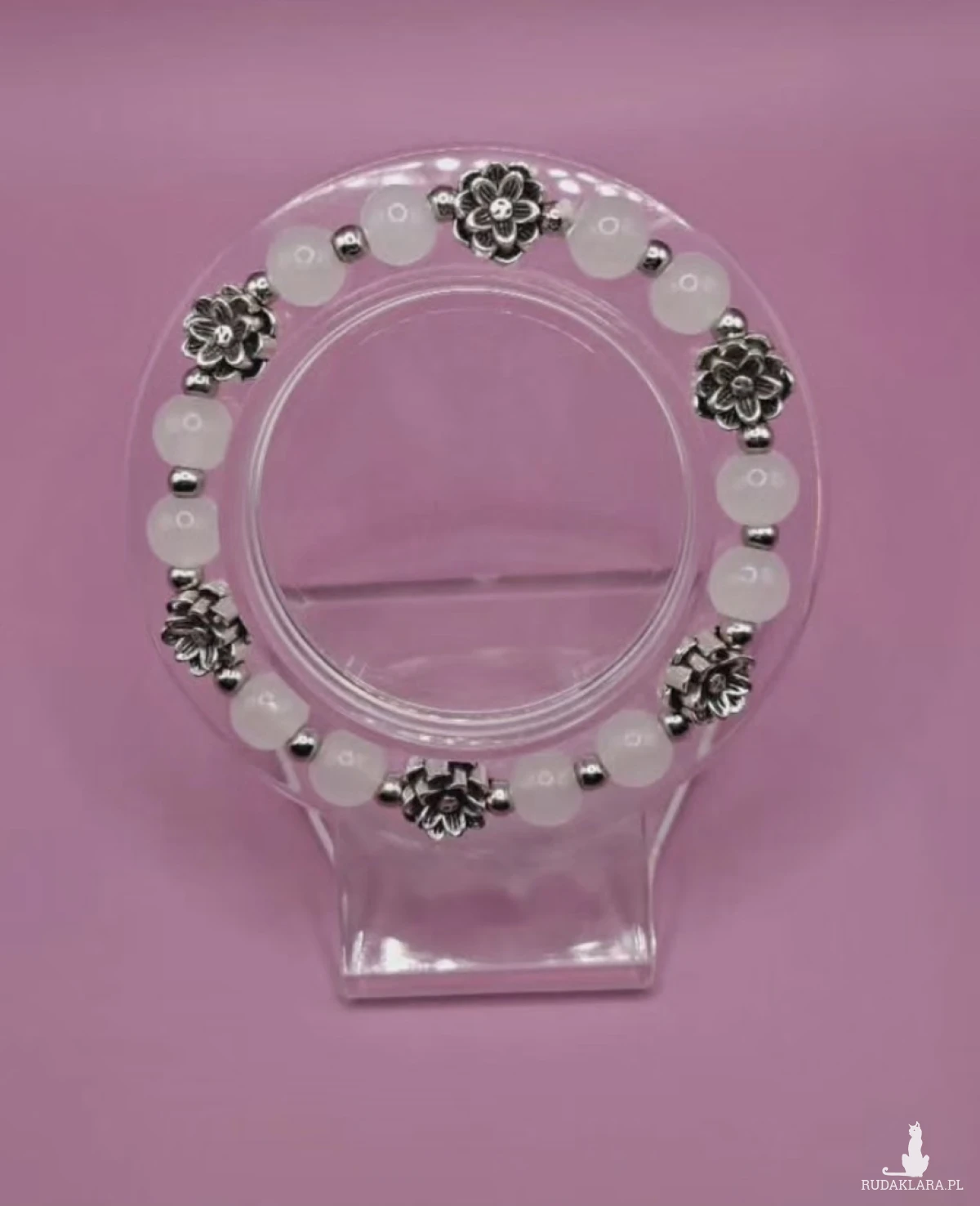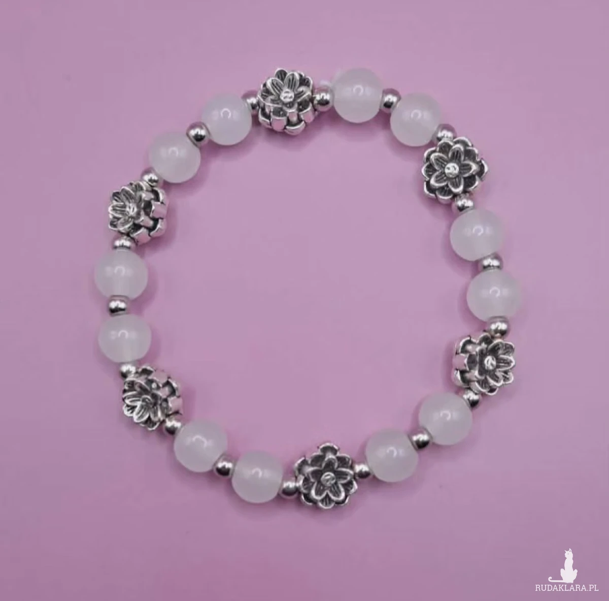 Zapraszam do zakupu wyjątkowej, ręcznie wykonanej bransoletki, która łączy w sobie delikatność białych koralików z eleganckimi akcentami w kształcie kwiatów. To idealny dodatek dla osób ceniących styl romantyczny, boho lub minimalistyczny.
