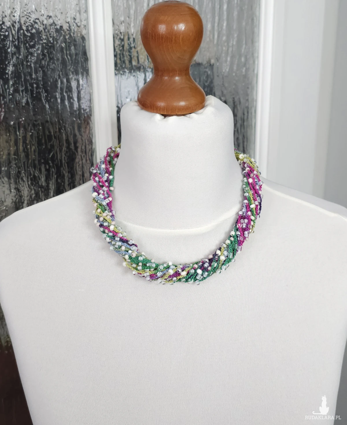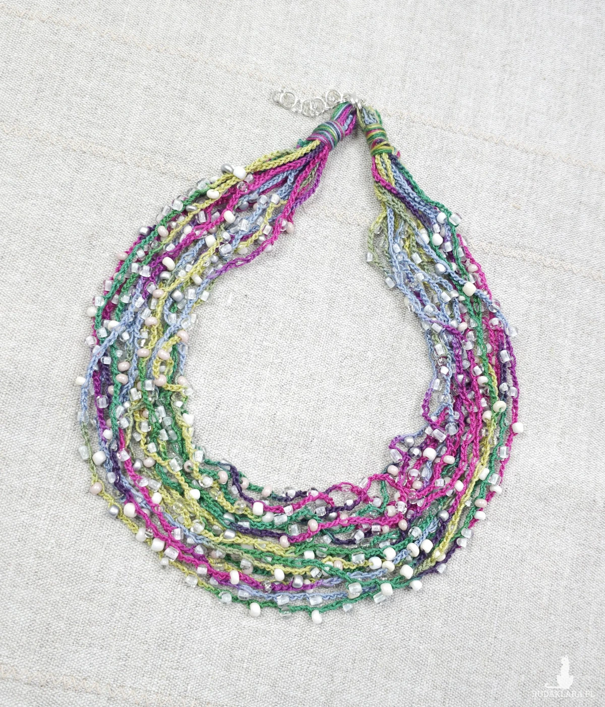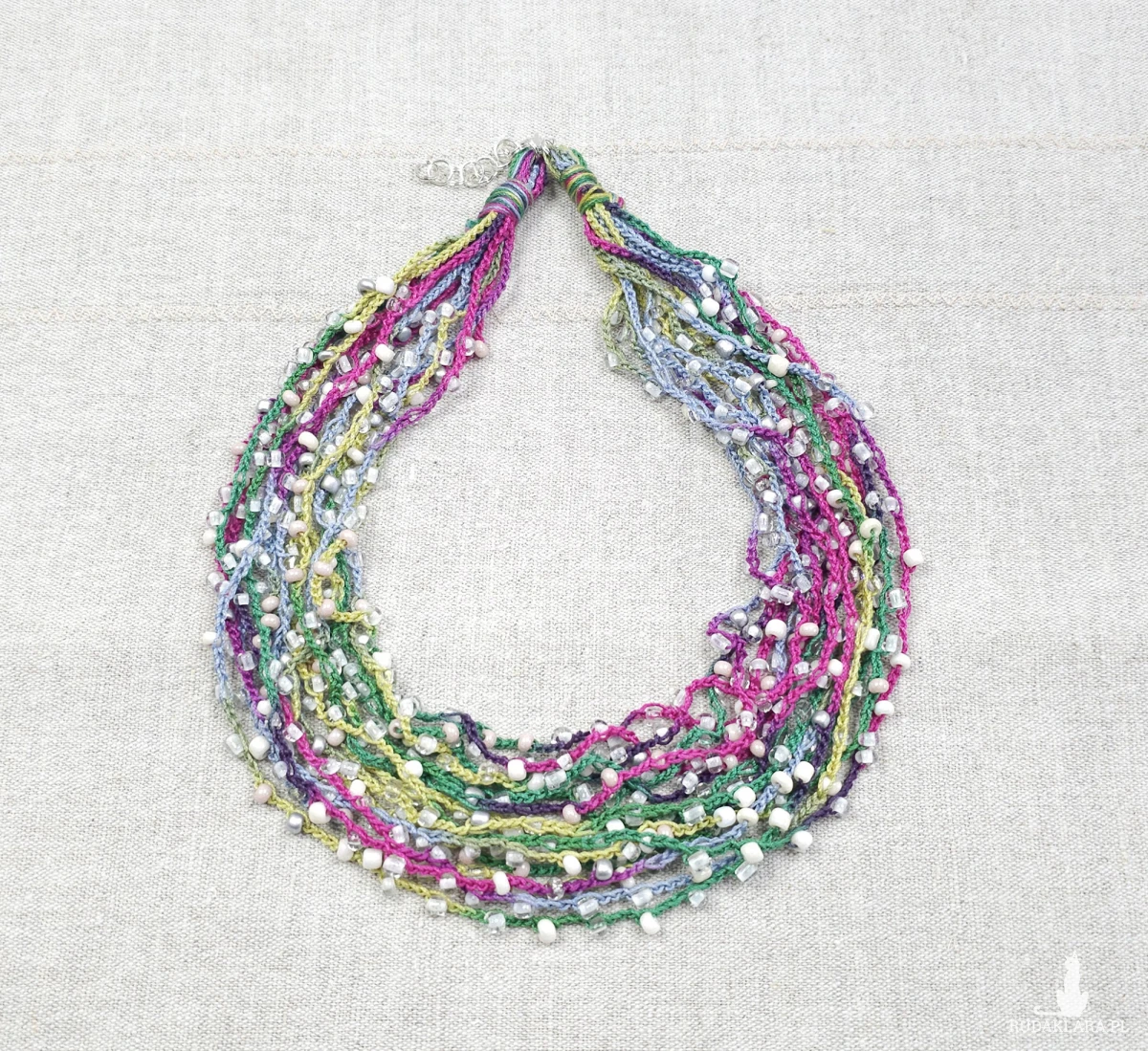 Lekki, kaskadowy naszyjnik wykonany z wielu rzędów bawełnianych nitek, na które misternie nawleczono drobne szklane koraliki. Całość tworzy subtelną, barwną strukturę o artystycznym wyrazie.