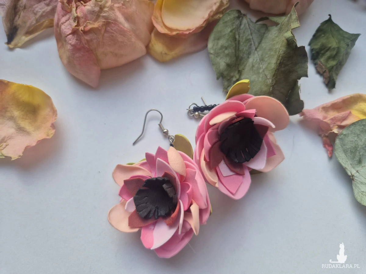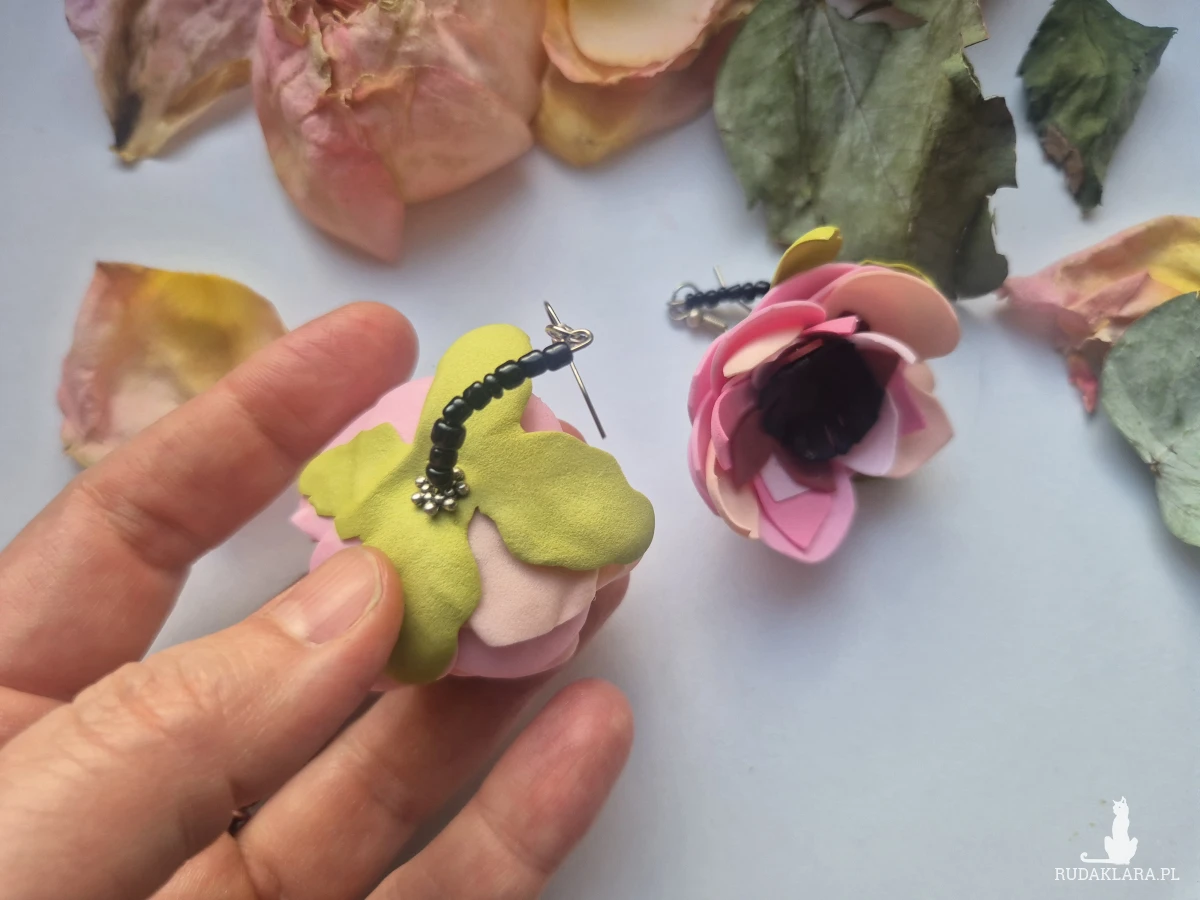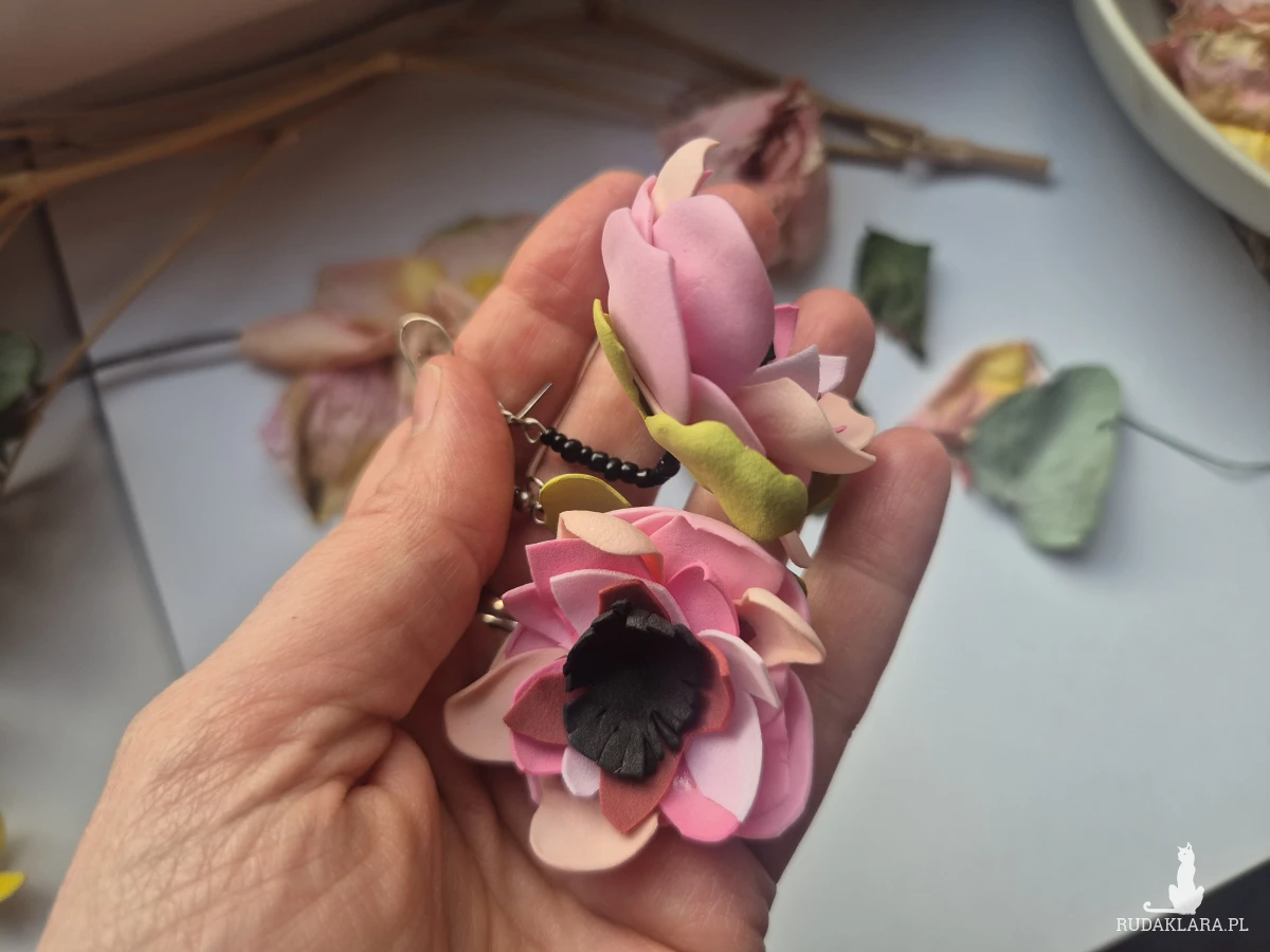 Kolczyki leciutkie kwiaty różowo zielone wykonane w pojedynczym egzemplarzu rękodzieło polecam