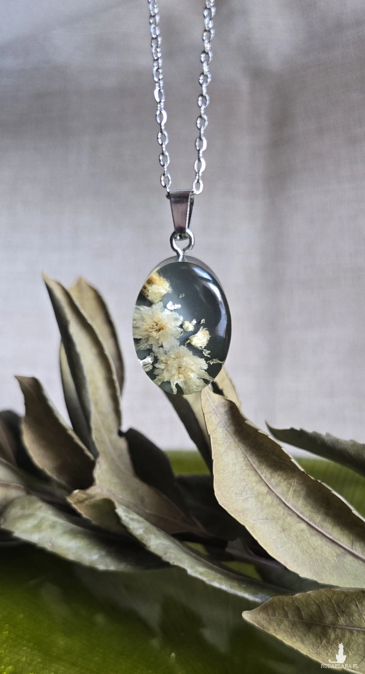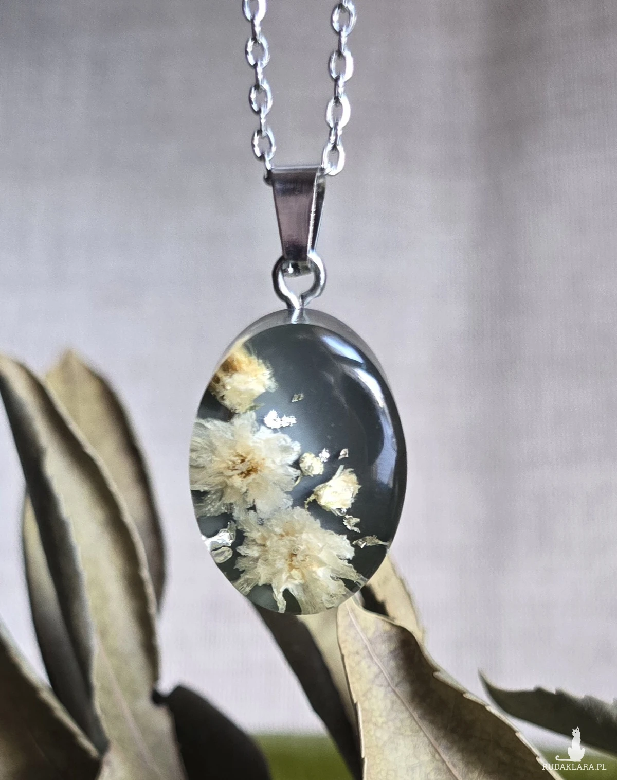 Oferuję Państwu unikalną biżuterię. Zawieszka jest wykonana z suszonych kwiatów i żywicy epoksydowej. Biżuteria jest wspaniałym i oryginalnym prezentem na lata.