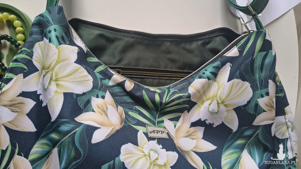 Wewnątrz mamy wodoodporną podszewkę w ciemno zielonym kolorze, kieszonkę na zamek oraz otwartą kieszonkę.