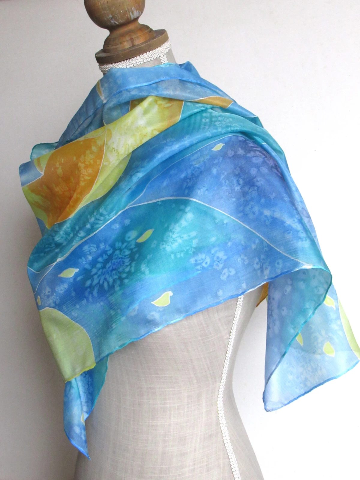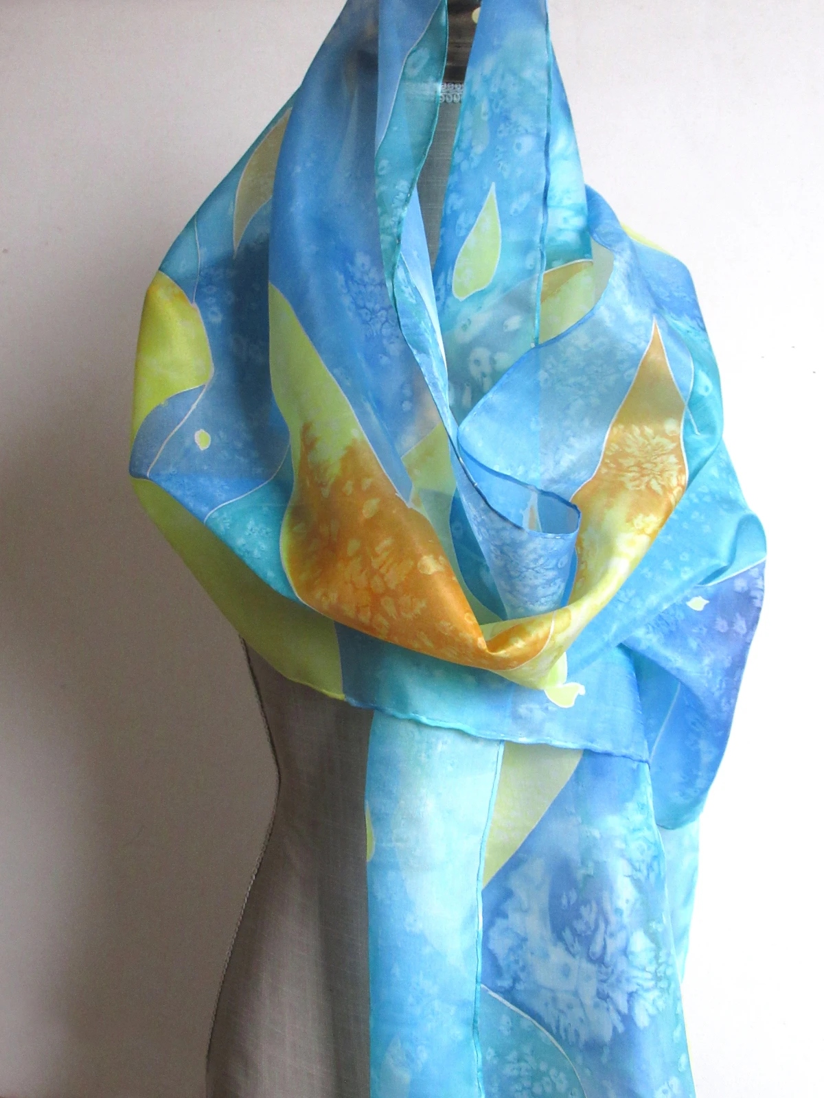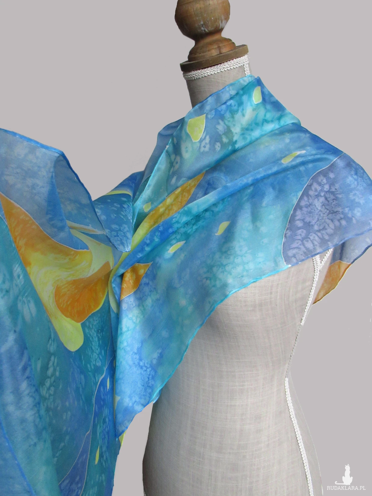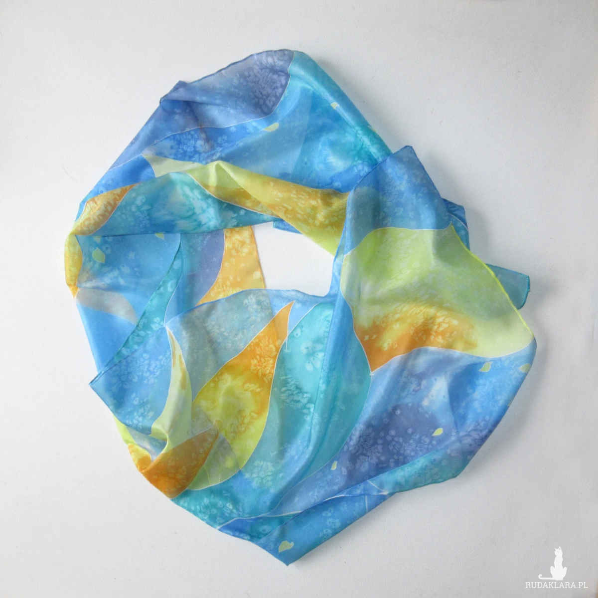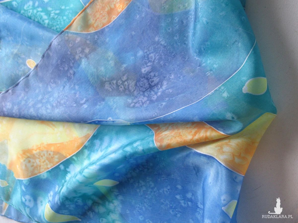 Błękitno-fioletowy szal z dodatkiem żółci i oranżu z naturalnego jedwabiu. Ręcznie malowany.