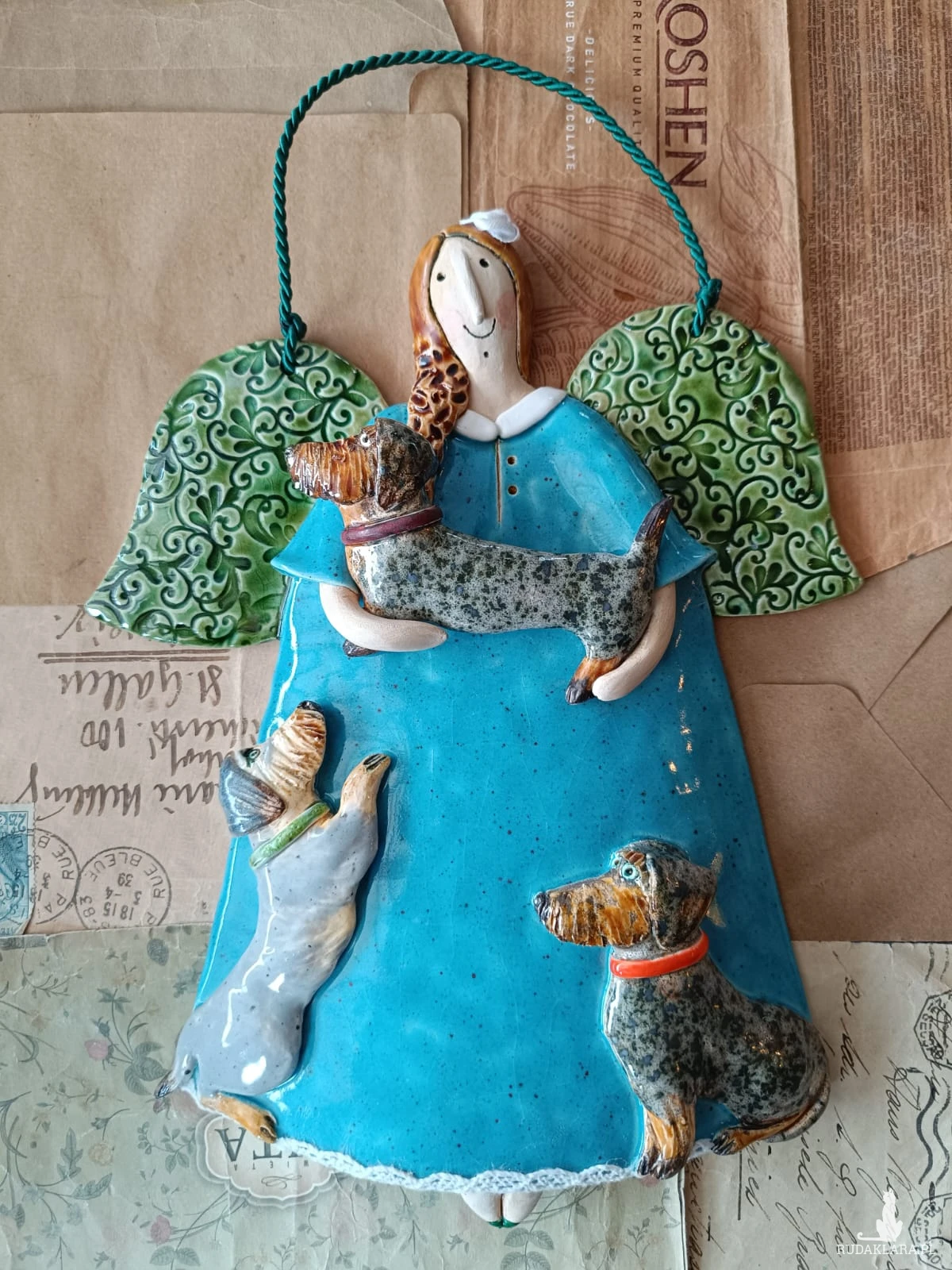 Uroczy aniołek ceramiczny wykonany z gliny szamotowej, wypalony na biskwit, a następnie szkliwiony w temperaturze 1260 stopni C. Wymiary ok 18,5 cm x 24,5 cm. Do powieszenia na ścianie na ozdobnym sznureczku. Idealny jako prezent okolicznościowy lub do ozdoby domu.