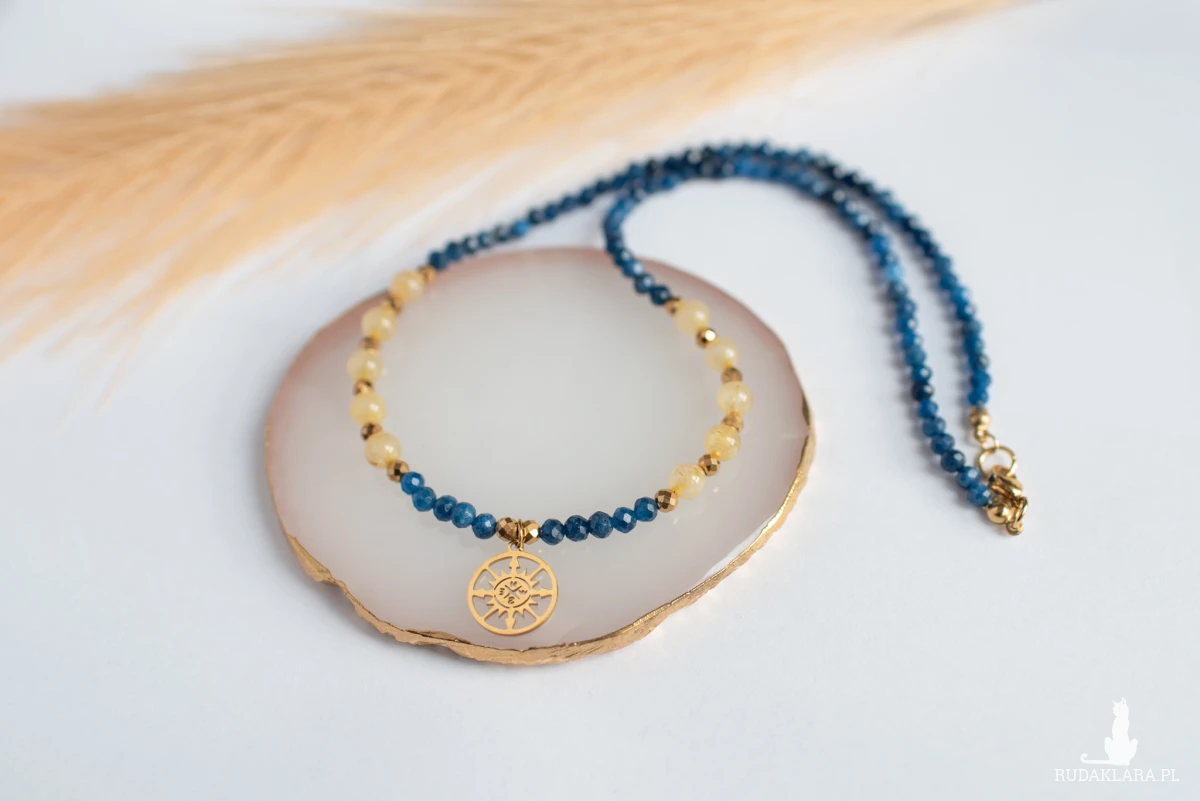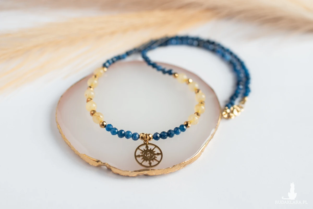 Naszyjnik, który może być Twoim osobistym talizmanem: harmonijne połączenie minerałów o kontrastujących barwach, zwieńczone symboliczną zawieszką w kształcie róży wiatrów.