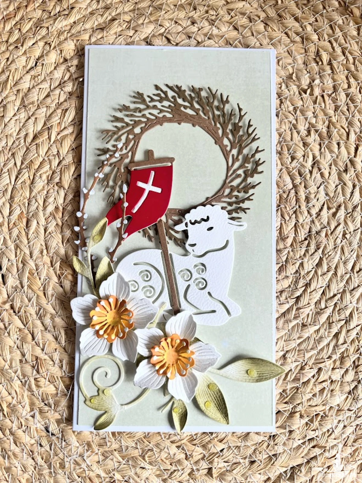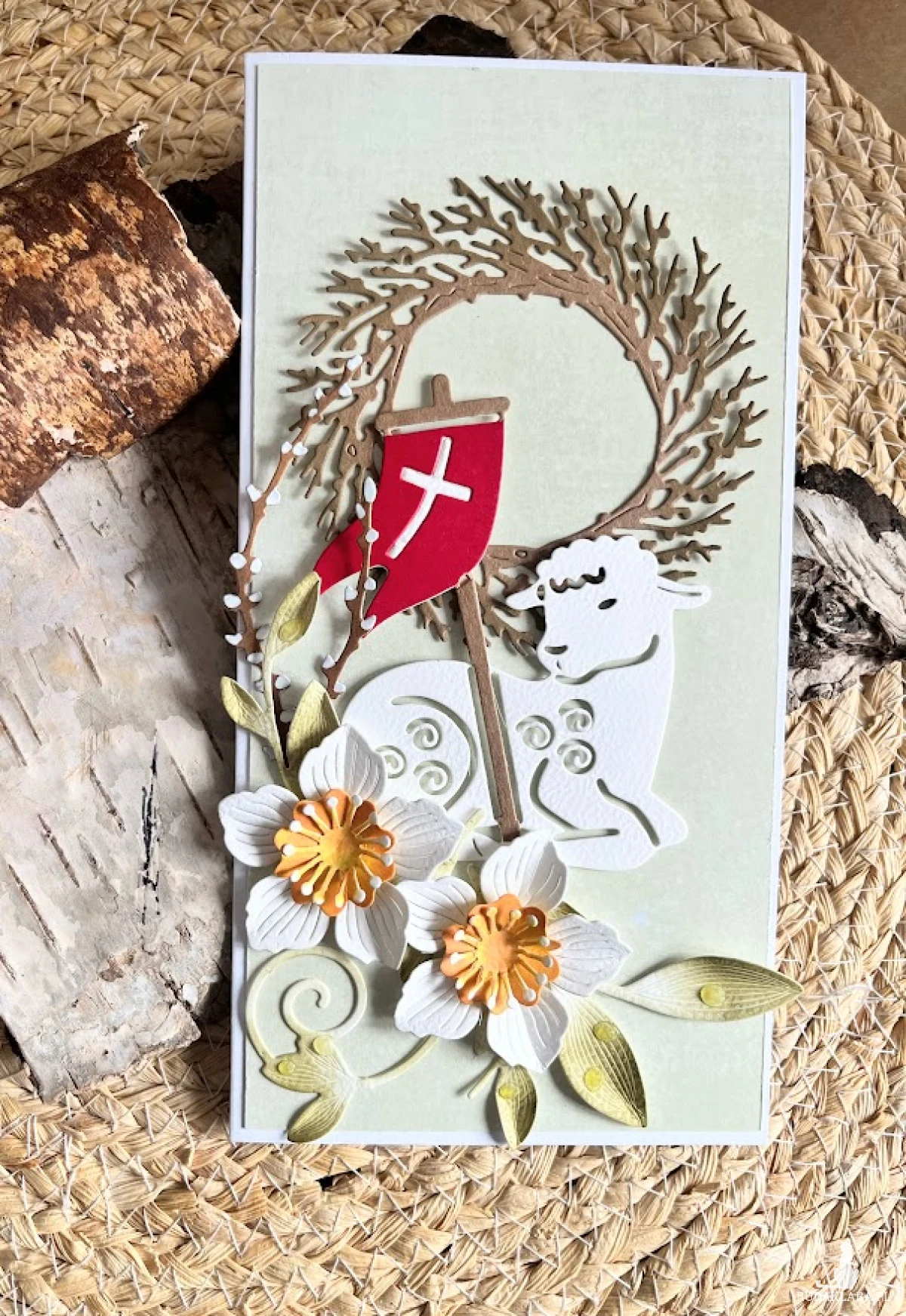 Kartka wielkanocna z barankiem. Kartka wykonana na białej bazie .Przewodnim motywem jest baranek na tle gałązkowego wianka i bazi oraz ręcznie robione żonkile. Wielkość kartki to 10,5x21cm. Do kartki dołączono białą kopertę o wym 11x22 cm.