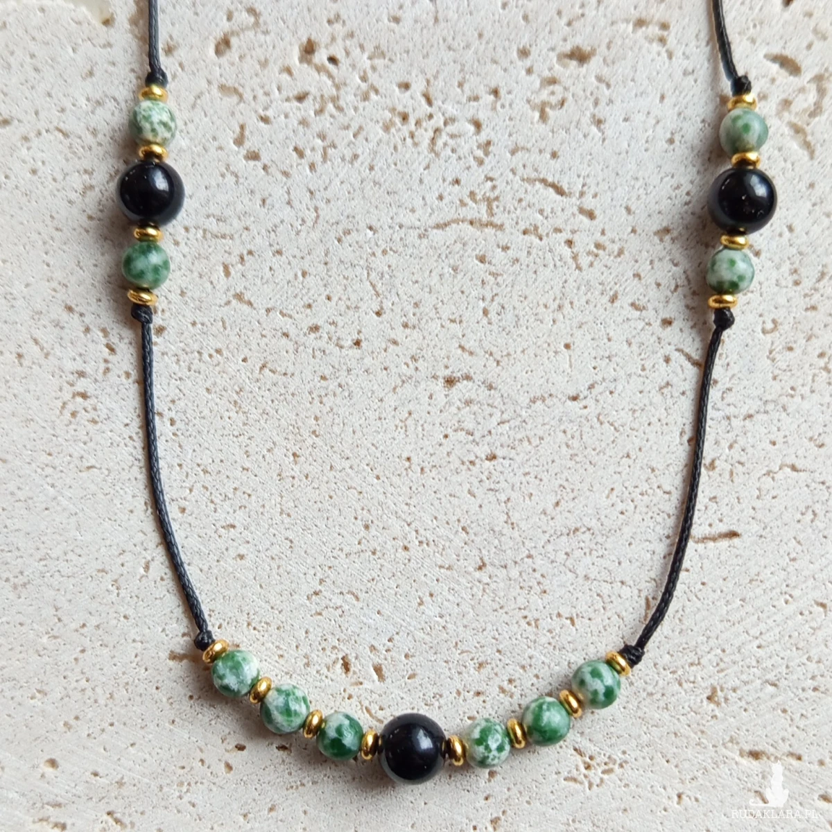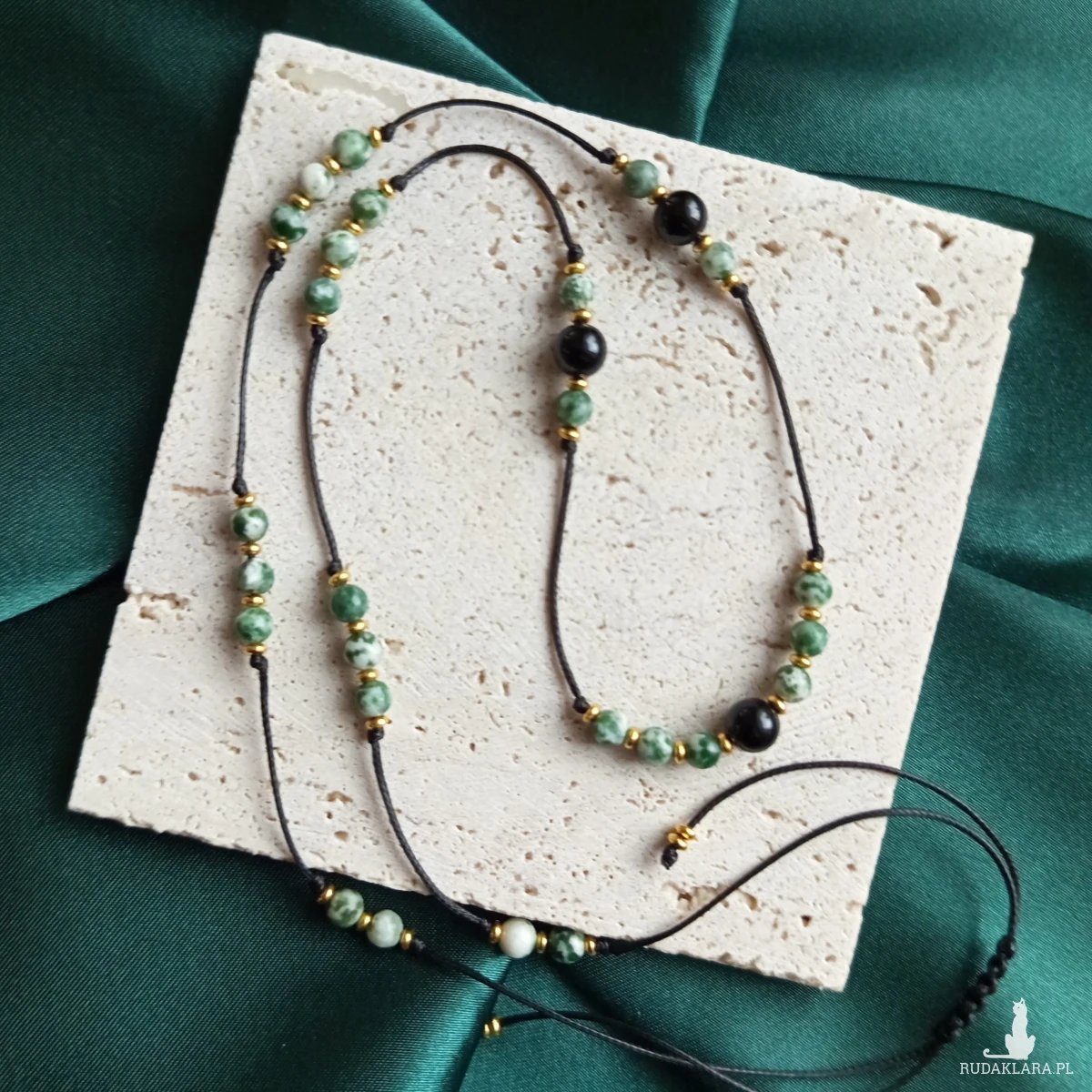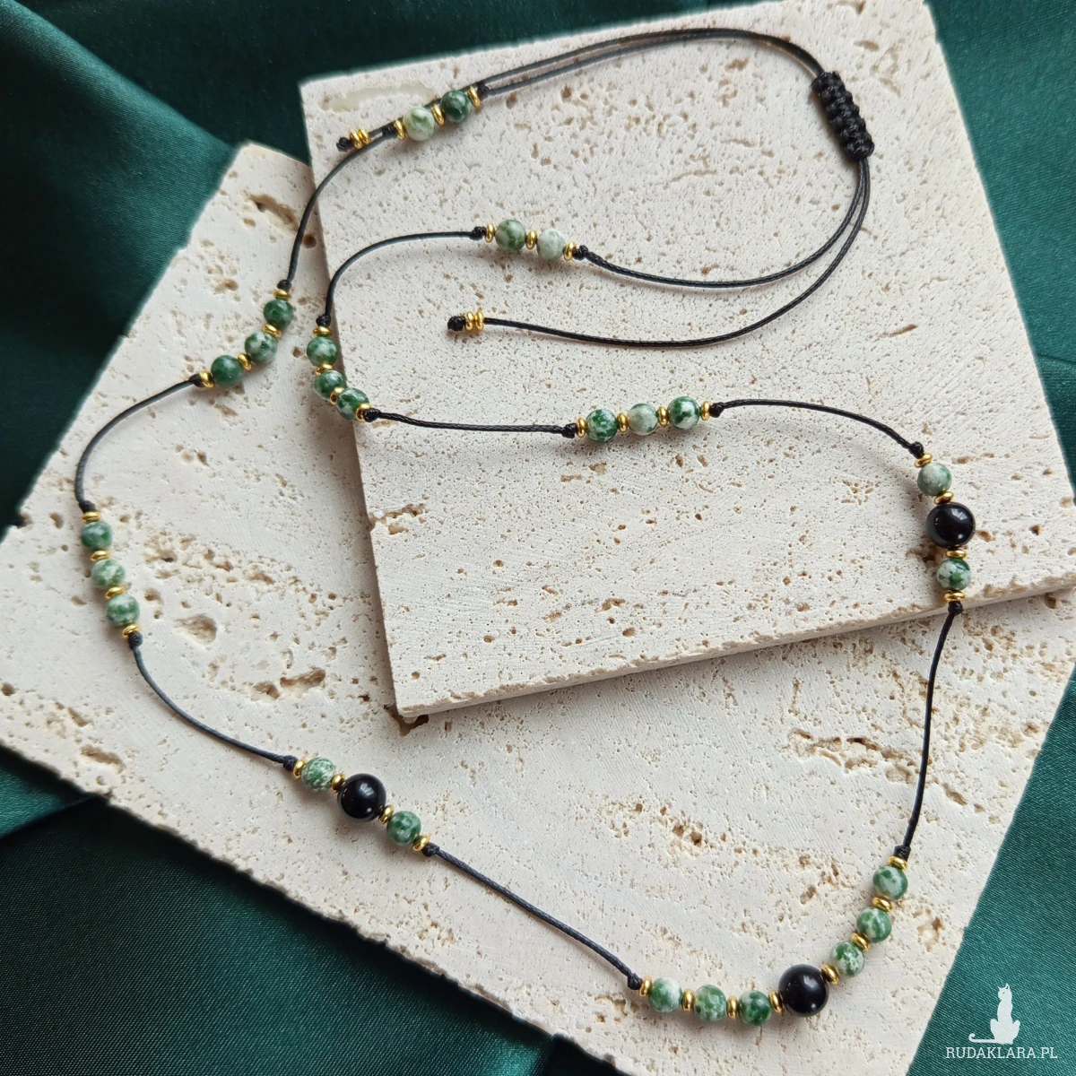 Naszyjnik "Roxi" - wykonany z kamieni naturalnych i mocnego sznurka jubilerskiego. Regulacja za pomocą plecionki makramowej. Długość całkowita 60 cm + 2x5 cm regulacji. Elegancki i niepowtarzalny, stworzony w pojedynczym egzemplarzu.